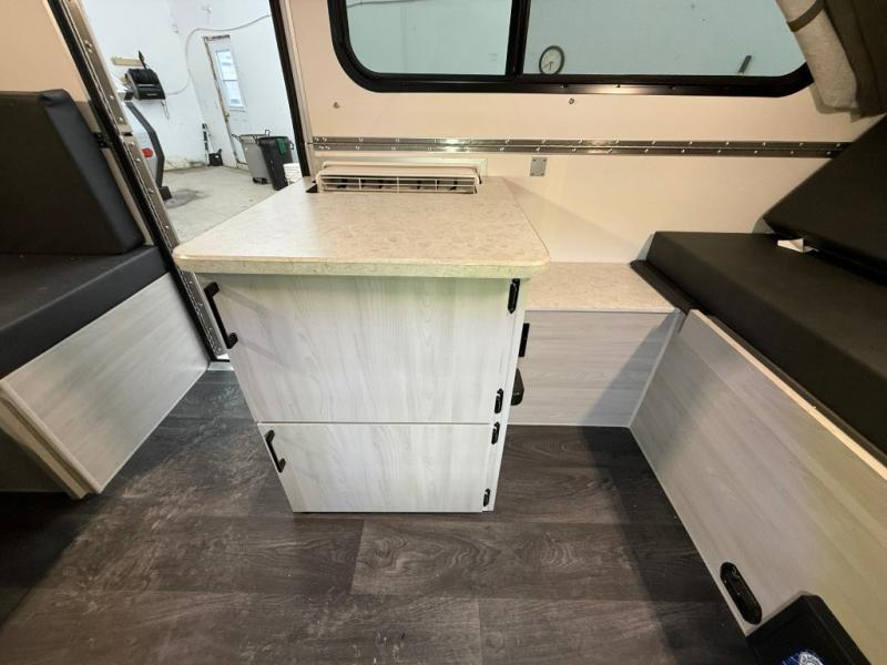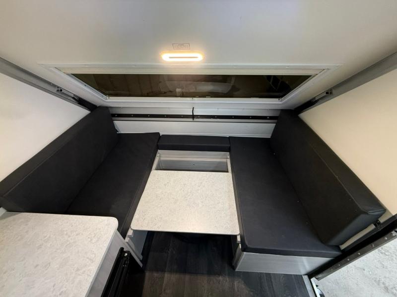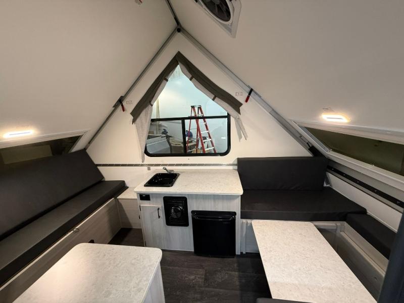 Get ready to sleep above ground as you upgrade from tent camping to this A-frame camper! It is easy to tow, set up and store when the fun is over. Inside you will find ample storage for your gear, a dinette to dine at when you aren't outside, and a sofa bed to relax on before bedtime. The dinette converts to a 46" x 76" bed, and the rear sofa converts to a 56" x 76" bed. There are three electrical outlets inside to keep your phone and camera charged, and the LED lights will help keep your space well lit. An optional 1.7 cu. ft. 12V refrigerator can be added, along with an optional side-mount A/C unit and optional 200-watt solar panel for added convenience!