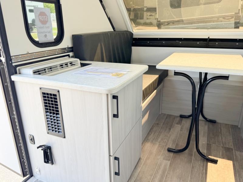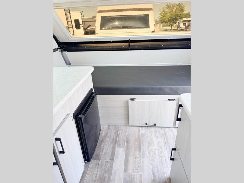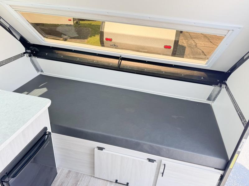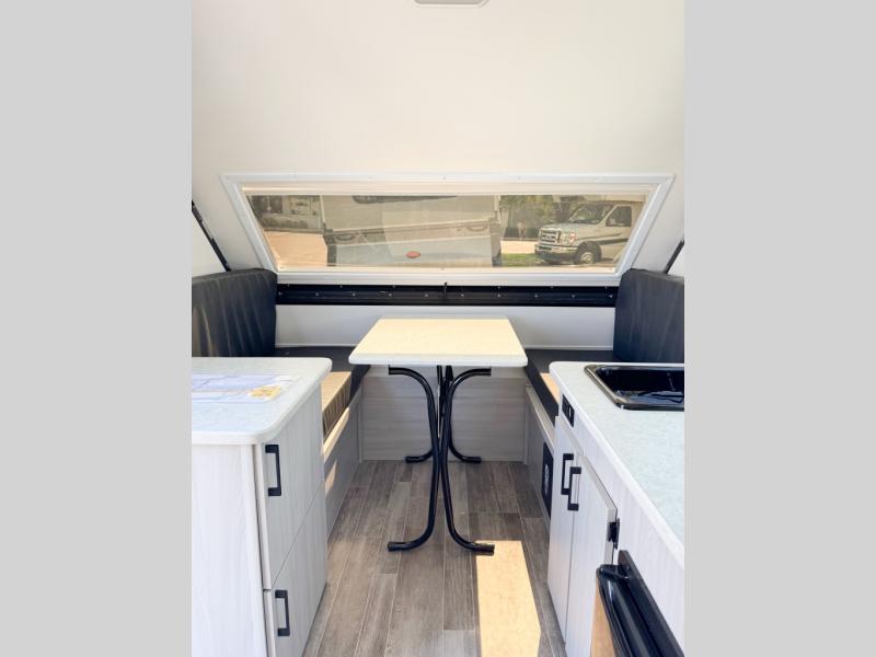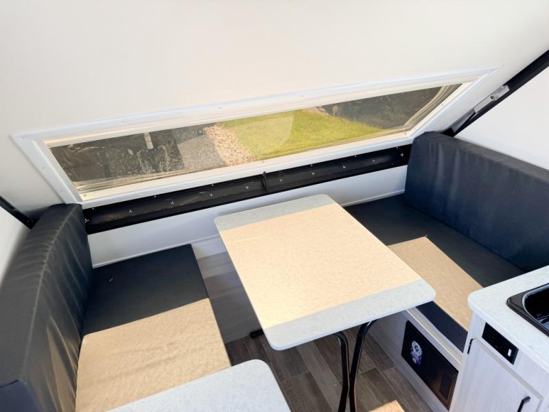 When all you need is the basics to camp because you prefer to be outdoors hiking and exploring, this Scout Lite will be perfect for you! There is sleeping space on either the front 30" x 76" bunk or the rear dinette which converts into a 40" x 76" bed. There is plenty of storage throughout between the storage under the dinette seats, a storage area across from the sink, and storage next to the sink. And you can keep everything charged with the two electrical outlets inside and the one exterior electrical outlet!