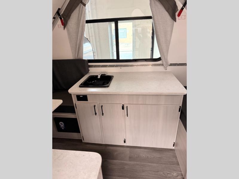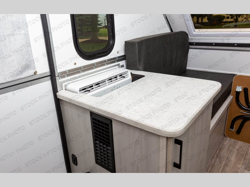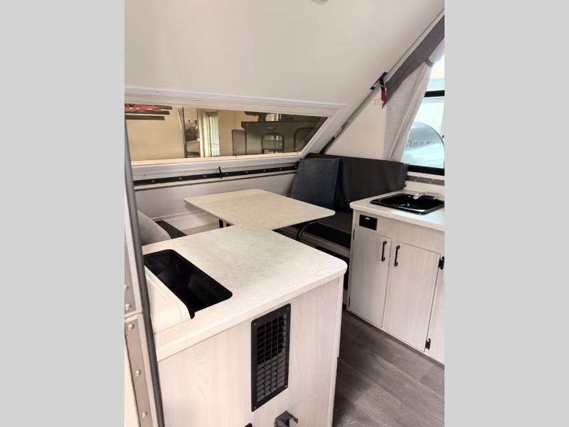 With the Scout Lite A-frame camper by Aliner, the construction includes Azdel composite roof/sidewalls, aluminum wheels, and a 5" tubular steel frame for added durability. This camper is the lightest in its class, weighing only 1,190 lbs., providing an easy tow! You'll love the Mirage Gray blackout curtains inside, along with Shalestone countertops and 5/8" thick Euro style cabinet doors. There is also a water shield to prevent standing water from wicking, and the Fantastic will keep fresh air moving. Available options include a front soft dormer, a 6,000 BTU side-mount A/C, and a 1.7 cu. ft. 12V refrigerator if you want to further customize your camper!