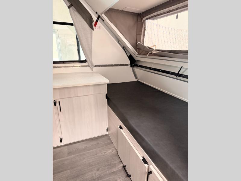When all you need is the basics to camp, this Scout Lite will be perfect for you! There is sleeping space on either the front 30" x 76" bed or the rear dinette which converts into a 56" x 76" bed. There is plenty of storage throughout between the storage under the front bed, under the sink, and the exterior baggage door. And you can keep everything charged with the two electrical outlets inside and the one exterior electrical outlet!
