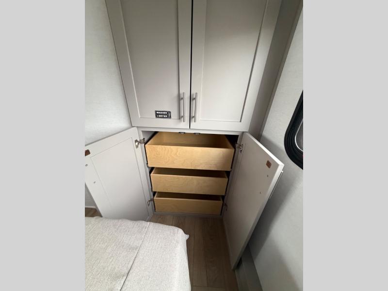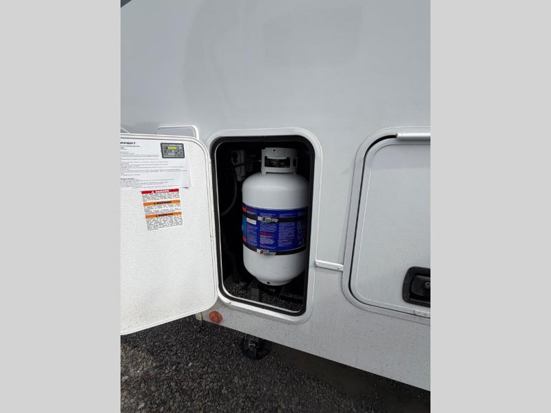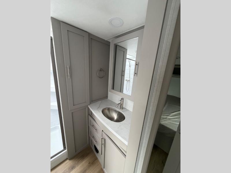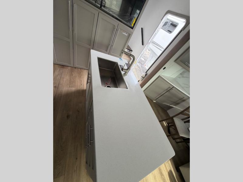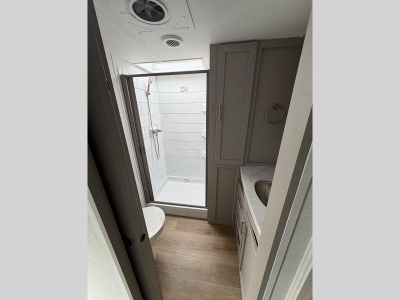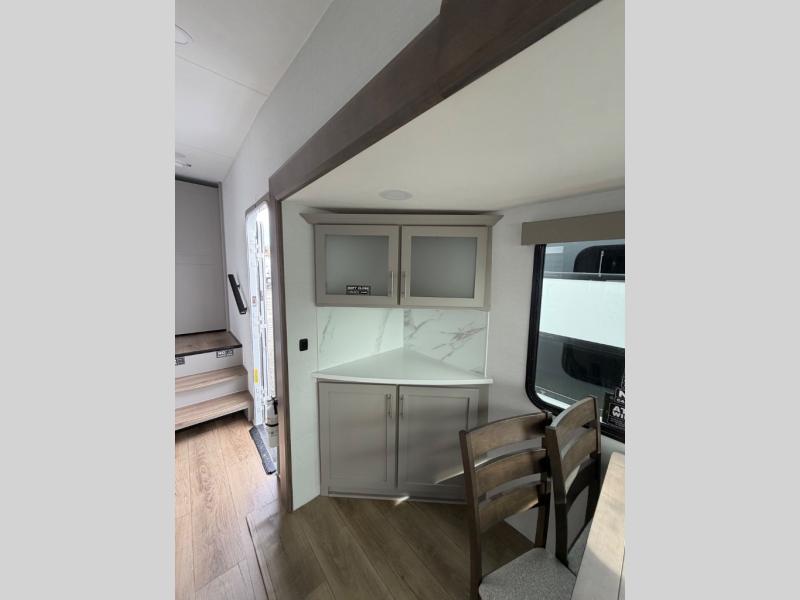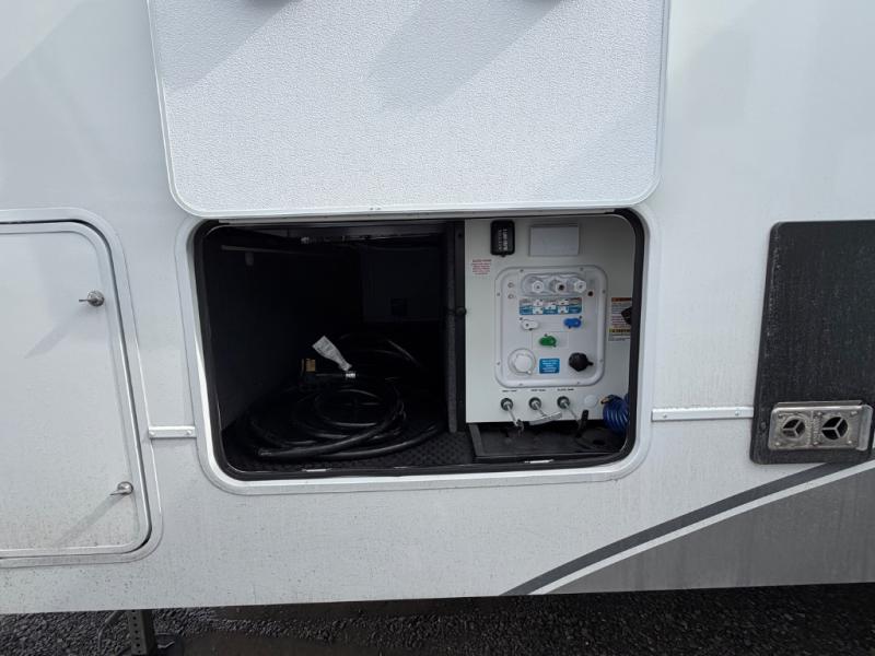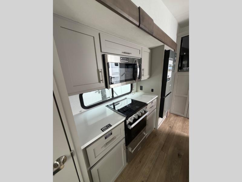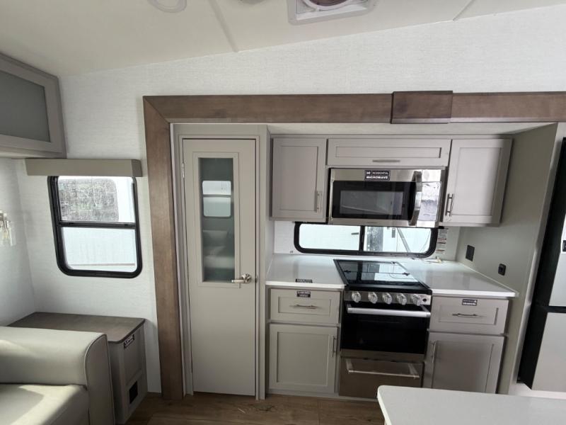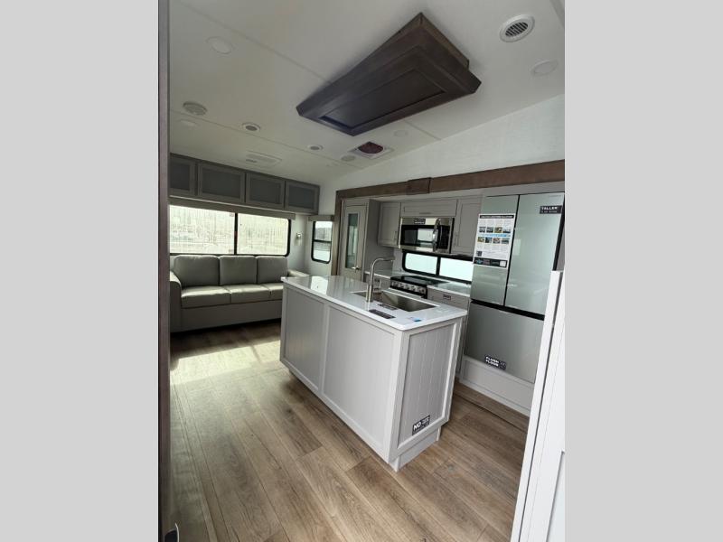 Perfect for families, couples, and travelers who crave space and style. The heart of this fifth wheel is the spacious living area, featuring a tri-fold sleeper sofa that's perfect for lounging and sleeping. Gather around the table with chairs and a bench for meals or socializing. The kitchen is fully equipped with a kitchen island, pantry, hutch, and overhead cabinets, providing ample storage and counter space. The microwave and 10 cu 12V refrigerator ensure that meal preparation and storage are convenient and easy. The full bathroom offers a private space for personal care, ensuring a comfortable and refreshing experience, and the front bedroom is a peaceful retreat, featuring a queen bed, nightstands, and overhead storage.