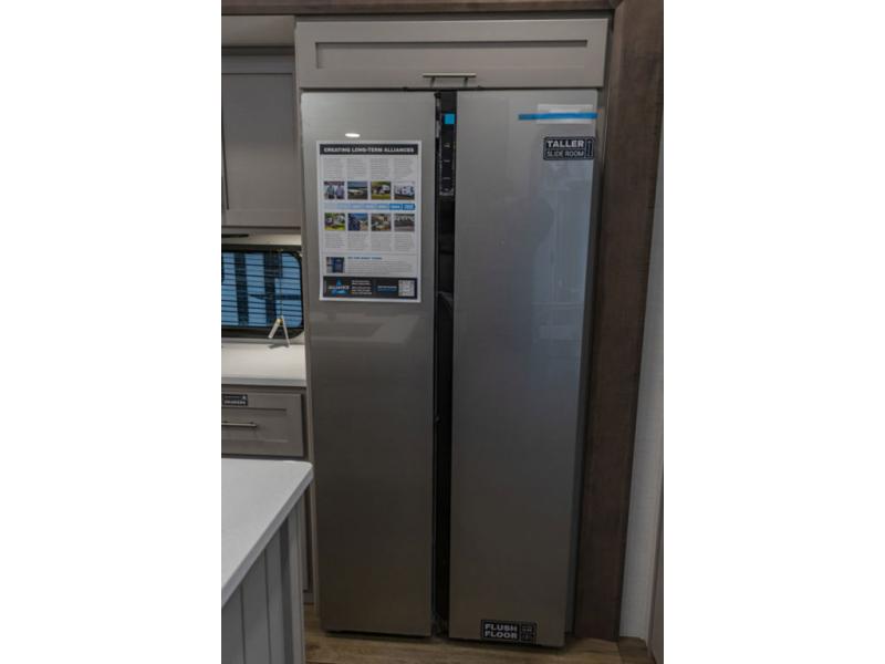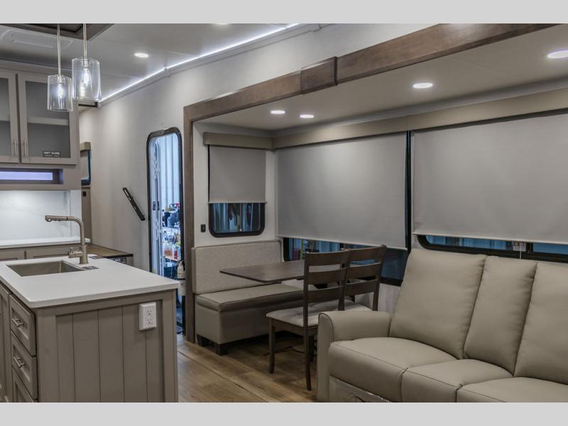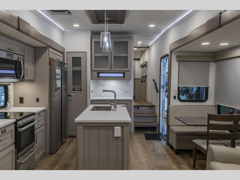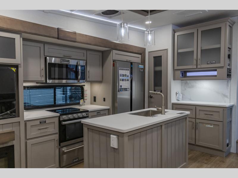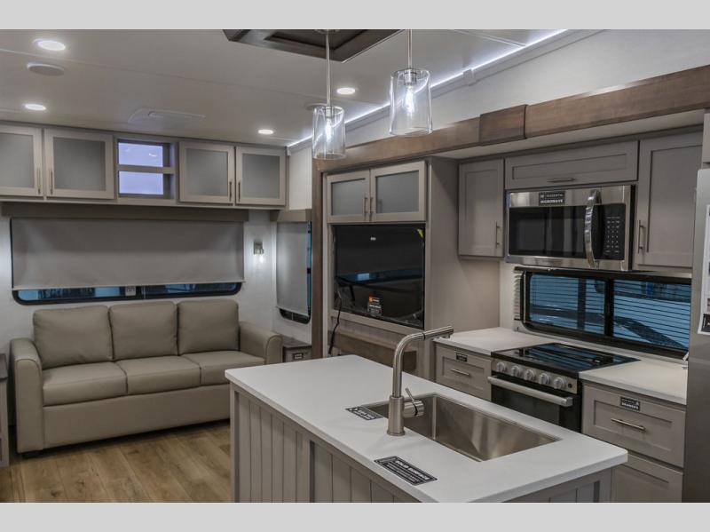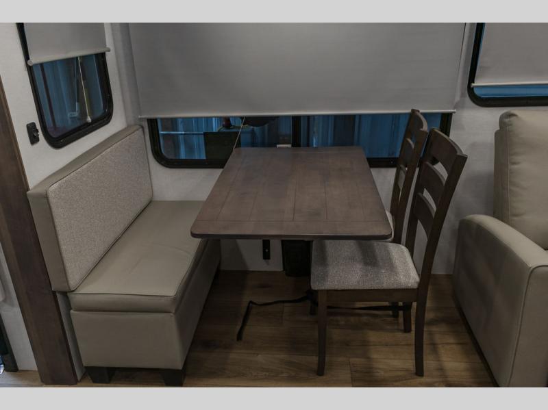 A kitchen island with countertop space makes it easy to prepare meals in this fifth wheel! The floating dinette table has two chairs on one side and a movable ottoman with flip up storage on the other side to keep your games or extra table cloths in. You can store your dishes and snacks inside the hutch/pantry or in the second pantry. The front private bedroom has a queen bed slide but can be switched out for the optional king bed if you like. There is also a dresser and large wardrobe for storage, and either side of the wardrobe with washer and dryer prep. The rear living area features a dual recliner theater seat across from an entertainment center with a 50" class HDTV with hidden storage behind it, and is also on a swing mount for all to see even at the rear sleeper sofa!