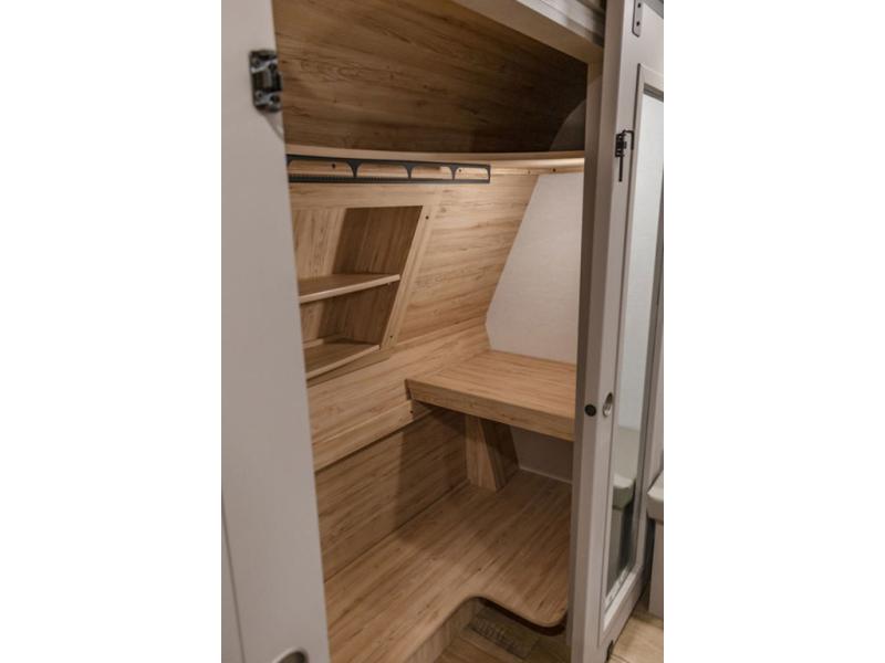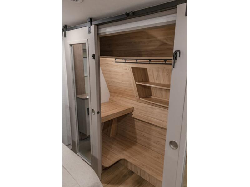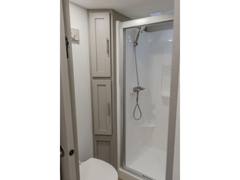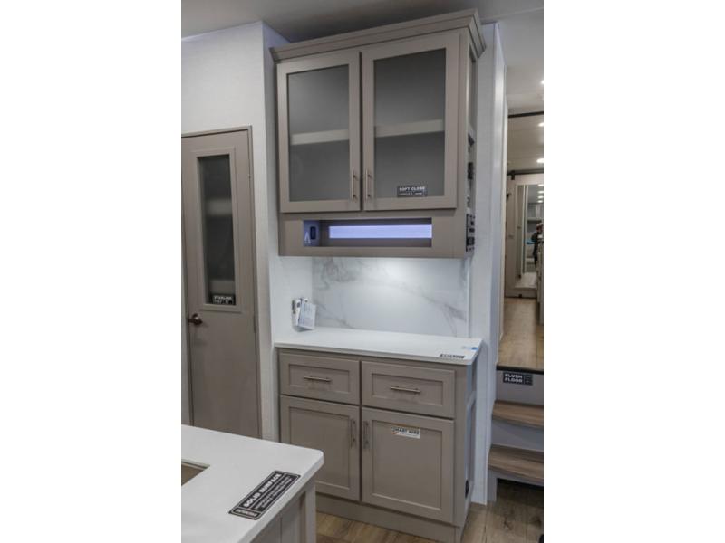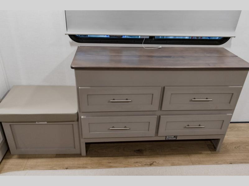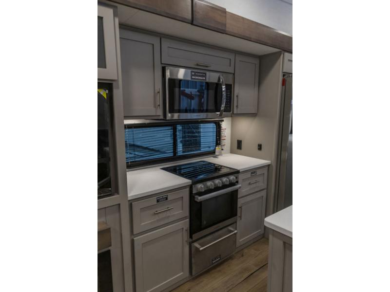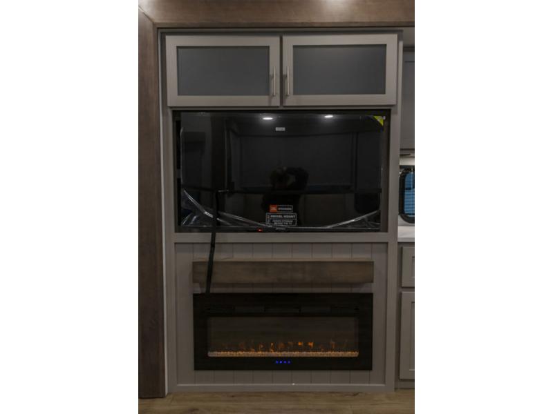 A kitchen island with countertop space makes it easy to prepare meals in this fifth wheel! The floating dinette table has two chairs on one side and a movable ottoman with flip up storage on the other side to keep your games or extra table cloths in. You can store your dishes and snacks inside the hutch/pantry or in the second pantry. The front private bedroom has a queen bed slide but can be switched out for the optional king bed if you like. There is also a dresser and large wardrobe for storage, and either side of the wardrobe with washer and dryer prep. The rear living area features a dual recliner theater seat across from an entertainment center with a 50" class HDTV with hidden storage behind it, and is also on a swing mount for all to see even at the rear sleeper sofa!