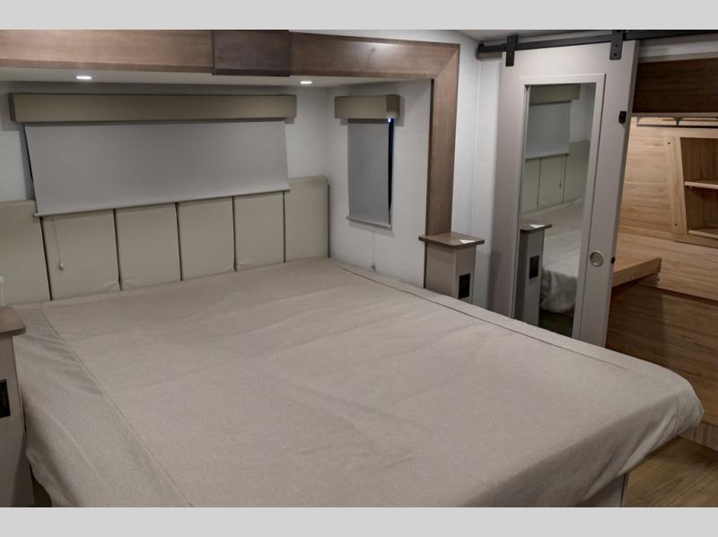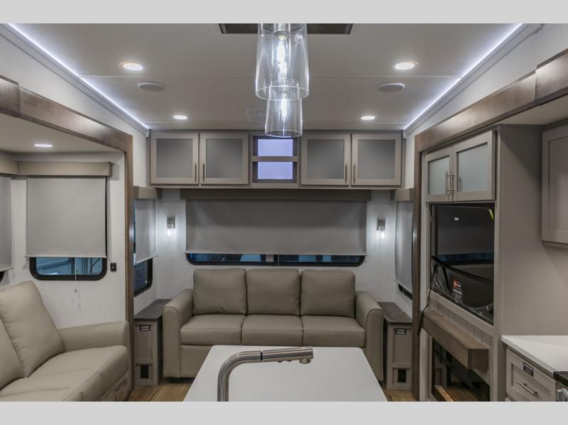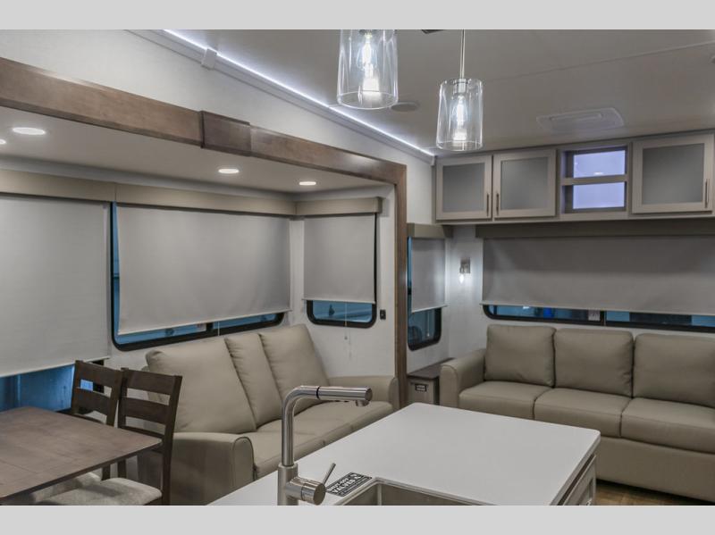 With any Avenue fifth wheel or travel trailer by Alliance RV, you will enjoy more interior space provided by the 8' 5" wide-body construction, and a long list of luxury features. Each is built with Azdel composite sidewalls both inside and out, along with a PVC roof for added strength. There are innovative storage solutions that include hidden storage behind the TV, within end tables and ottomans, and more. Since these units feature no carpet throughout, cleaning will be easier than ever, and there are flush floor slides throughout for seamless living spaces. The Avenue also comes with the OTG Solar Package with a 400 watt solar panel, inverter prep, multiple outlets, and more to keep you charged up!