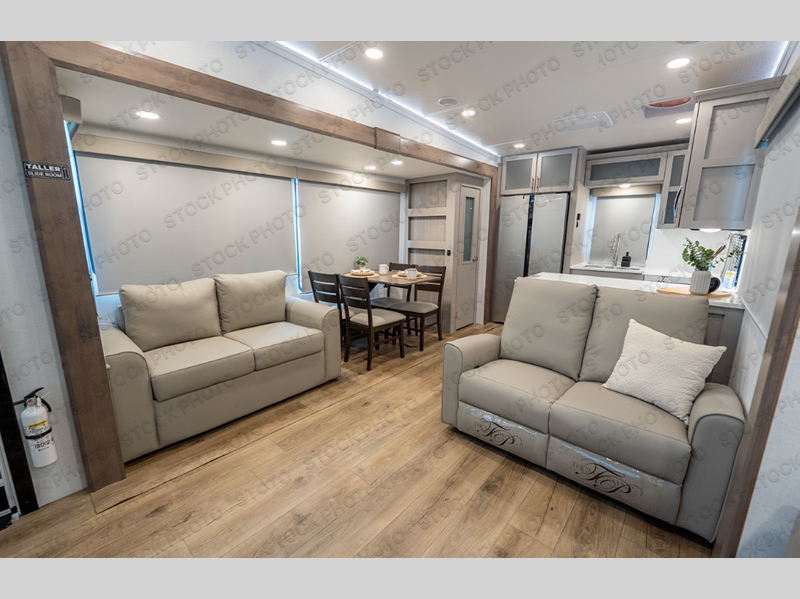 You're sure to love every minute spent in this triple slide out fifth wheel! There are dual sleeper sofas in the middle living area where your guests can sleep, while you take the queen bed slide out in the front bedroom. There is also a king bed option, a walk-in closet with washer and dryer prep, plus a dresser for even more storage. Back in the living area, you can relax on the dual recliner loveseat that sits across from the fireplace and 65" TV. Once dinner has been made on the three burner cooktop, you can dine at the floating dinette table with four chairs.