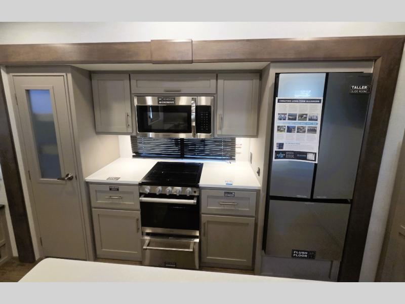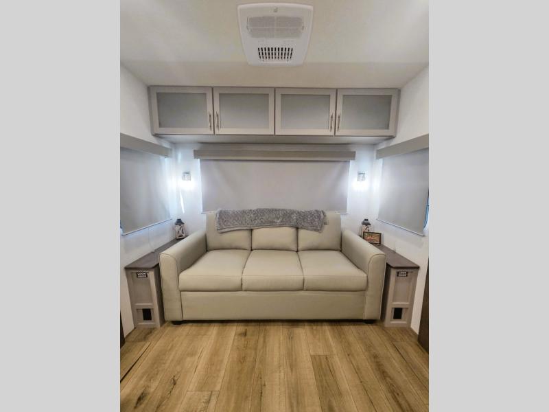 Perfect for families, couples, and travelers who crave space and style. The heart of this fifth wheel is the spacious living area, featuring a tri-fold sleeper sofa that's perfect for lounging and sleeping. Gather around the table with chairs and a bench for meals or socializing. The kitchen is fully equipped with a kitchen island, pantry, hutch, and overhead cabinets, providing ample storage and counter space. The microwave and 10 cu 12V refrigerator ensure that meal preparation and storage are convenient and easy. The full bathroom offers a private space for personal care, ensuring a comfortable and refreshing experience, and the front bedroom is a peaceful retreat, featuring a queen bed, nightstands, and overhead storage.