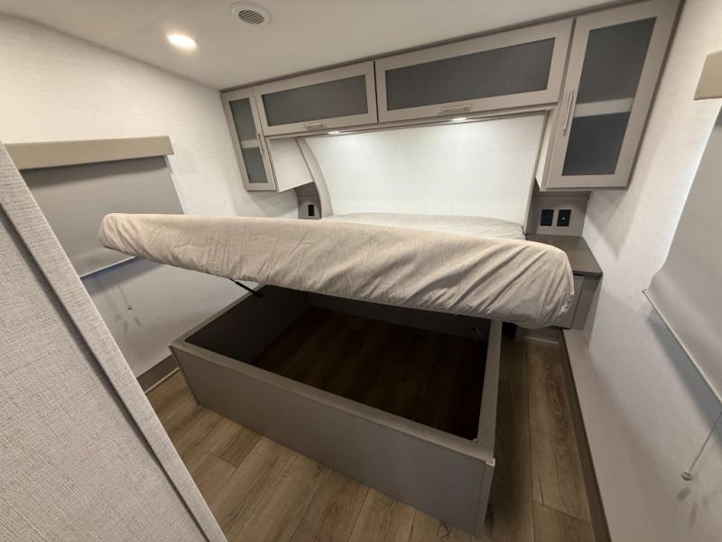 For the couple that enjoys adventures, this rear living coach has everything you need to travel comfortably and take along a couple of friends! The front private bedroom has a queen bed with nightstands on either side for your personal belongings, and a wardrobe to keep your clothes looking nice. Freshen up each morning in the full bathroom with a 30" x 36" shower, and grab a towel stored close by in the linen closet. Now that you're ready for the day, you can head to the kitchen and create a hearty breakfast with the full kitchen amenities. You will appreciate having a 10 cu. ft. 12V refrigerator and three burner cooktop, plus there is a center island with plenty of counter space and a sink to make food prep even easier. Spend your evenings in true relaxation in the dual recliner theater seats across from the swing mount 50" HDTV with hidden storage behind. You will also love the pantry and hutch in the kitchen area for storing all of your dishes and non-perishables. Dine at the floating table with two chairs along with a moveable ottoman featuring storage.