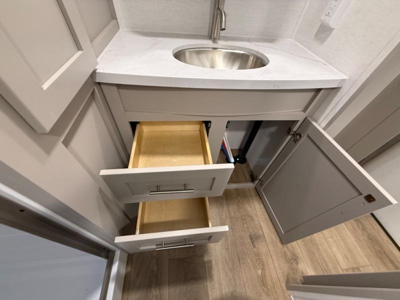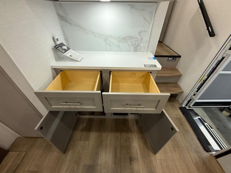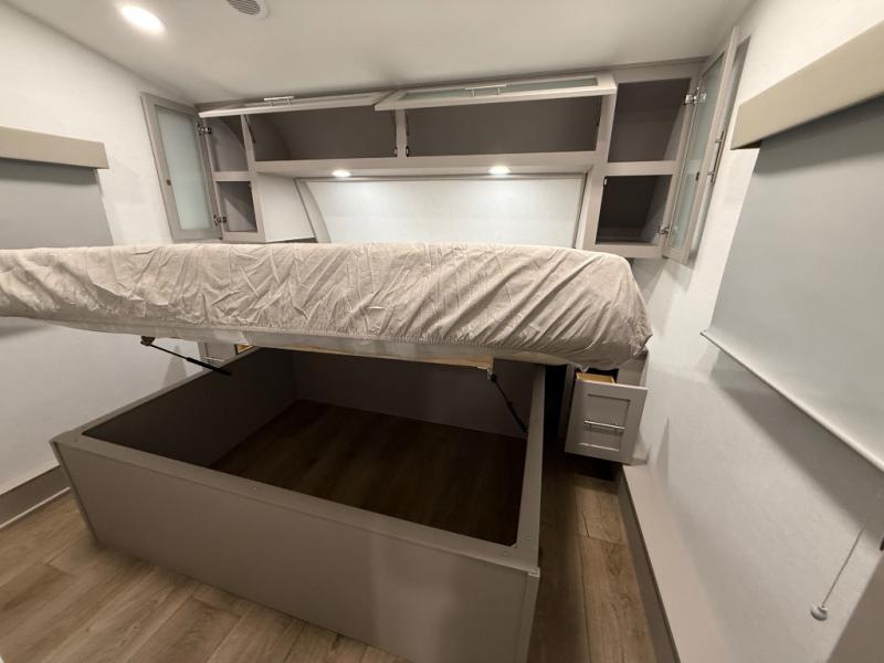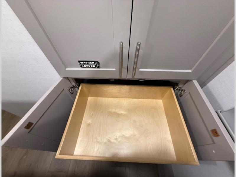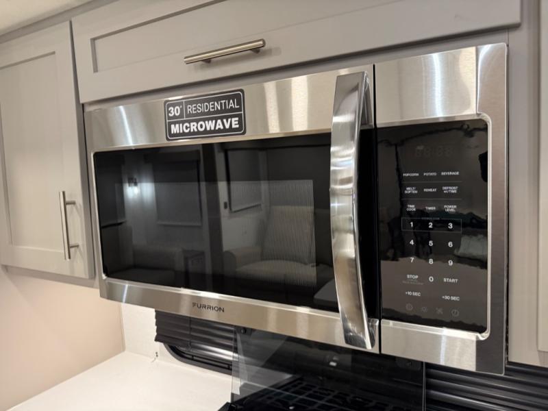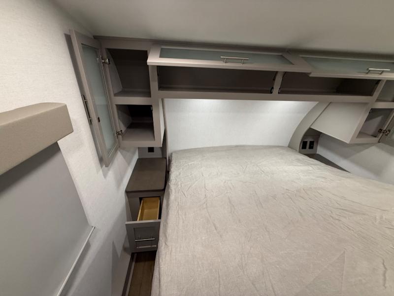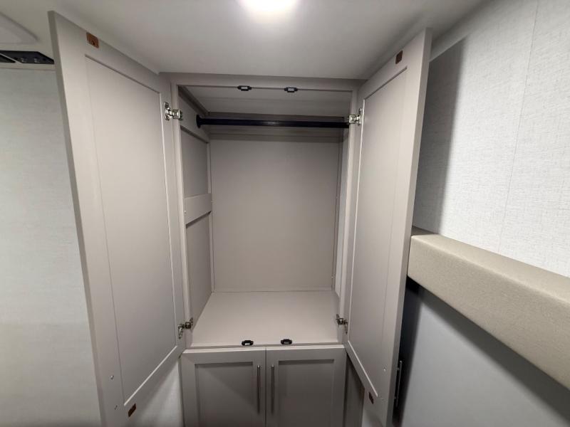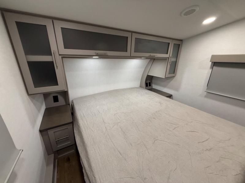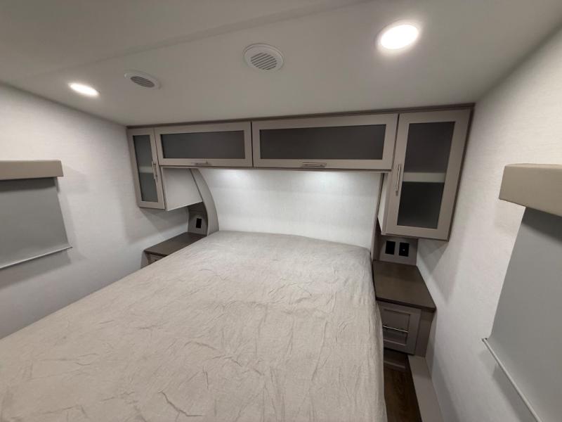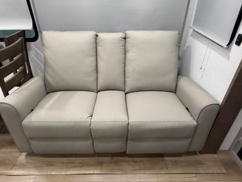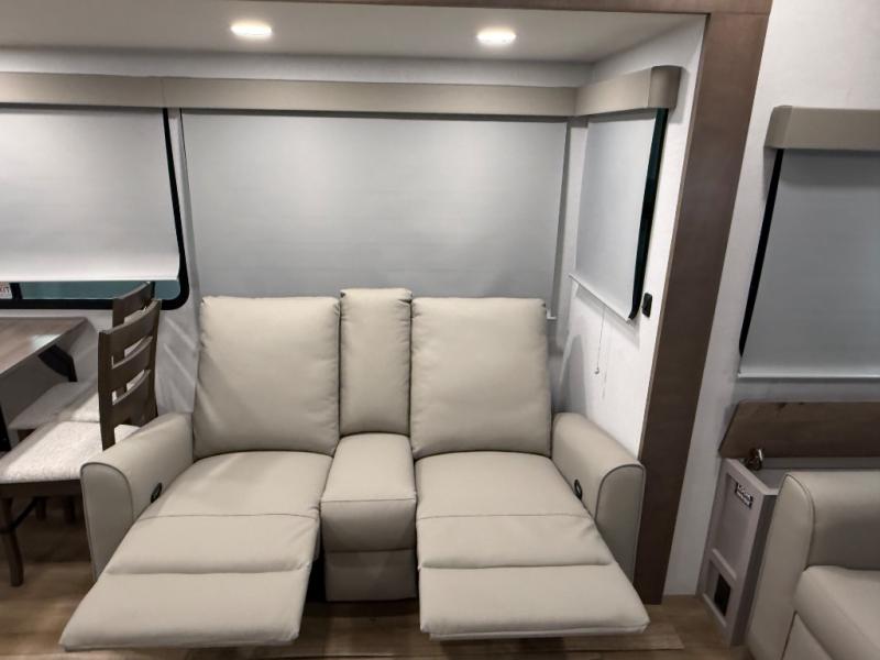 For the couple that enjoys adventures, this rear living coach has everything you need to travel comfortably and take along a couple of friends! The front private bedroom has a queen bed with nightstands on either side for your personal belongings, and a wardrobe to keep your clothes looking nice. Freshen up each morning in the full bathroom with a 30" x 36" shower, and grab a towel stored close by in the linen closet. Now that you're ready for the day, you can head to the kitchen and create a hearty breakfast with the full kitchen amenities. You will appreciate having a 10 cu. ft. 12V refrigerator and three burner cooktop, plus there is a center island with plenty of counter space and a sink to make food prep even easier. Spend your evenings in true relaxation in the dual recliner theater seats across from the swing mount 50" HDTV with hidden storage behind. You will also love the pantry and hutch in the kitchen area for storing all of your dishes and non-perishables. Dine at the floating table with two chairs along with a moveable ottoman featuring storage.