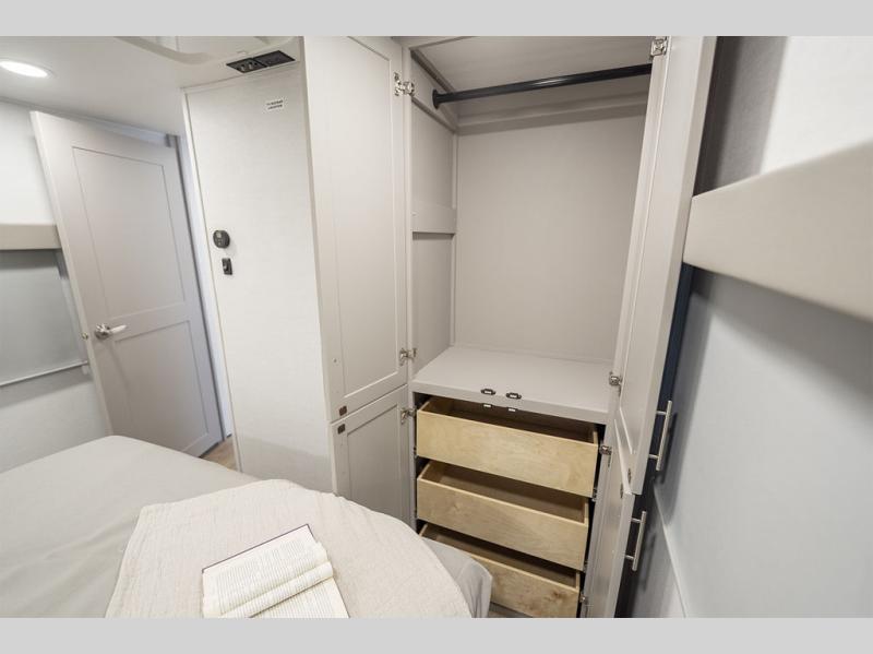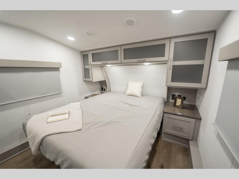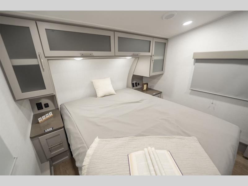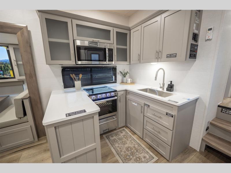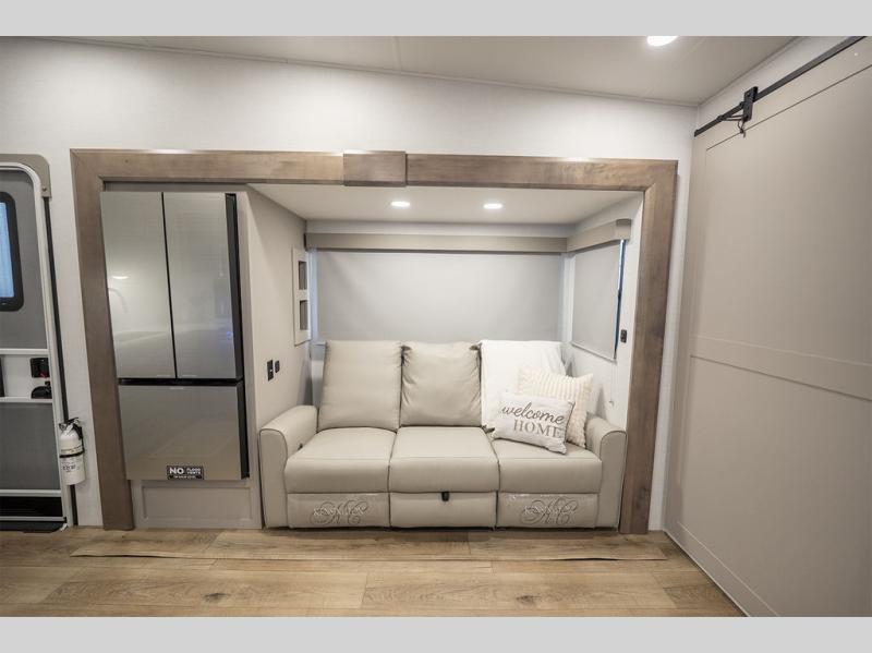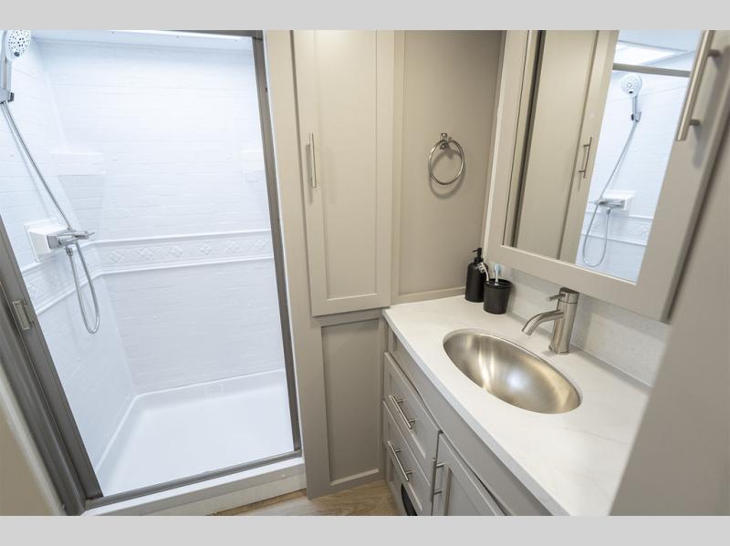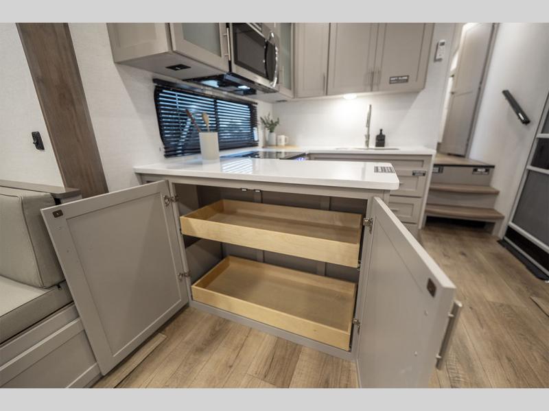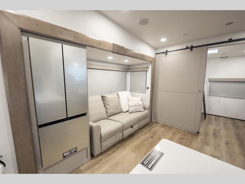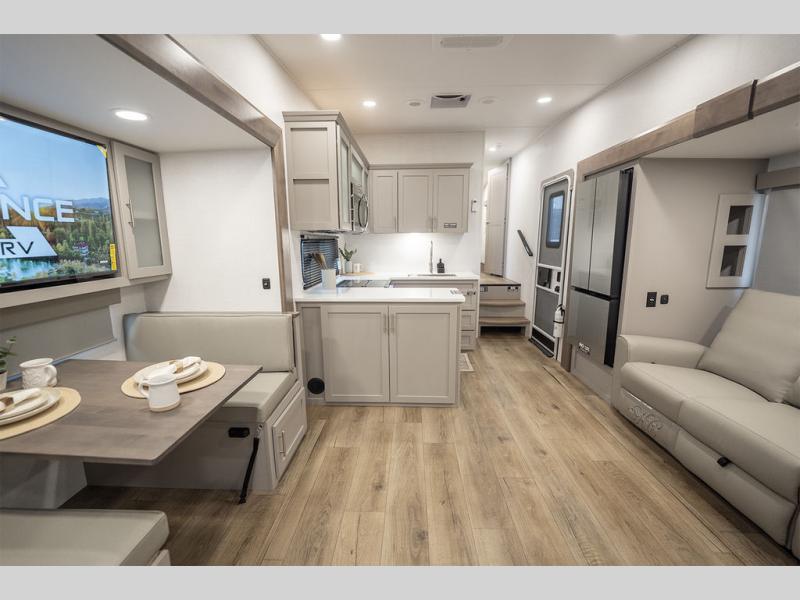 A benchmark chassis creates a space saver upper deck with each one of these Avenue All-Access fifth wheels by Alliance RV! The 101 in. wide-body construction gives you more room to walk around and the flush slide out floors throughout prevent any tripping. There are composite sidewalls inside and out, and a seamless fully walkable PVC roof for extreme durability and zero maintenance. You are sure to love no carpet throughout making each Avenue All-Access easy to clean and allergen free, not to mention pet friendly. You can maximize your space throughout with innovative storage solutions like the hidden storage behind the TV, inside the end tables, ottoman, and dinette chairs. These units also include the OTG Solar Package with a 200 watt solar panel, 15 amp MPPT charger, multiple outlets, and more to keep you powered up!