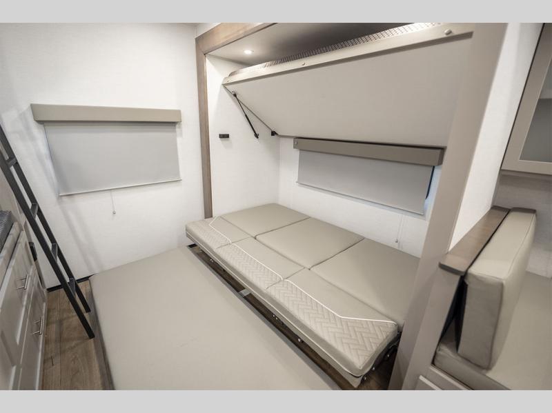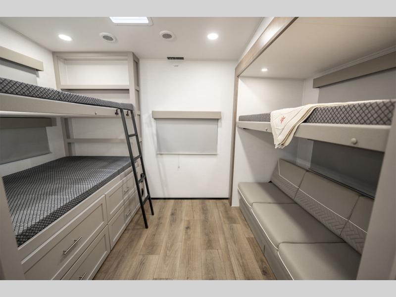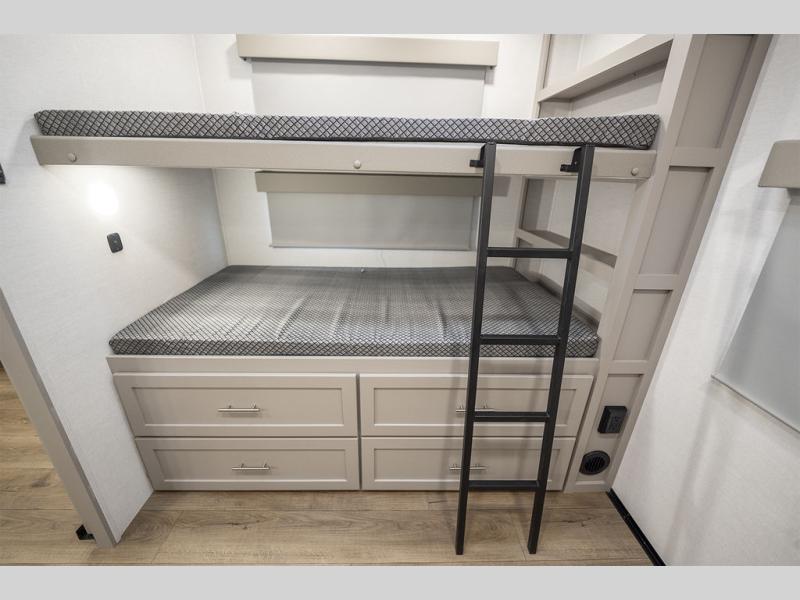 If you've been searching for a fifth wheel with more sleeping space, this is the one! You will find a queen bed in the front private bedroom, along with a wardrobe with washer and dryer prep and overhead storage for your things. Your guests can take the rear bunkhouse that includes 40" x 72" bunks across from a slide out with a flip-up bunk and cube sofa below. Everyone can meet in the middle living area and kitchen to relax on the sofa that is in direct view of the 50" Class HDTV. There is also a booth dinette table here to dine together. If the weather is nice, you may just find yourselves outdoors since there are two awnings and an exterior griddle!
