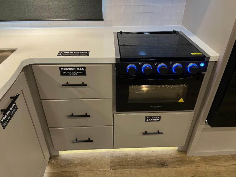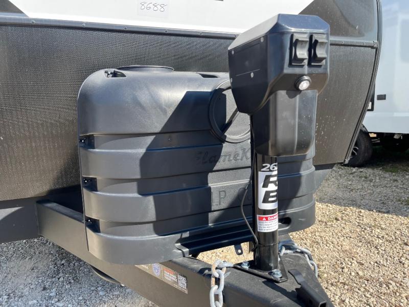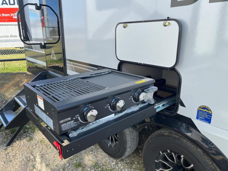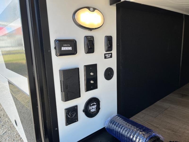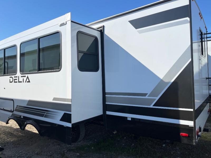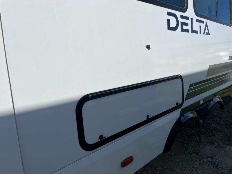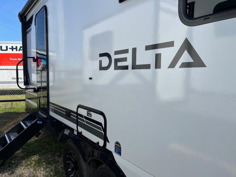 You will love all of your adventures with this Delta travel trailer in tow! This unit is perfect for a couple or even a family of four with a queen bed in the front private bedroom and also using the U-shaped dinette once converted for more sleeping space. The U-shaped dinette is great for gathering for meals, a board game or game of cards, and the sofa is directly opposite a 40" HDTV which makes viewing enjoyable. You can easily prepare all of your favorite meals and snacks with the kitchen amenities provided inside. A three burner range allows you to easily cook indoors, or you can cook outside using the outdoor griddle/grill if you like. There is a 10 cu. ft. 12V refrigerator to keep all of your perishables and drinks nice and cold, plus a large sink for dishes and cleaning up, and a convenient pull-out trash can and flip-up counter extension as well. You will also appreciate the full rear bath featuring a 30" x 36" shower, toilet, vanity with sink, and linen cabinet for your towels and toiletries.