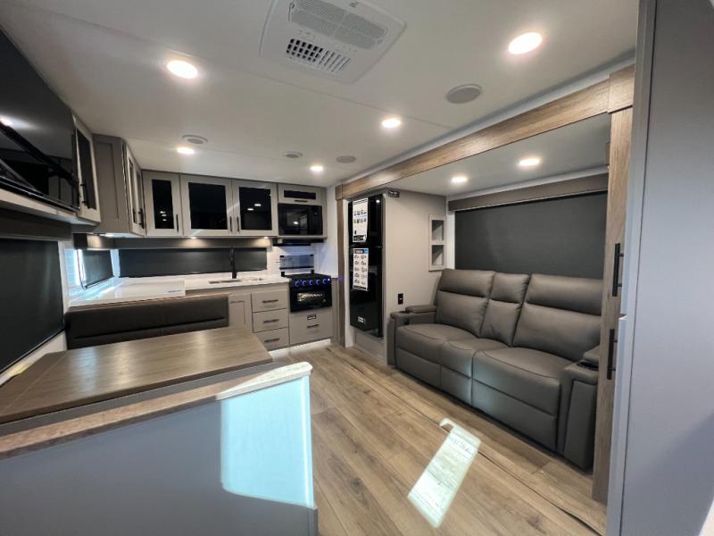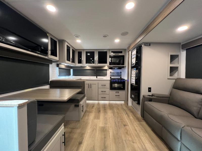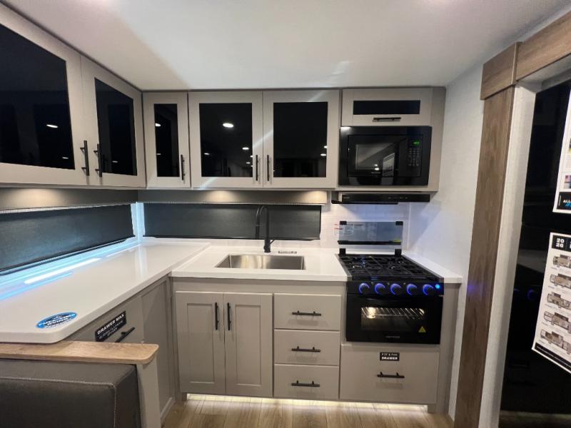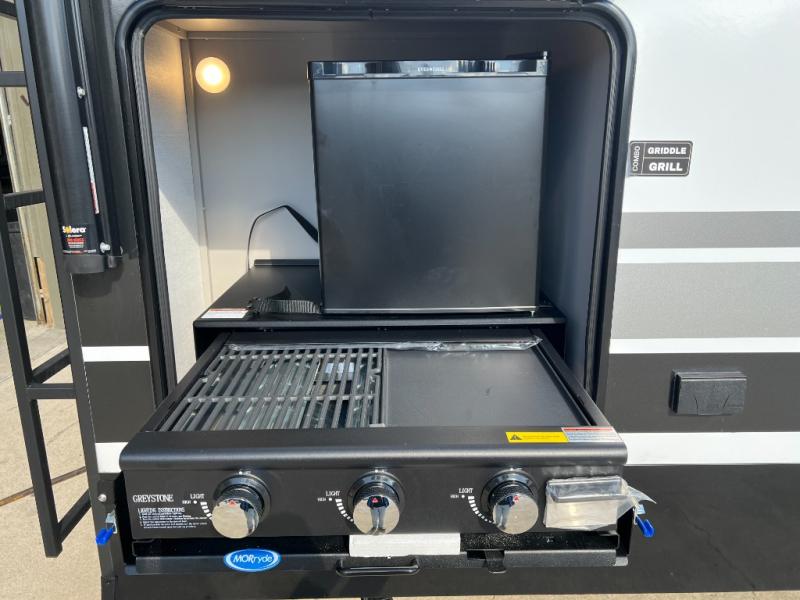Head to your favorite camping spot in this double slide out travel trailer! You can set up the 19' awning when you arrive, then start lunch on the exterior griddle. There is also an exterior refrigerator for cold drinks! If the weather isn't cooperating, the rear kitchen includes generous counter space to prep meals and all the appliances needed. A booth dinette inside provides a place to dine together, or you can choose the optional table and chairs if you prefer that seating arrangement. You're sure to enjoy the theater seat in direct view of the 40" TV for movie nights, and when you're ready to call it a night, the queen bed in the front bedroom will provide a great night's rest.