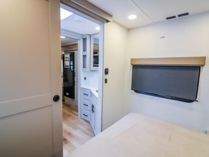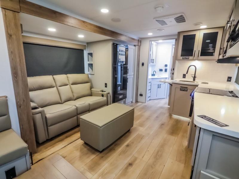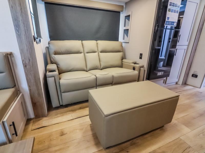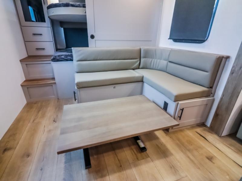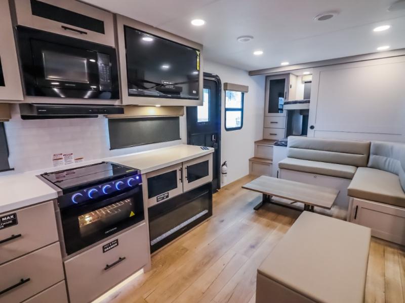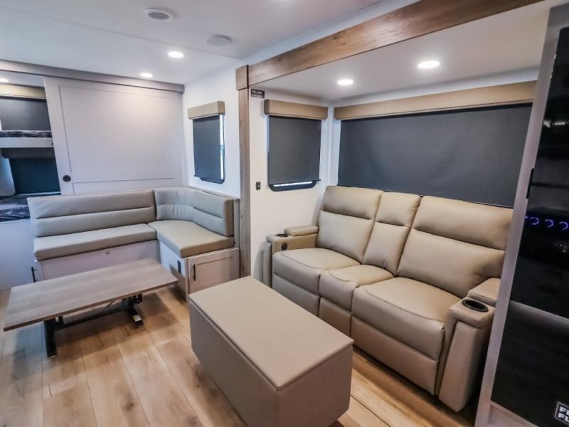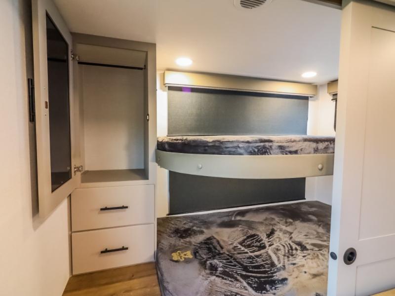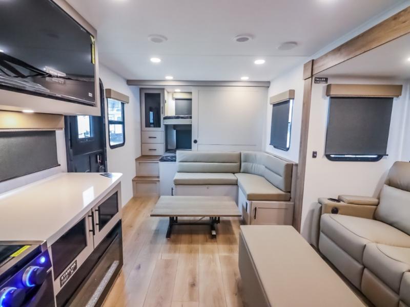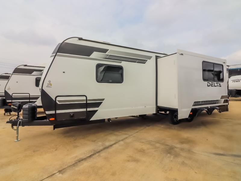 This Delta 291BH model offers a thoughtfully designed layout perfect for comfort and convenience on the road. At the front, you'll find a private bedroom featuring two nightstand wardrobes, and additional overhead storage for all your essentials. Moving through the walk-through bathroom, enjoy a 30" x 36" shower and a soft-close porcelain toilet with foot flush. The central living area is ideal for relaxing or entertaining, with a 68" theater seat that has the option to be a tri-fold sleeper sofa for added sleeping space if needed. Along with a L-shaped dinette, and a 36" ottoman, all centered around a 40" TV. At the rear we have, two 46" x 74" bunks with steps that provide extra-sleeping space and easy accessibility along with a wardrobe for added storage, making this RV perfect for families or group travel.