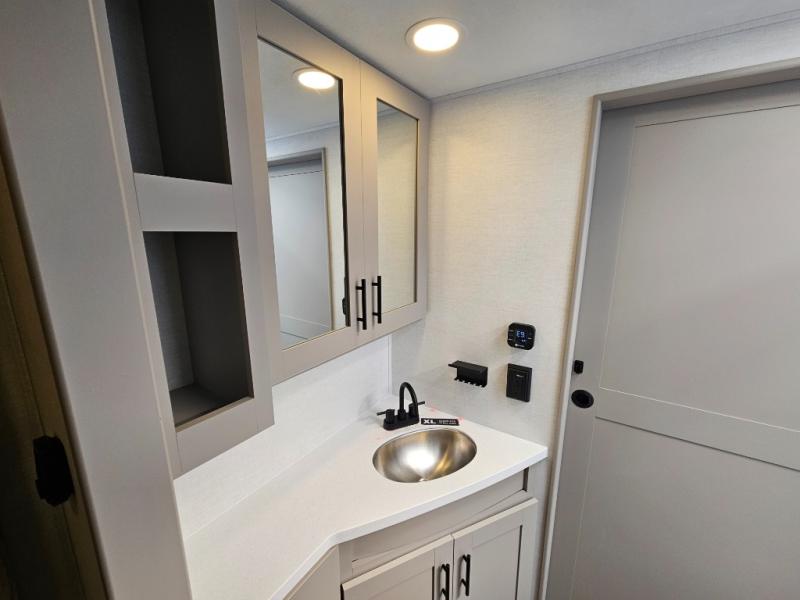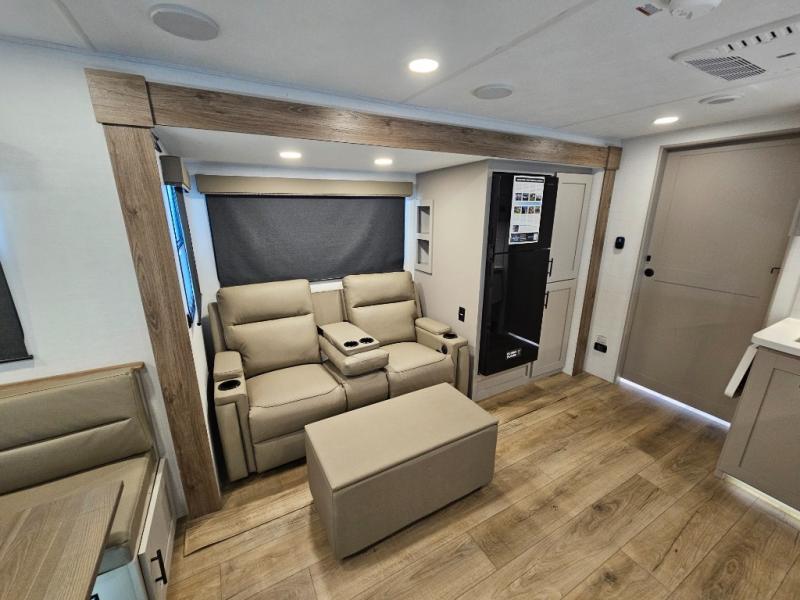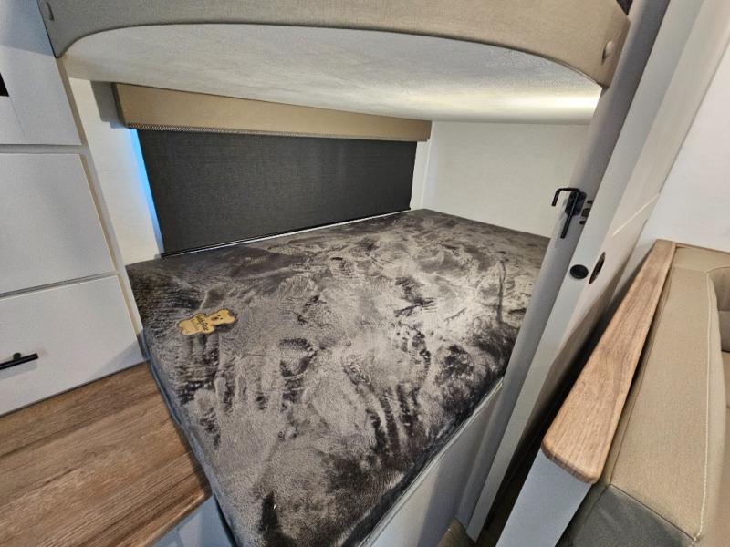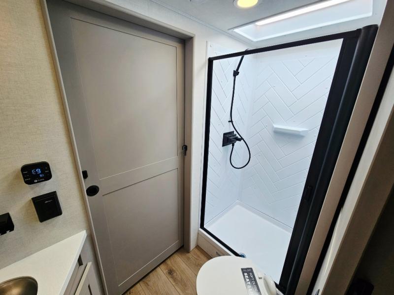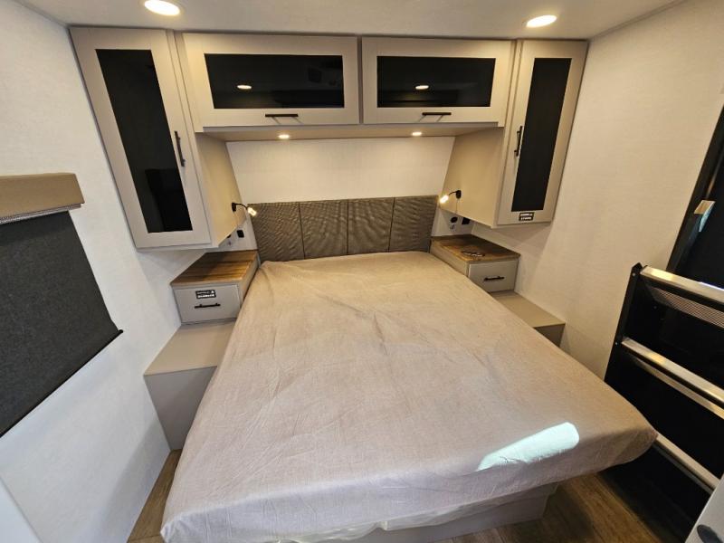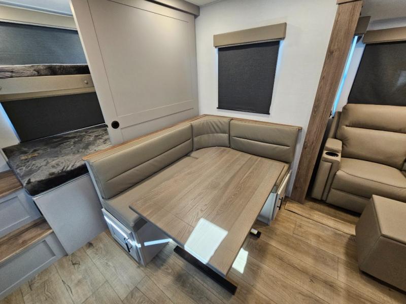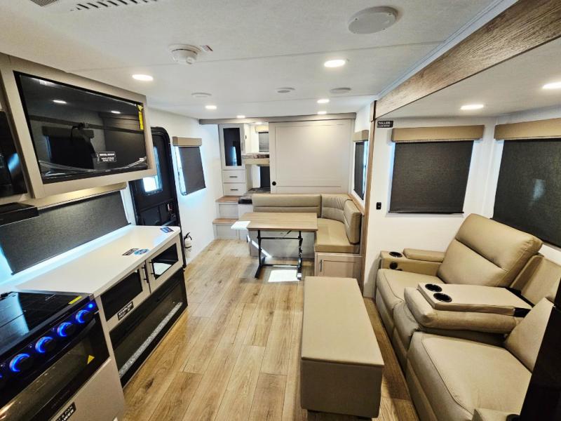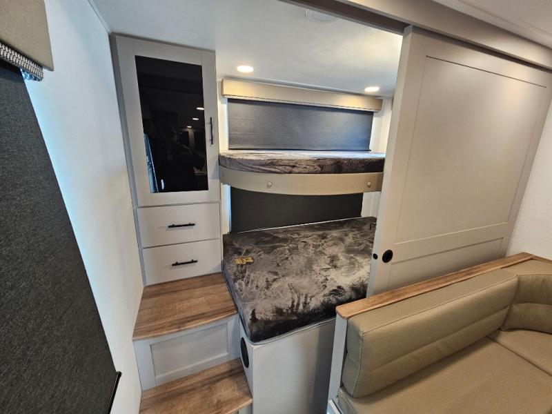 This Delta 291BH model offers a thoughtfully designed layout perfect for comfort and convenience on the road. At the front, you'll find a private bedroom featuring two nightstand wardrobes, and additional overhead storage for all your essentials. Moving through the walk-through bathroom, enjoy a 30" x 36" shower and a soft-close porcelain toilet with foot flush. The central living area is ideal for relaxing or entertaining, with a 68" theater seat that has the option to be a tri-fold sleeper sofa for added sleeping space if needed. Along with a L-shaped dinette, and a 36" ottoman, all centered around a 40" TV. At the rear we have, two 46" x 74" bunks with steps that provide extra-sleeping space and easy accessibility along with a wardrobe for added storage, making this RV perfect for families or group travel.