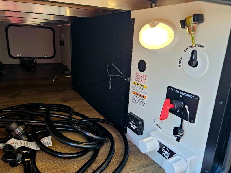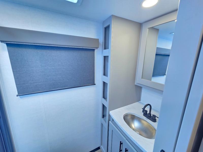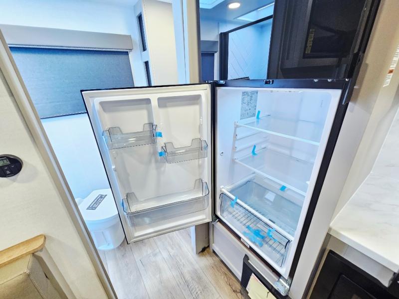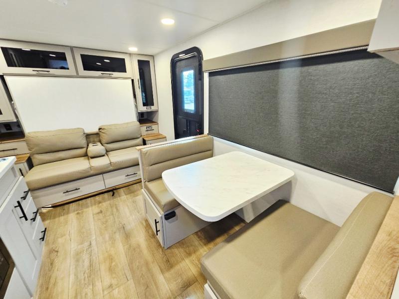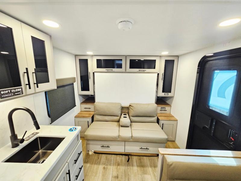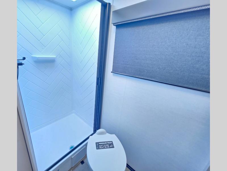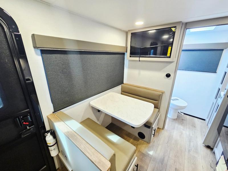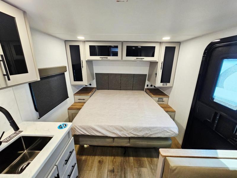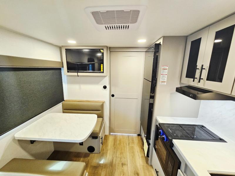 This compact, yet feature-packed travel trailer offers smart design and comfort throughout. Step inside through the 28" entry to find a front queen bed that easily converts into a 60" jackknife sofa, flanked by wardrobe nightstands for your clothes and essentials. The central kitchen is equipped with a 10-cu. ft. refrigerator, two-burner cooktop, sink, and overhead storage, while a booth dinette across from it offers dining space and a clear view of the 32-inch TV. At the rear, enjoy the convenience of a full bathroom with a spacious 30" x 36" shower, a sink with linen shelves, and additional overhead compartments for organized storage.