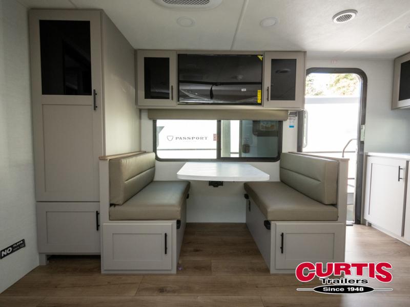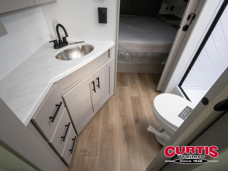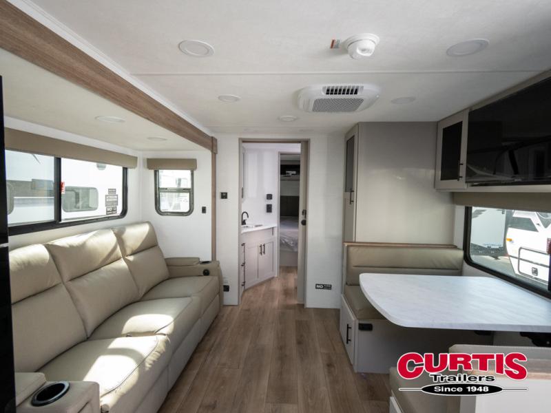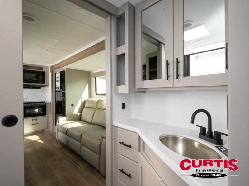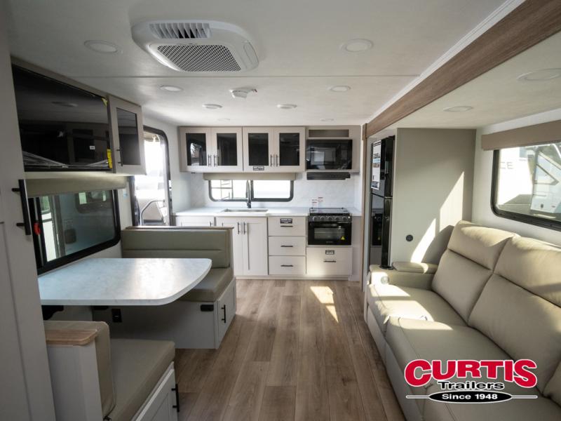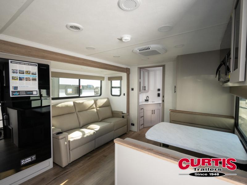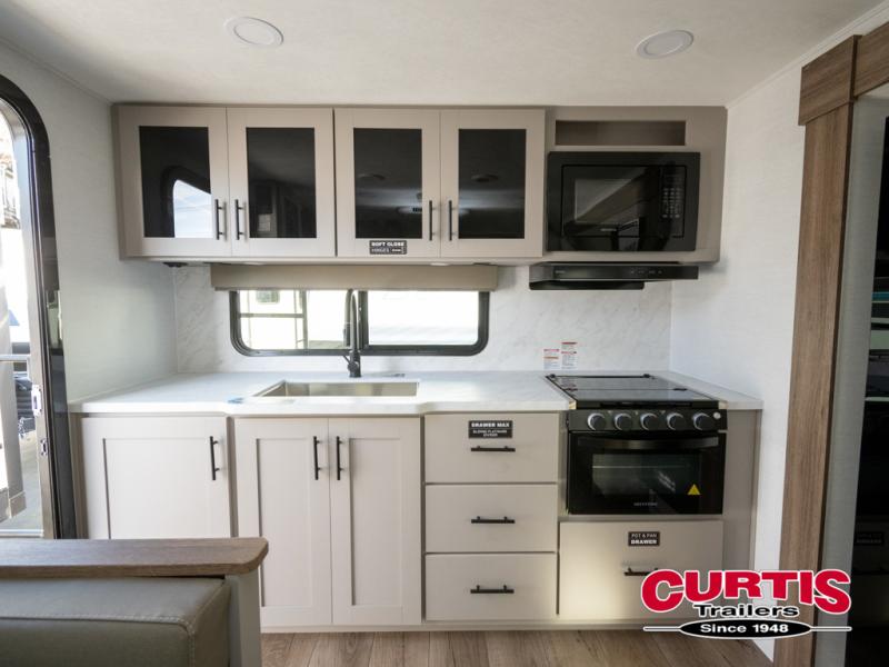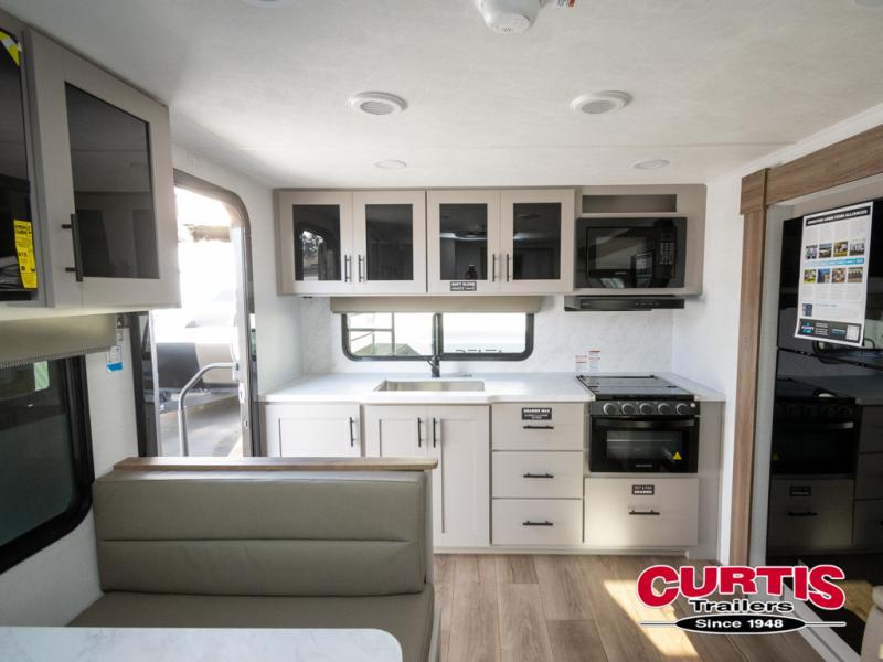 You'll love camping in this rear kitchen travel trailer with generous counter space and overhead storage for spices, dishes, and more. You can dine each day at the booth dinette or relax on the sofa slide out, which will provide more floor space. The spacious walk-thru bath includes a 30" x 36" shower, toilet, and vanity so you can clean up each day. Head to the front master bedroom where you can sleep soundly on the walk-around queen bed with dual nightstands and wardrobes. The second entry door is also found in this room so you can slip out for an early morning run!