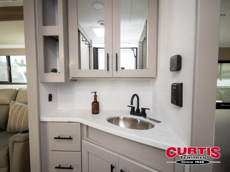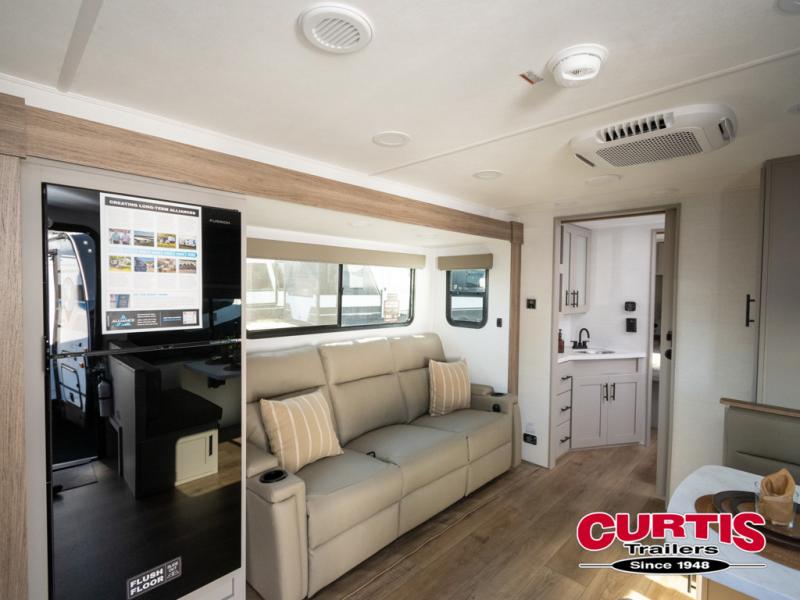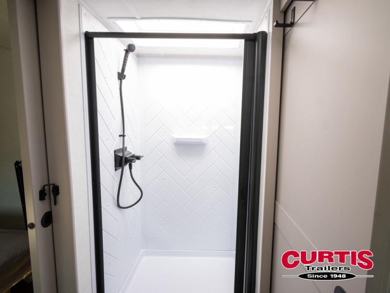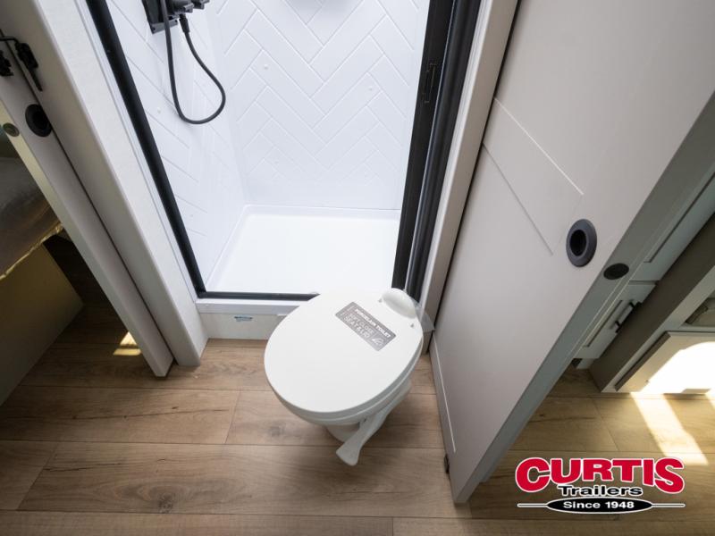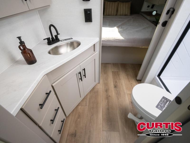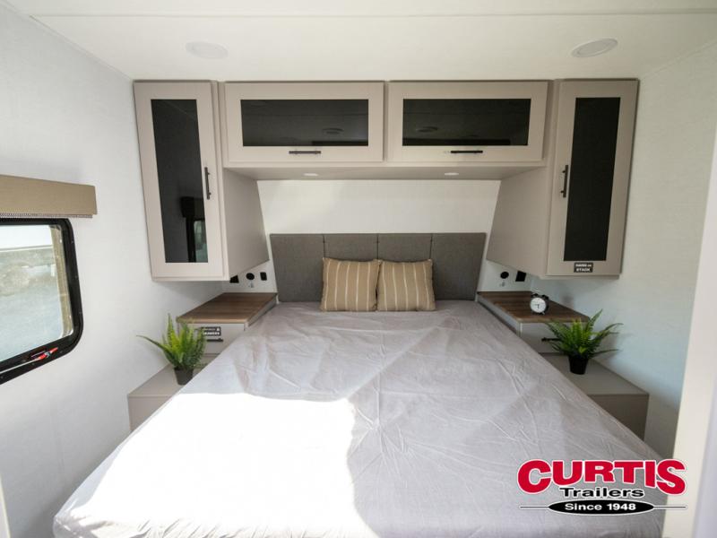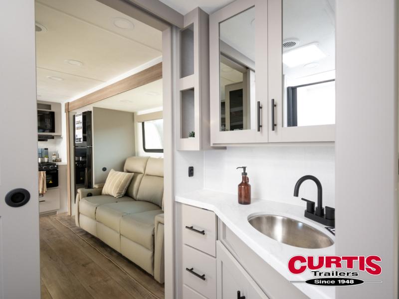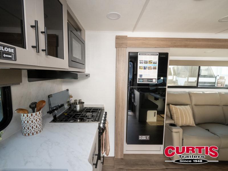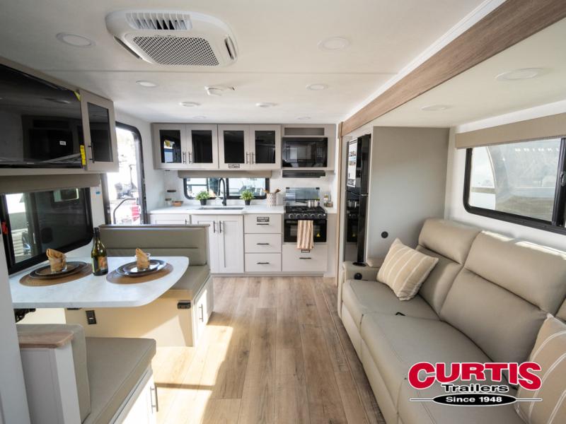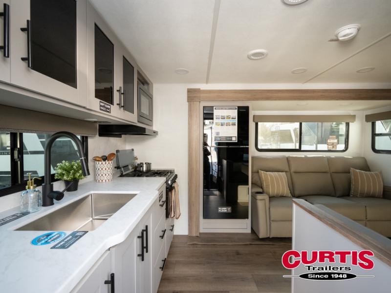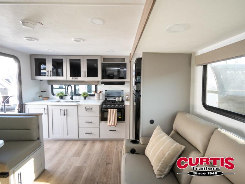 You'll love camping in this rear kitchen travel trailer with generous counter space and overhead storage for spices, dishes, and more. You can dine each day at the booth dinette or relax on the sofa slide out, which will provide more floor space. The spacious walk-thru bath includes a 30" x 36" shower, toilet, and vanity so you can clean up each day. Head to the front master bedroom where you can sleep soundly on the walk-around queen bed with dual nightstands and wardrobes. The second entry door is also found in this room so you can slip out for an early morning run!