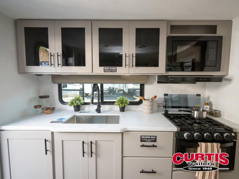 The Delta Ultra Lite travel trailers by Alliance RV are perfect for those looking for a lighter tow weight! The fully functional oversized atrium windows will let more natural light in, and the carpet free interior will be appreciated after a weekend at the lake. There are also magnet catches on all cabinets, soft close hidden hinges, and residential can style LED ceiling lights. The exterior includes multiple location hot/cold spray ports, exterior switches for awning controls, and Goodyear Endurance tires. Start a new adventure today in a Delta Ultra Lite travel trailer!