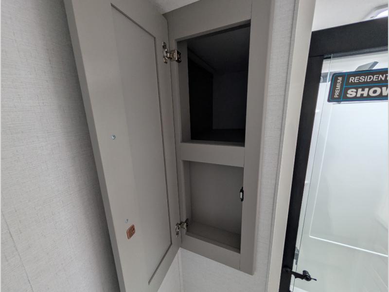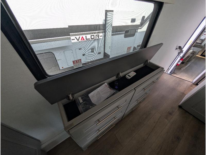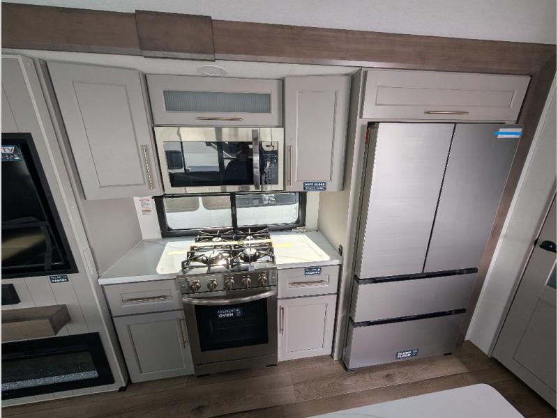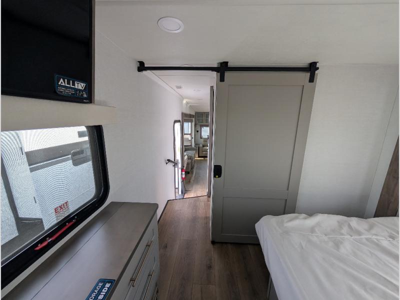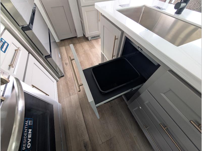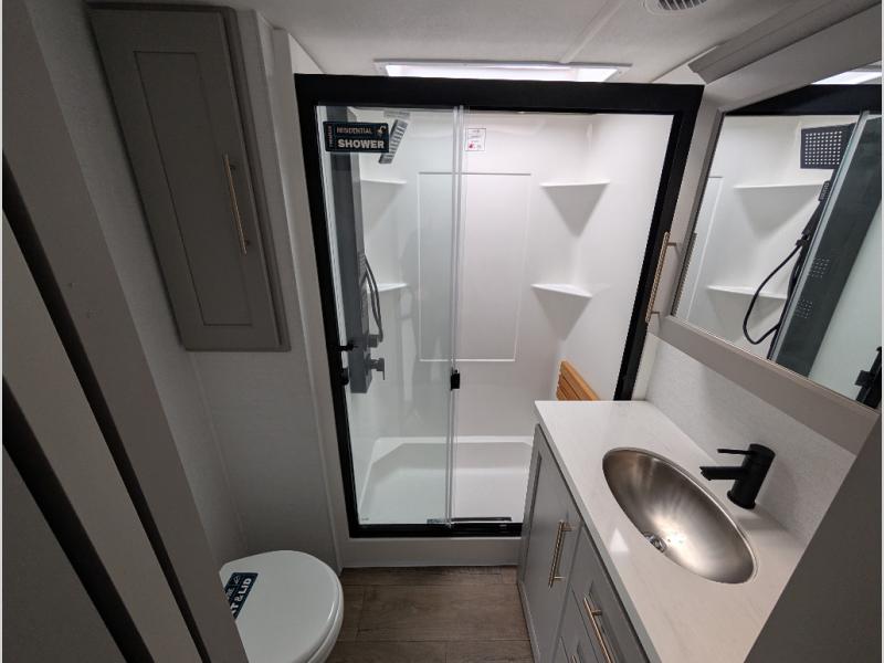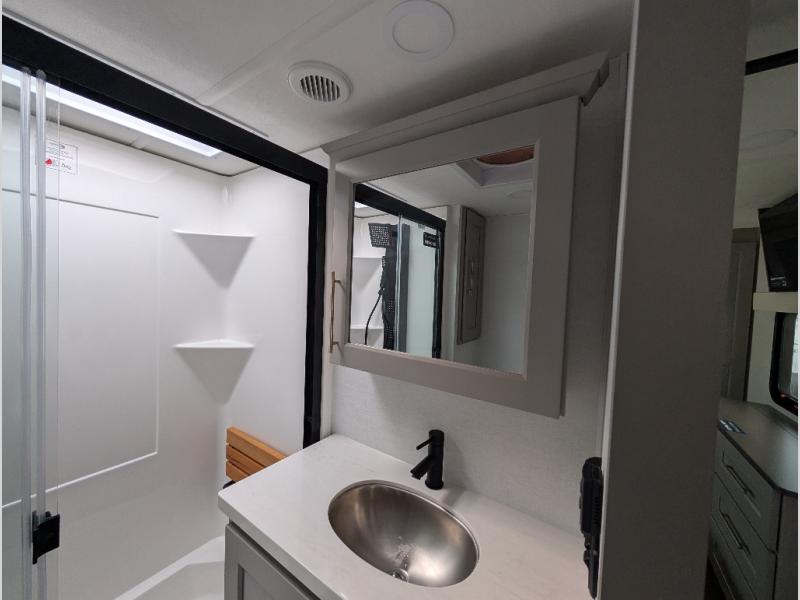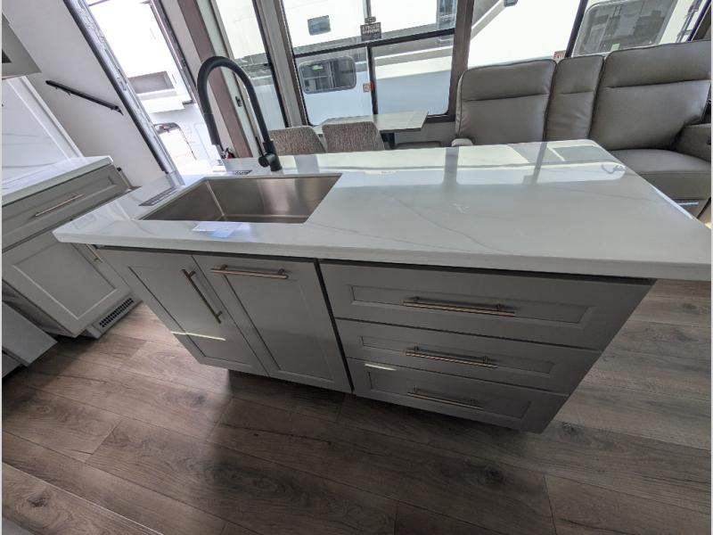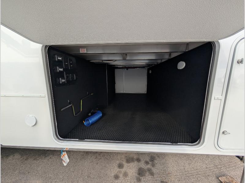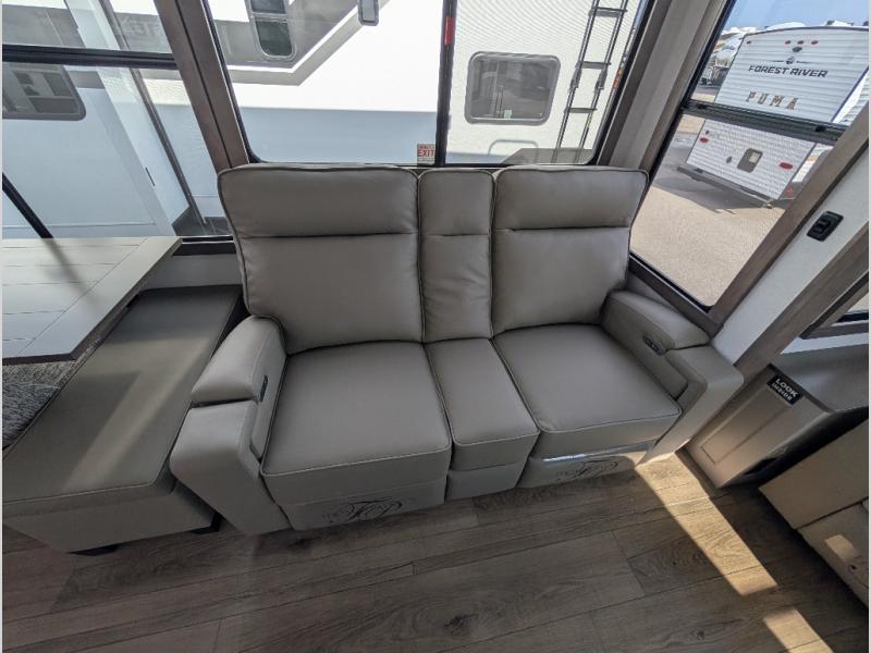 Search for the best views, the nicest RV park, or a place you haven't seen for years with this Paradigm in tow! There is a king bed slide in the master bedroom, a Smart TV, and a dresser with flip-up hidden storage for your belongings. The full bathroom offers a large residential shower, a porcelain toilet with a soft close seat, and storage for your linens, while the kitchen gives you two pantries, an island with a large undermount single basin sink and dishwasher prep if you want the option for easy clean up. You will also have a residential microwave and range, plus a 3.73 cu. ft. oven to make meals. When you're ready to relax for the evening, head to the rear living area to enjoy the dual recliner love seat across from the 50" Smart TV and fireplace!