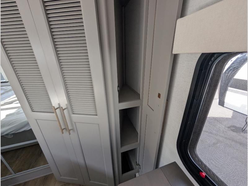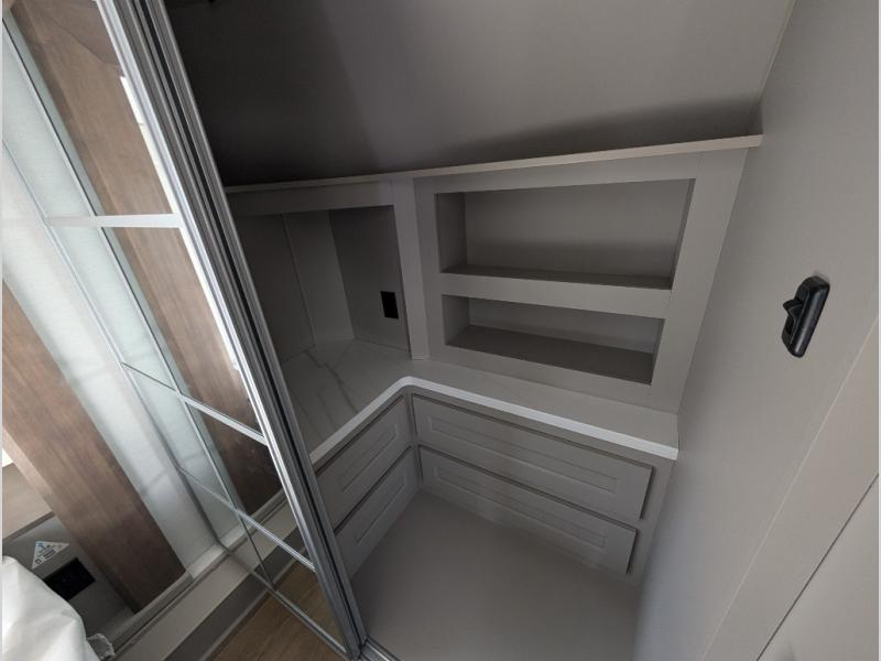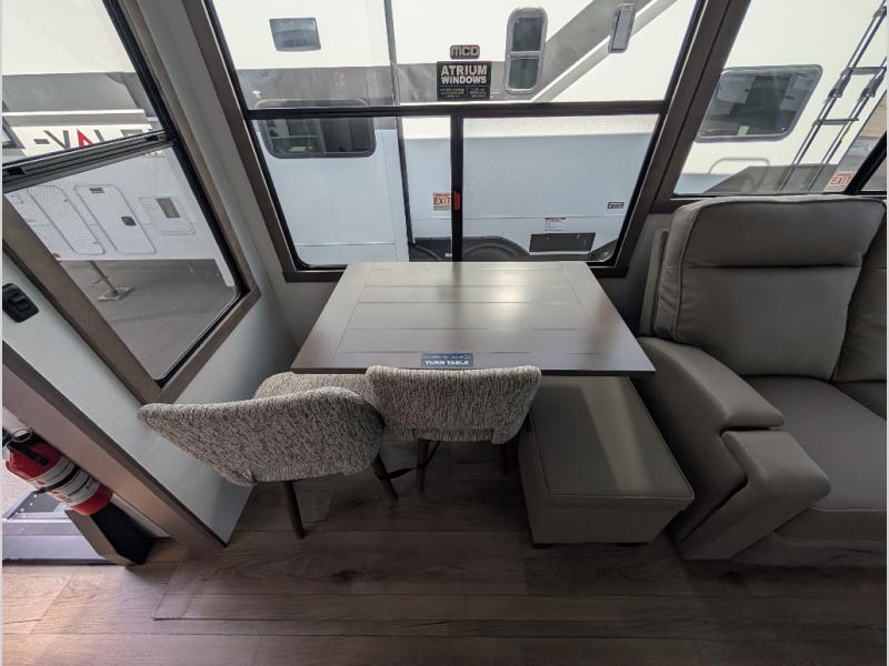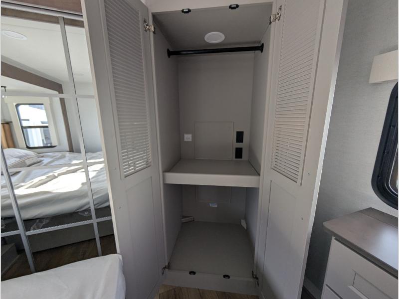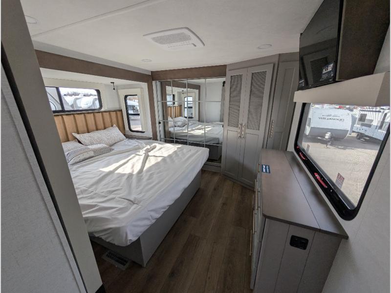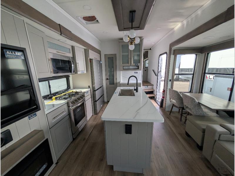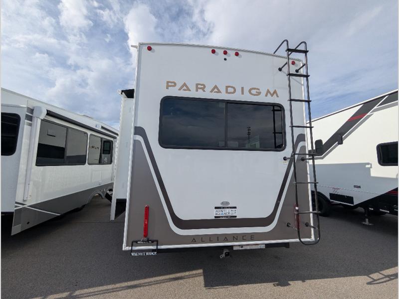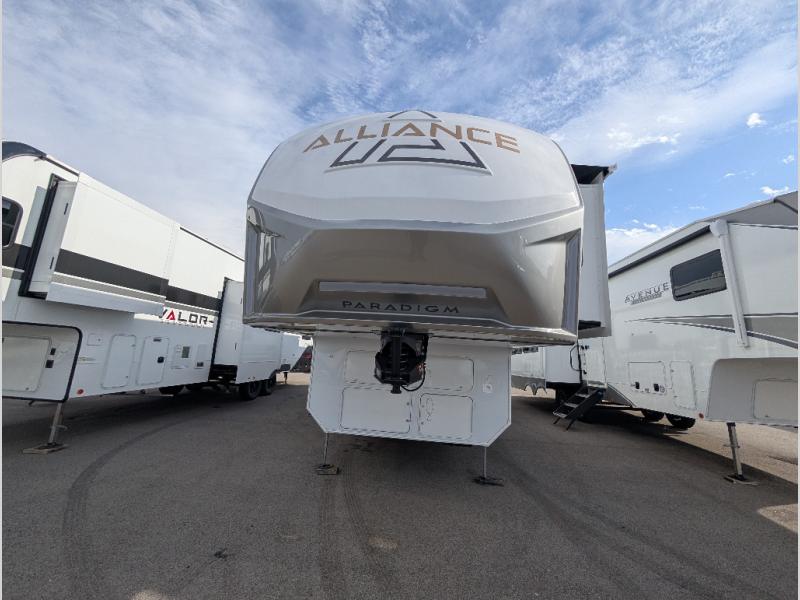 The Paradigm fifth wheels by Alliance RV are functional, high-quality, and luxurious for an unforgettable camping experience. There are three A/C units and a 40K BTU furnace to keep you comfortable year around, and you'll appreciate additional convenient amenities, like the all-in-one enclosed/heated utility center and the color coded and numbered wiring. A Helux Series coil spring pin box comes standard for hassle-free towing, along with Curt 8,000 lb. axles. You'll love the kitchen with its LG solid surface countertops and Lusso range, plus there is LED motion lighting in the pantry and a Maxx fan with a rain sensor to keep everything fresh when making dinner. Each model also includes an HD Smart TV in the living room and bedroom. And of course there are a variety of options you can choose from to further customize your fifth wheel; dual pane windows, Super Solar Plus, slide out awning toppers, and generator prep or a generator to name a few!