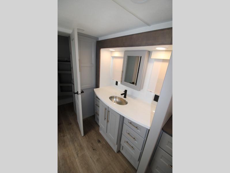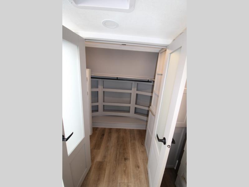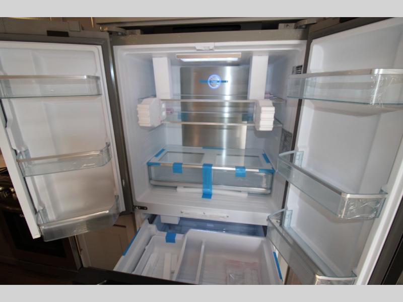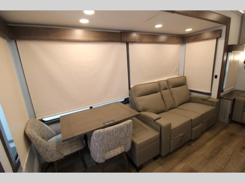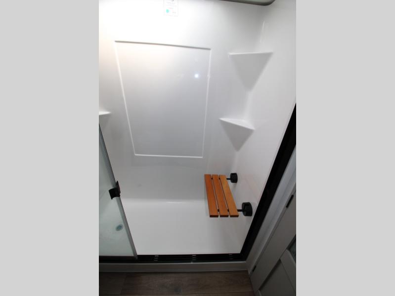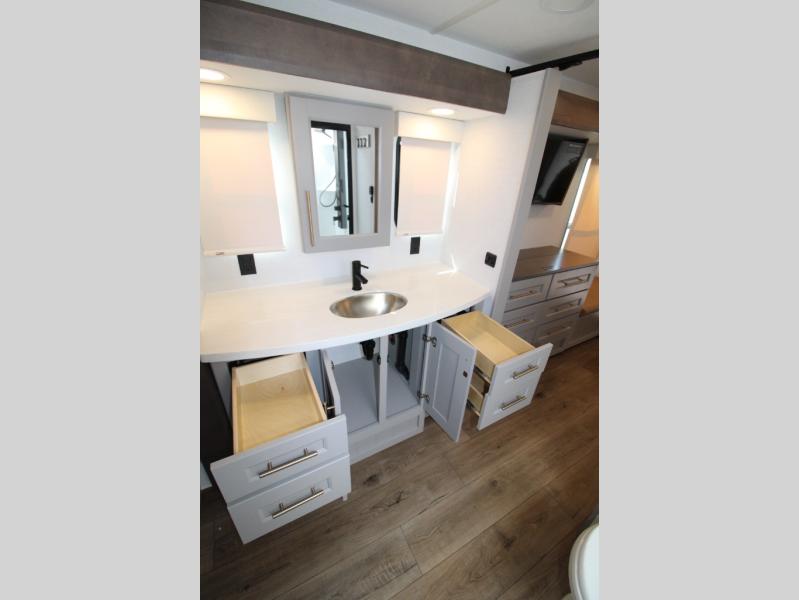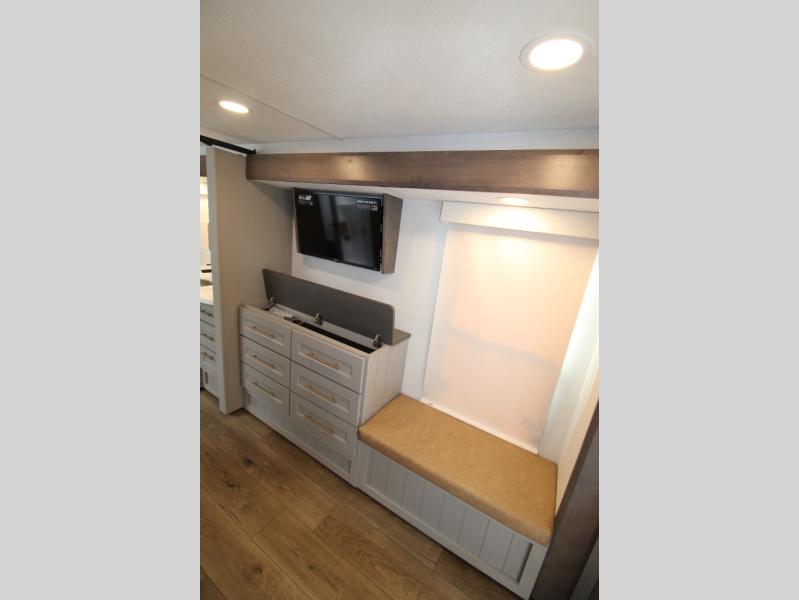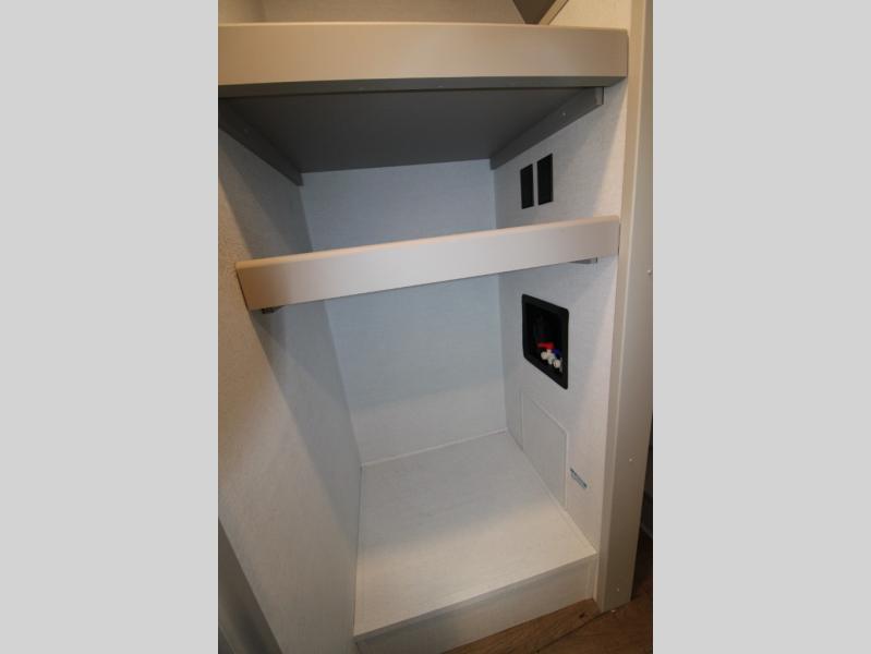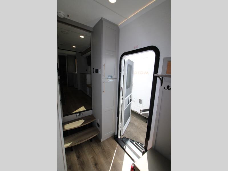 Whether you decide to be a full-timer or a long-trip traveler, this Paradigm offers so many comforts and conveniences you will love! The large full bathroom might be the reason you decide to be a new owner because you will have a large 61" x 30" shower to get cleaned up in, linen storage, and a walk-in closet with a hamper, shelves, and a space prepped for an optional washer/dryer. The bedroom allows you to sleep like a king and gives you extra floor space with the two slides, and there is storage in the flip-top dresser and under the seat, plus you can watch the Smart TV. The space saving sliding doors offer style as well. The cook will love all the residential appliances, including a residential refrigerator. The kitchen island gives you a large sink and dishwasher prep also. The half bath is super convenient just like the entry sitting bench/coat rack and closet. And you can relax on the sleeper sofa, dual recliner love seat, or swivel table and desk.