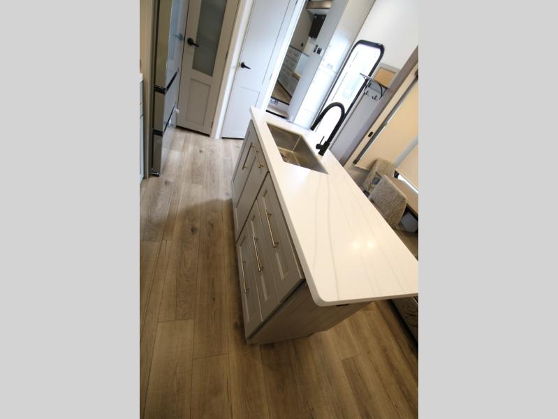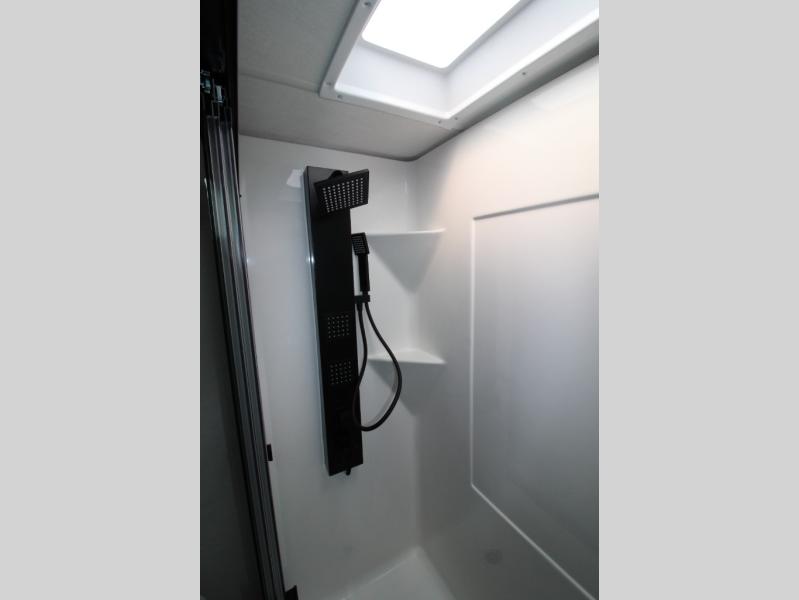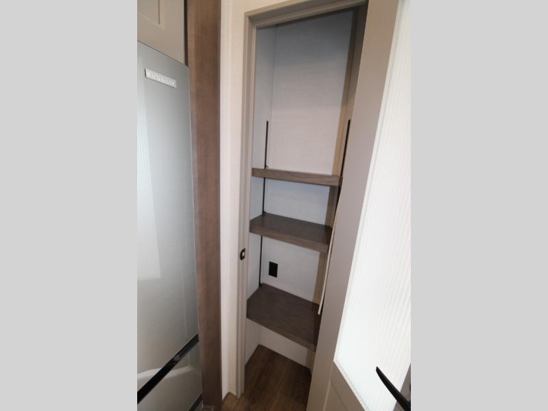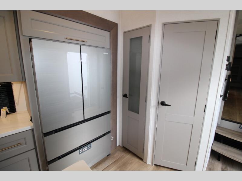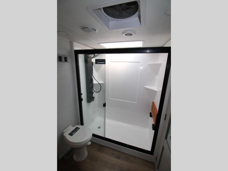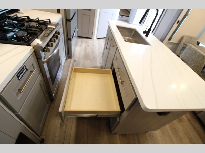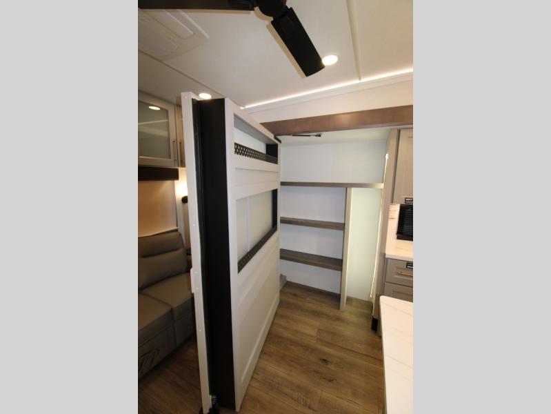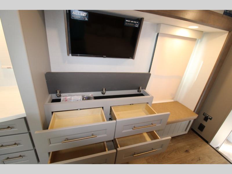 Whether you decide to be a full-timer or a long-trip traveler, this Paradigm offers so many comforts and conveniences you will love! The large full bathroom might be the reason you decide to be a new owner because you will have a large 61" x 30" shower to get cleaned up in, linen storage, and a walk-in closet with a hamper, shelves, and a space prepped for an optional washer/dryer. The bedroom allows you to sleep like a king and gives you extra floor space with the two slides, and there is storage in the flip-top dresser and under the seat, plus you can watch the Smart TV. The space saving sliding doors offer style as well. The cook will love all the residential appliances, including a residential refrigerator. The kitchen island gives you a large sink and dishwasher prep also. The half bath is super convenient just like the entry sitting bench/coat rack and closet. And you can relax on the sleeper sofa, dual recliner love seat, or swivel table and desk.