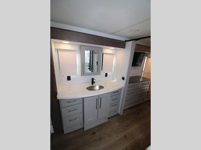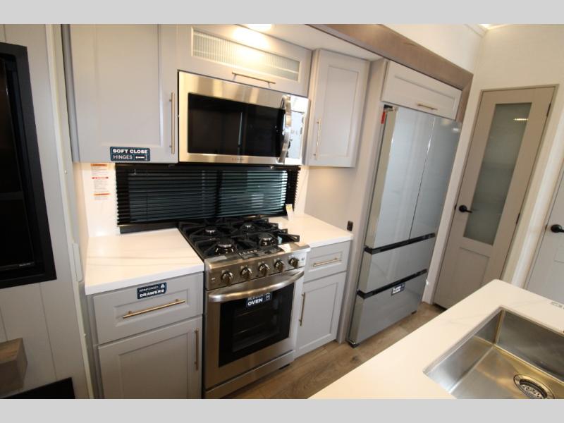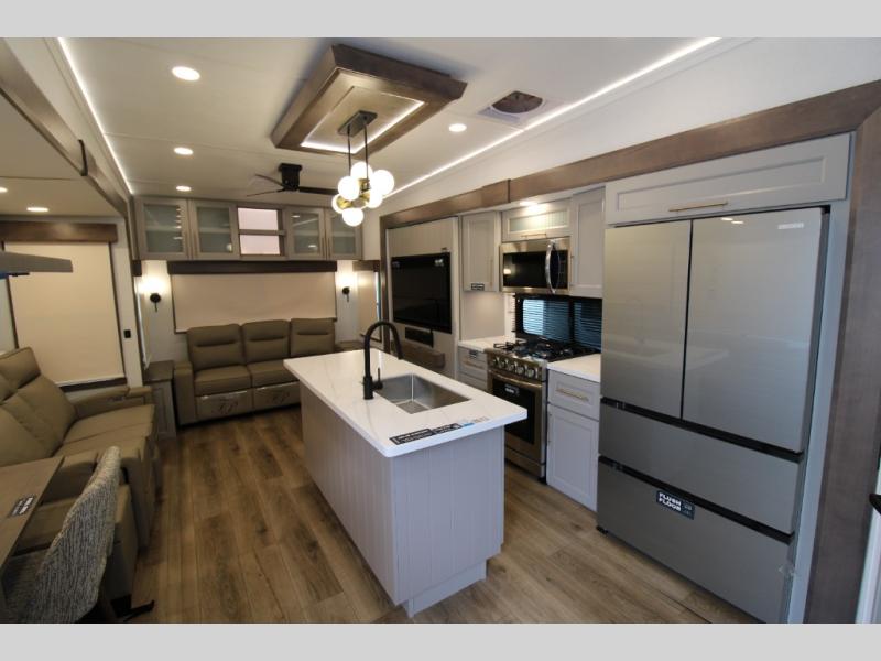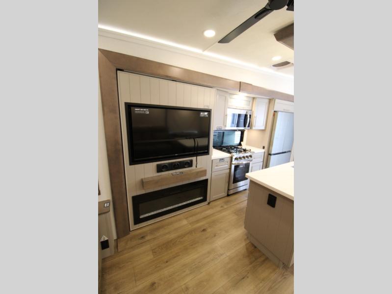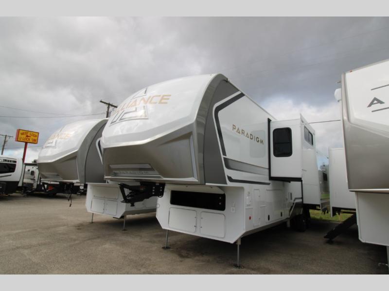The Paradigm fifth wheels by Alliance RV are functional, high-quality, and luxurious for an unforgettable camping experience. There are three A/C units and a 40K BTU furnace to keep you comfortable year around, and you'll appreciate additional convenient amenities, like the all-in-one enclosed/heated utility center and the color coded and numbered wiring. A Helux Series coil spring pin box comes standard for hassle-free towing, along with Curt 8,000 lb. axles. You'll love the kitchen with its LG solid surface countertops and Lusso range, plus there is LED motion lighting in the pantry and a Maxx fan with a rain sensor to keep everything fresh when making dinner. Each model also includes an HD Smart TV in the living room and bedroom. And of course there are a variety of options you can choose from to further customize your fifth wheel; dual pane windows, Super Solar Plus, slide out awning toppers, and generator prep or a generator to name a few!
