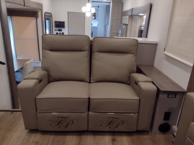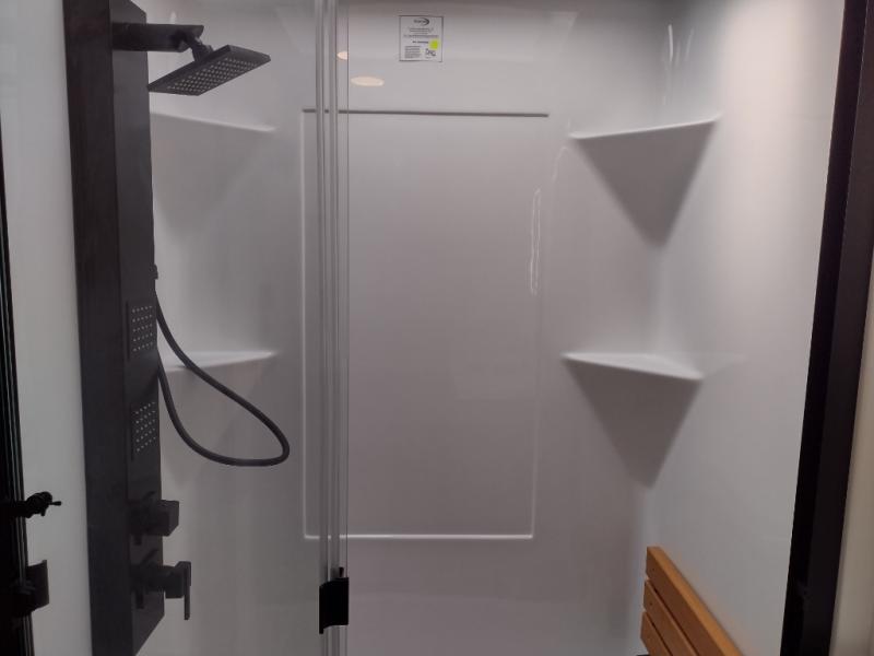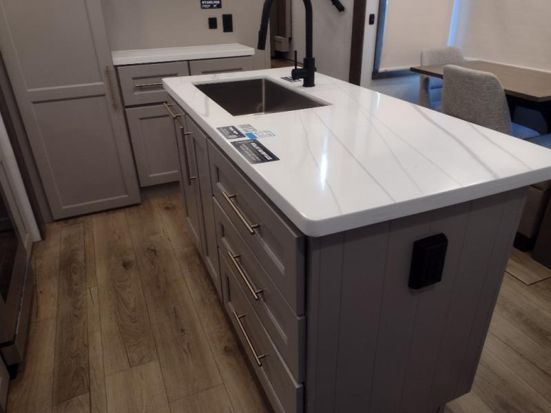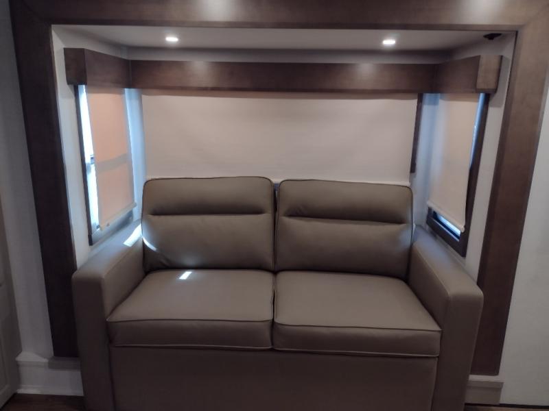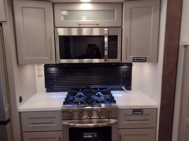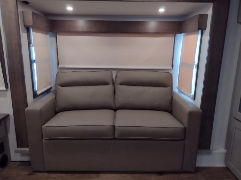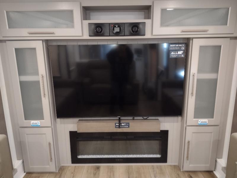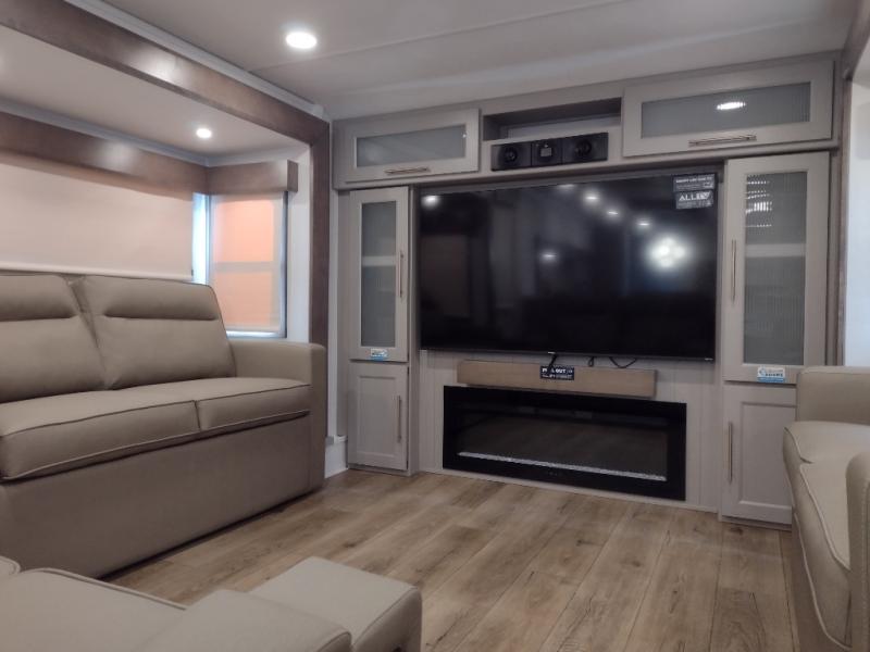 An active family will want this fifth wheel with its 48" x 115" exterior basement pull-out tray for kayaks or extra storage. Just above this area is the master suite with a rear bathroom that offers a residential shower, a porcelain toilet with soft close seat, plus a wardrobe and shelf storage. The king bed slide gives you more floor space, and you will have a seat, a flip-top dresser, and a Smart TV to watch movies in bed. The half bath is next to the main entry which is super convenient, and the middle kitchen is separate from the front living area. The cook will love the residential microwave, range and oven, plus the 19 cu. ft. 12 volt residential refrigerator. There is also a pantry and extra counter space on the kitchen island with a large sink. The views out of the atrium windows in the slide out, which includes the swivel table and desk, are a must see. And when you need to watch the big game, the 55" Smart TV with a pull-out fireplace storage are up front with the dual recliner love seat and two sleeper sofas.
