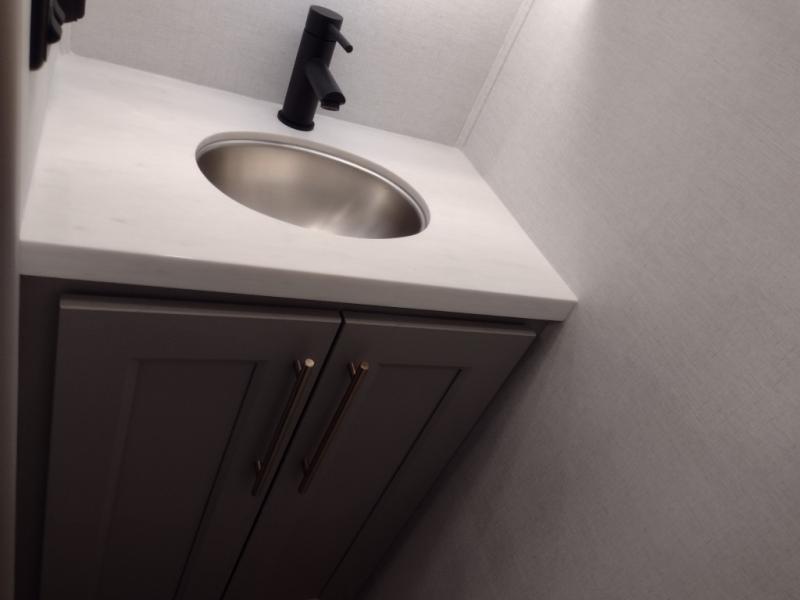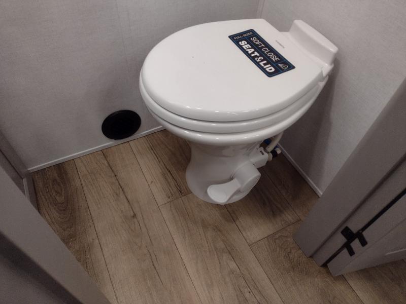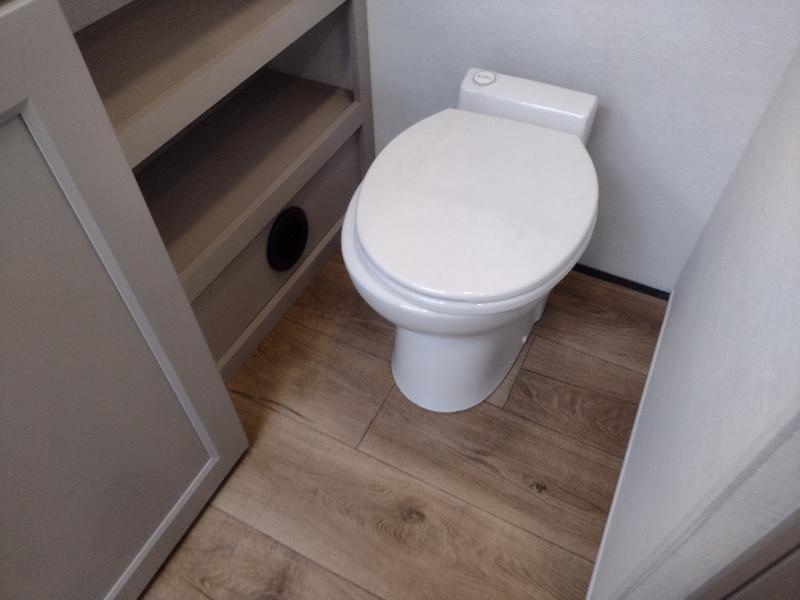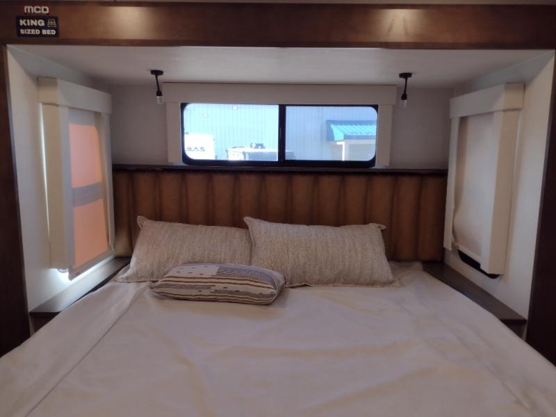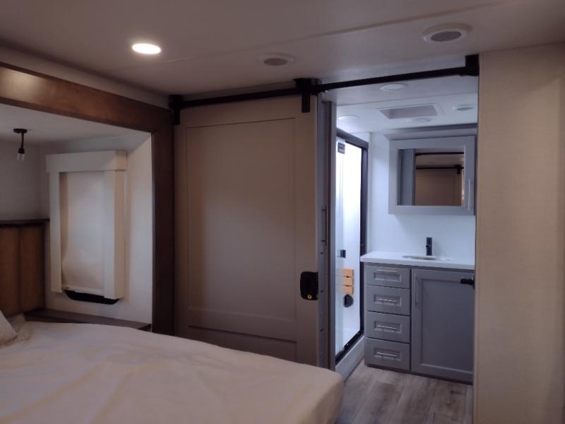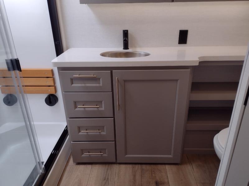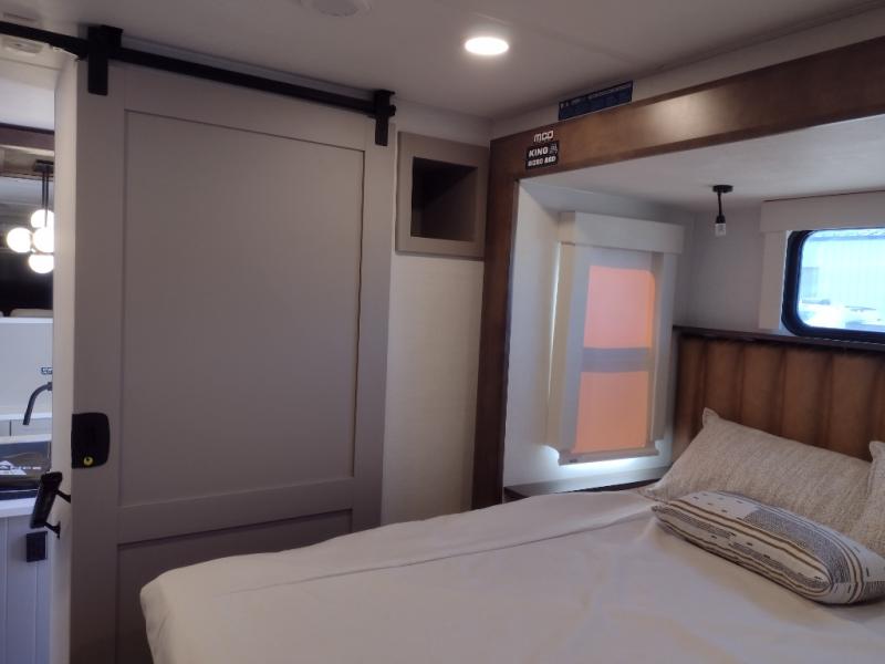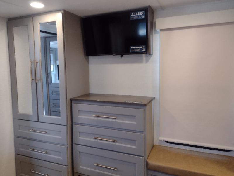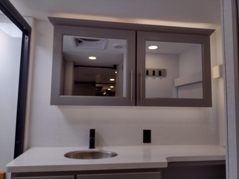 An active family will want this fifth wheel with its 48" x 115" exterior basement pull-out tray for kayaks or extra storage. Just above this area is the master suite with a rear bathroom that offers a residential shower, a porcelain toilet with soft close seat, plus a wardrobe and shelf storage. The king bed slide gives you more floor space, and you will have a seat, a flip-top dresser, and a Smart TV to watch movies in bed. The half bath is next to the main entry which is super convenient, and the middle kitchen is separate from the front living area. The cook will love the residential microwave, range and oven, plus the 19 cu. ft. 12 volt residential refrigerator. There is also a pantry and extra counter space on the kitchen island with a large sink. The views out of the atrium windows in the slide out, which includes the swivel table and desk, are a must see. And when you need to watch the big game, the 55" Smart TV with a pull-out fireplace storage are up front with the dual recliner love seat and two sleeper sofas.