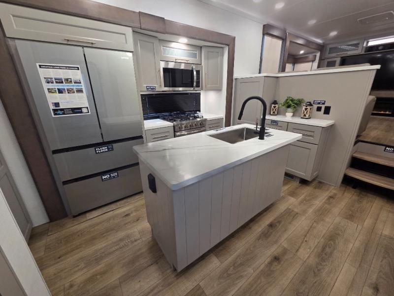 An active family will want this fifth wheel with its 48" x 115" exterior basement pull-out tray for kayaks or extra storage. Just above this area is the master suite with a rear bathroom that offers a residential shower, a porcelain toilet with soft close seat, plus a wardrobe and shelf storage. The king bed slide gives you more floor space, and you will have a seat, a flip-top dresser, and a Smart TV to watch movies in bed. The half bath is next to the main entry which is super convenient, and the middle kitchen is separate from the front living area. The cook will love the residential microwave, range and oven, plus the 19 cu. ft. 12 volt residential refrigerator. There is also a pantry and extra counter space on the kitchen island with a large sink. The views out of the atrium windows in the slide out, which includes the swivel table and desk, are a must see. And when you need to watch the big game, the 55" Smart TV with a pull-out fireplace storage are up front with the dual recliner love seat and two sleeper sofas.
