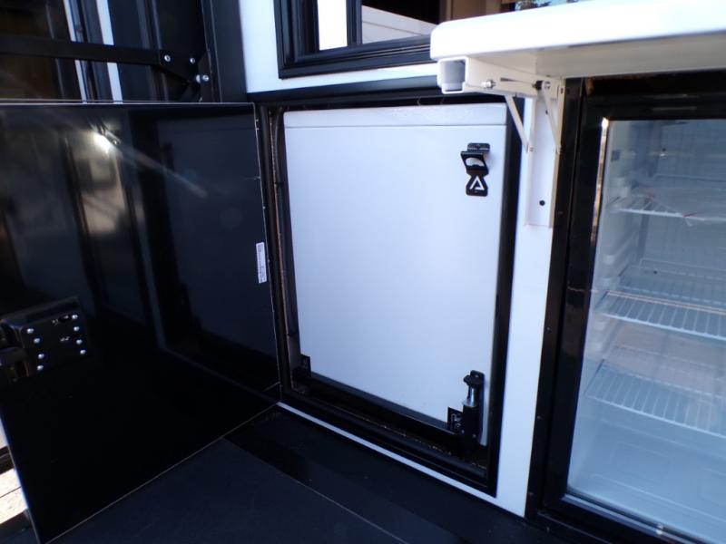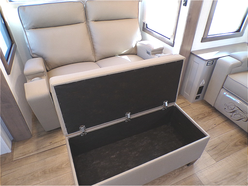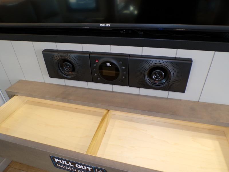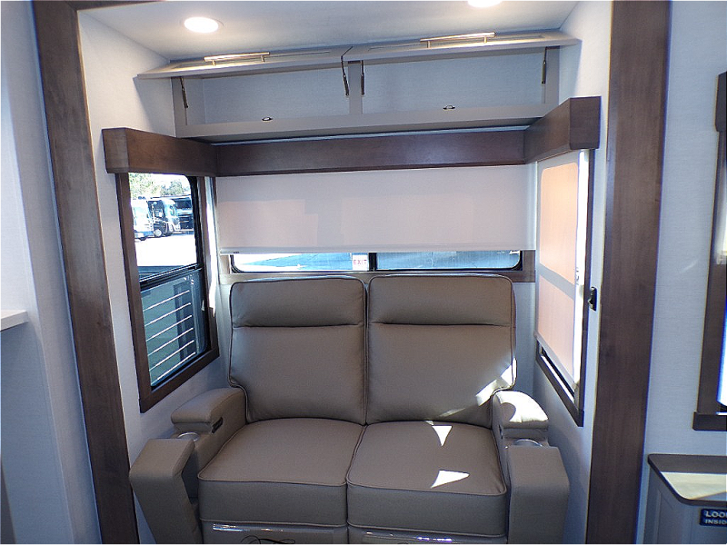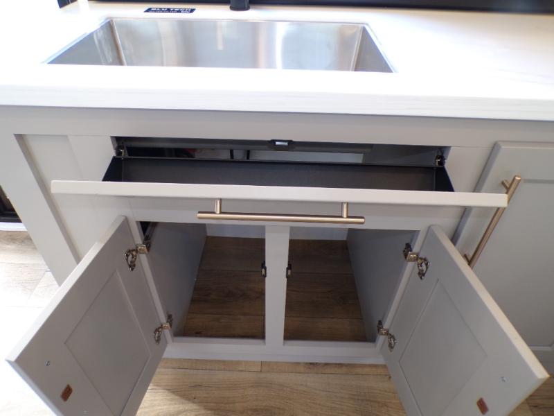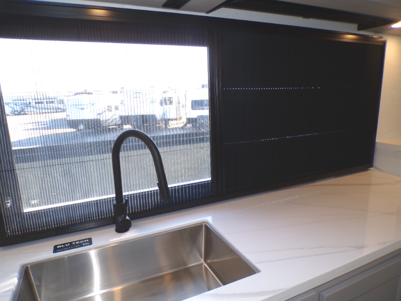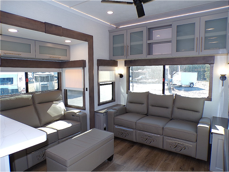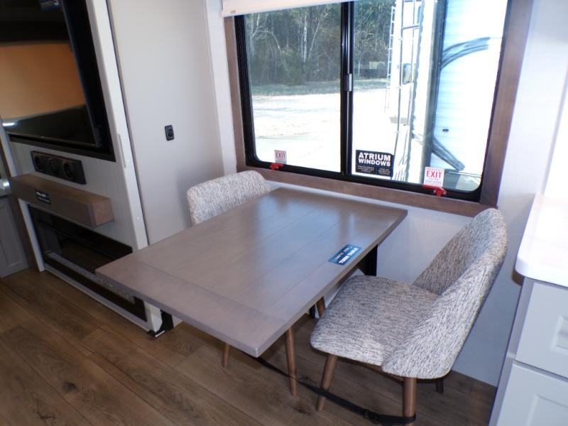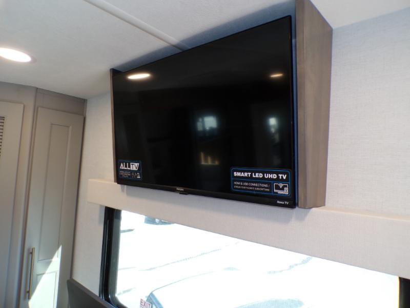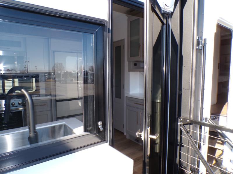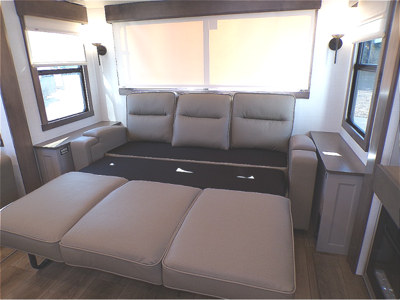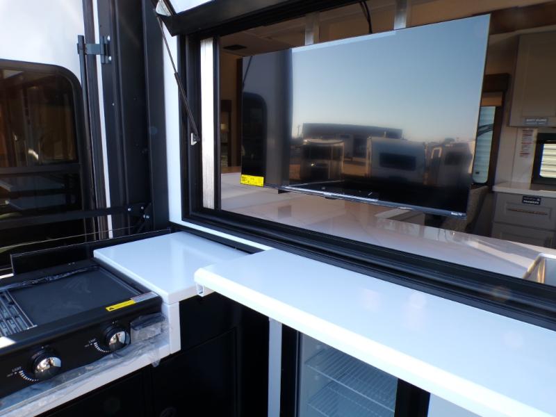 You will fall in love with this unit’s slide patio with picture window, the perfect spot to take in the breathtaking views. Enjoy outdoor cooking with the countertop prep area and pull-out grill, while the drop-down TV provides entertainment for all. Inside, rear living area features two sleeper sofas, perfect for lounging and relaxing. Overhead cabinets provide ample storage, while the 50” class smart TV offers endless entertainment options. Gather around the turn table dinette for meals or socializing. The kitchen is fully equipped with a microwave, sink, refrigerator, pantry, and hutch, making meal preparation and storage a breeze. Also this unit has a full bathroom and a cozy front bedroom which boast a king bed, ample closet, a TV, and so much more!