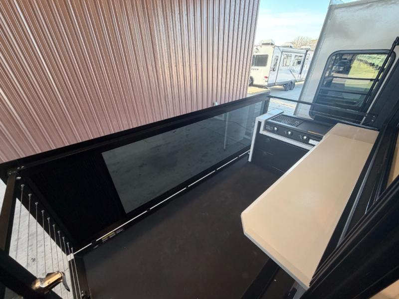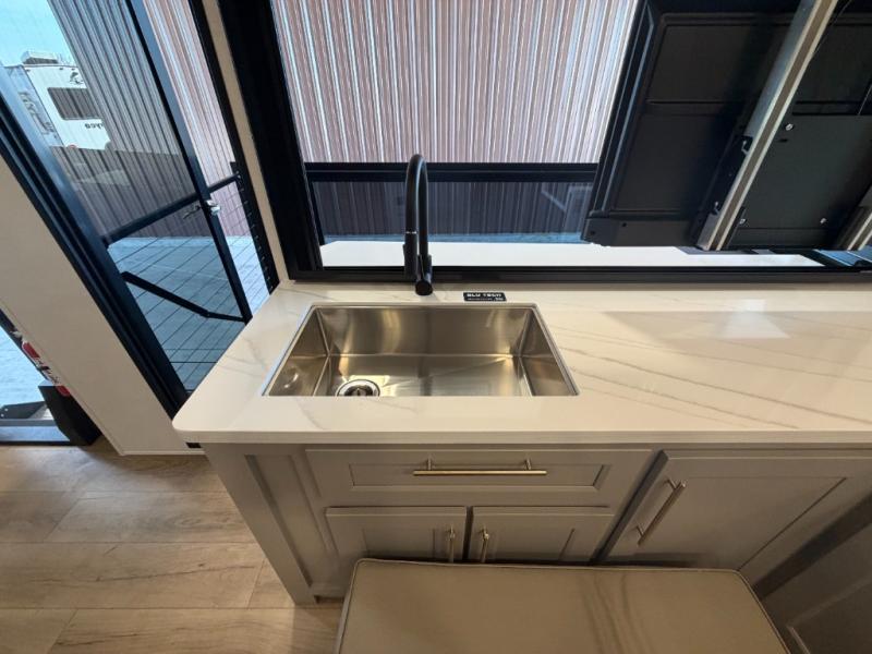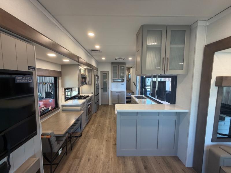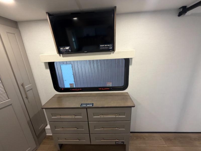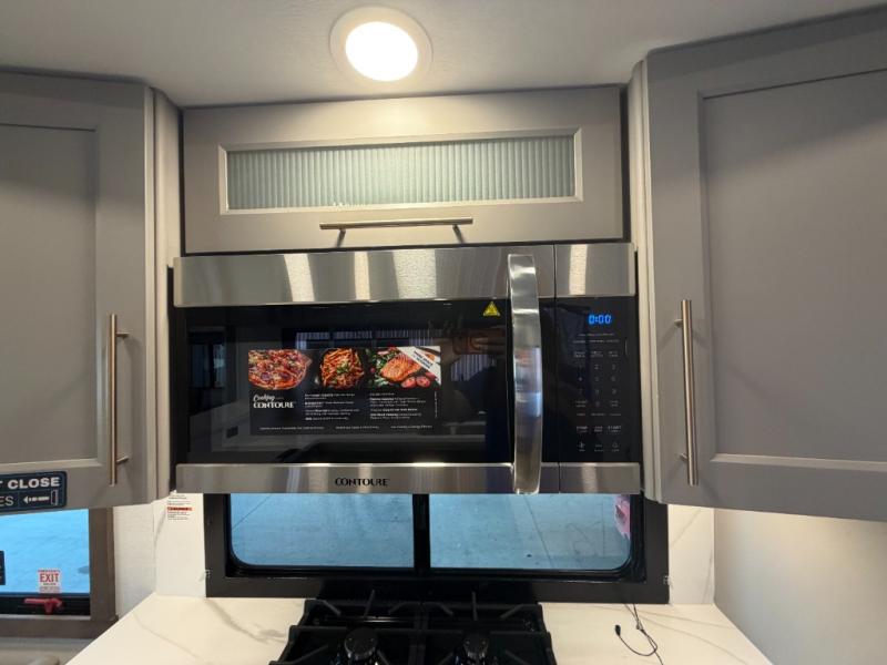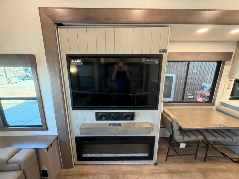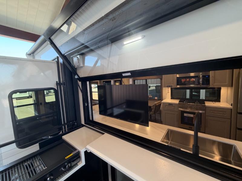 You will fall in love with this unit’s slide patio with picture window, the perfect spot to take in the breathtaking views. Enjoy outdoor cooking with the countertop prep area and pull-out grill, while the drop-down TV provides entertainment for all. Inside, rear living area features two sleeper sofas, perfect for lounging and relaxing. Overhead cabinets provide ample storage, while the 50” class smart TV offers endless entertainment options. Gather around the turn table dinette for meals or socializing. The kitchen is fully equipped with a microwave, sink, refrigerator, pantry, and hutch, making meal preparation and storage a breeze. Also this unit has a full bathroom and a cozy front bedroom which boast a king bed, ample closet, a TV, and so much more!