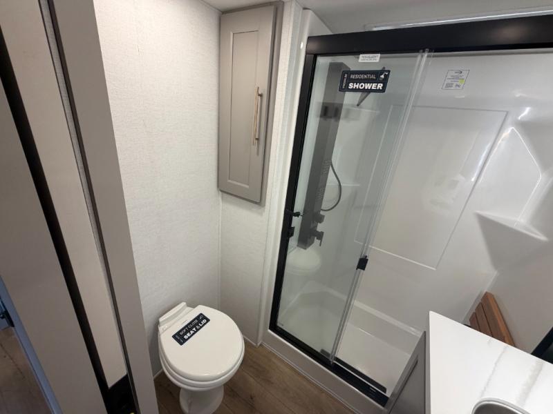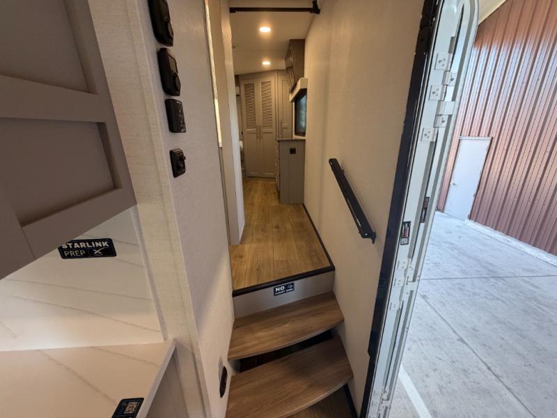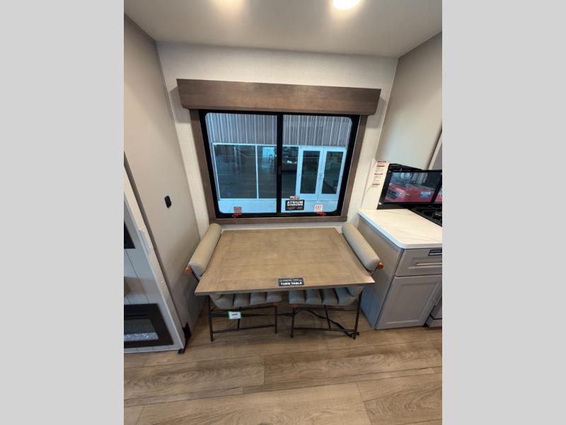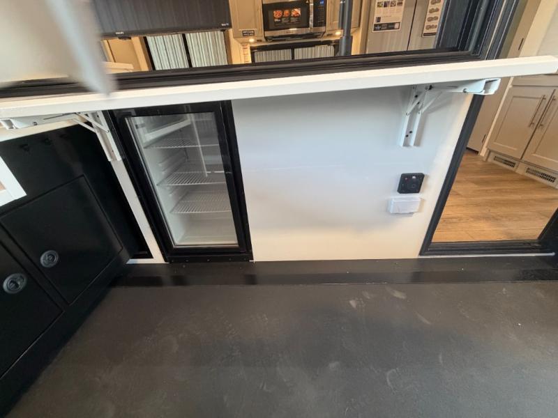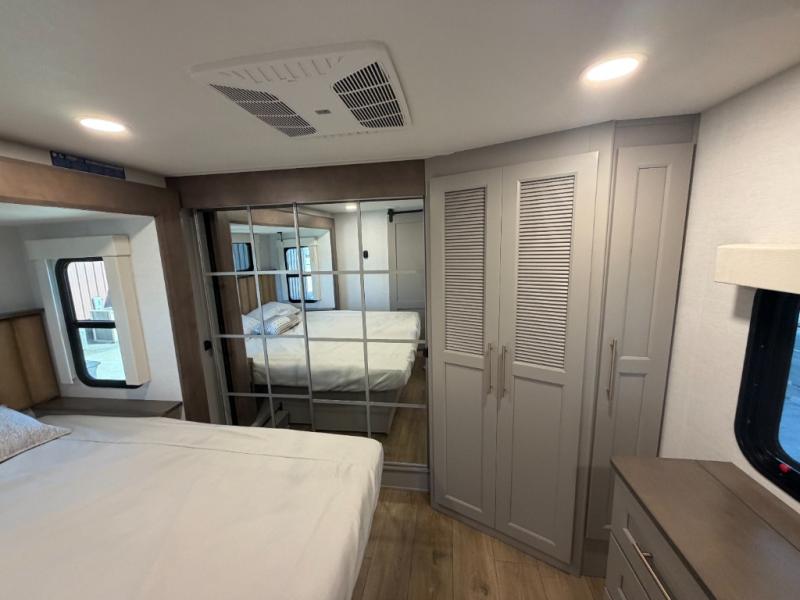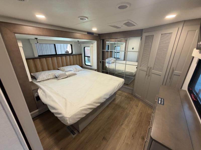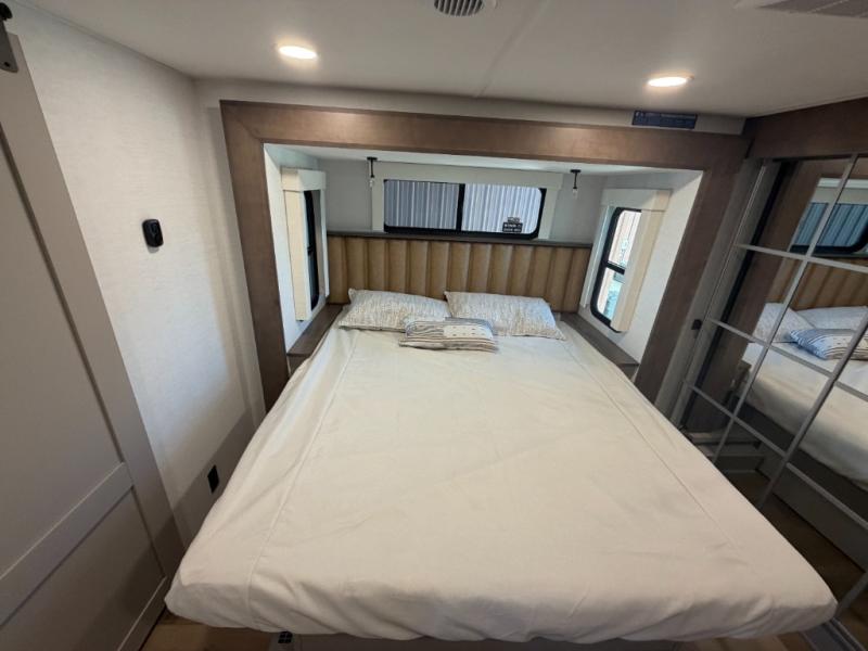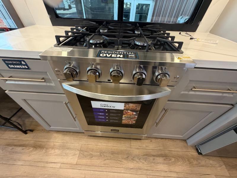 You will fall in love with this unit’s slide patio with picture window, the perfect spot to take in the breathtaking views. Enjoy outdoor cooking with the countertop prep area and pull-out grill, while the drop-down TV provides entertainment for all. Inside, rear living area features two sleeper sofas, perfect for lounging and relaxing. Overhead cabinets provide ample storage, while the 50” class smart TV offers endless entertainment options. Gather around the turn table dinette for meals or socializing. The kitchen is fully equipped with a microwave, sink, refrigerator, pantry, and hutch, making meal preparation and storage a breeze. Also this unit has a full bathroom and a cozy front bedroom which boast a king bed, ample closet, a TV, and so much more!