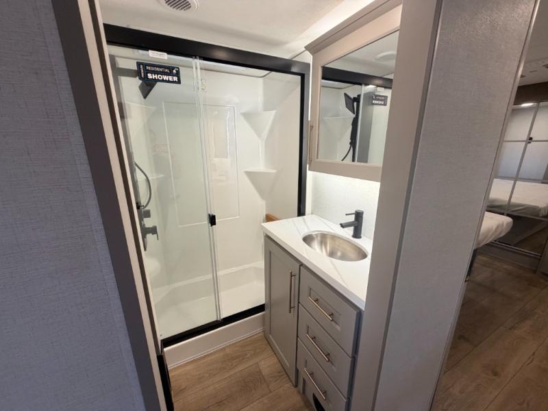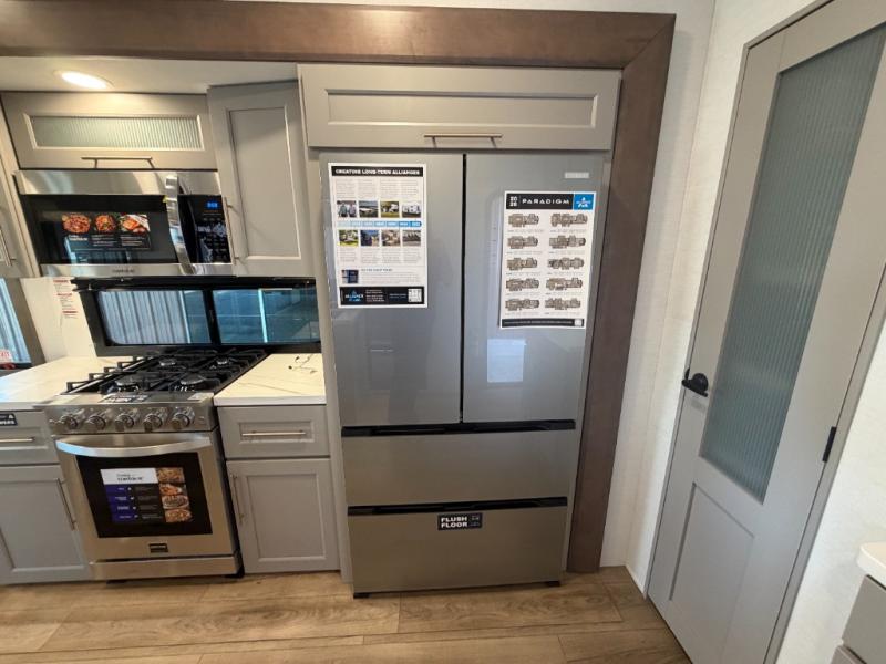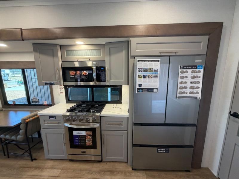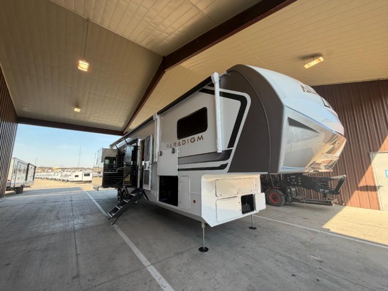 The Paradigm fifth wheels by Alliance RV are functional, high-quality, and luxurious for an unforgettable camping experience. There are three A/C units and a 40K BTU furnace to keep you comfortable year around, and you'll appreciate additional convenient amenities, like the all-in-one enclosed/heated utility center and the color coded and numbered wiring. A Helux Series coil spring pin box comes standard for hassle-free towing, along with Curt 8,000 lb. axles. You'll love the kitchen with its LG solid surface countertops and Lusso range, plus there is LED motion lighting in the pantry and a Maxx fan with a rain sensor to keep everything fresh when making dinner. Each model also includes an HD Smart TV in the living room and bedroom. And of course there are a variety of options you can choose from to further customize your fifth wheel; dual pane windows, Super Solar Plus, slide out awning toppers, and generator prep or a generator to name a few!