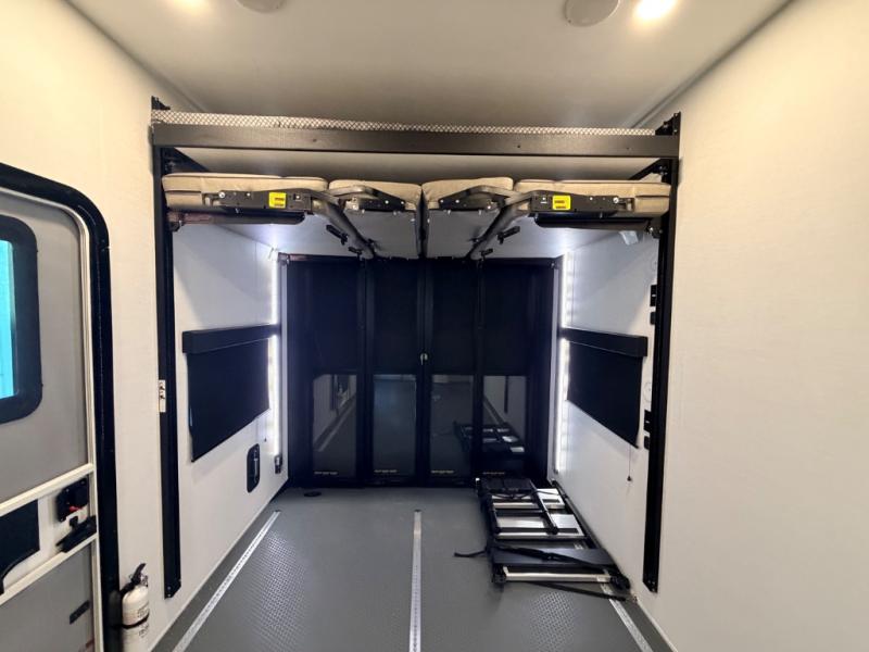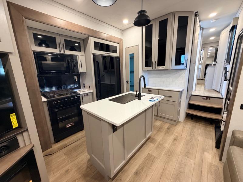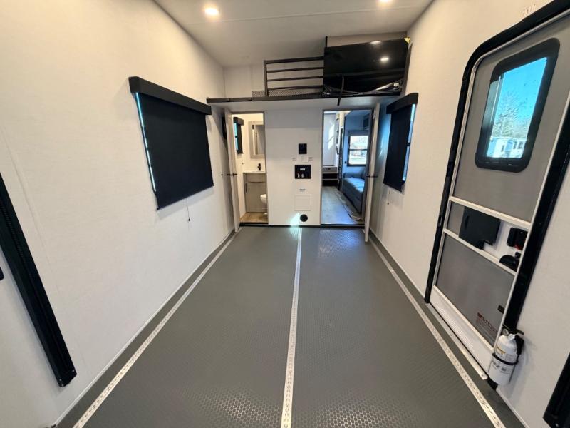 You can bring your toys with you wherever you go with any one of these Alliance RV Valor toy hauler fifth wheels! They are adventure-ready with a quality build from the walk on roof with seamless PVC roof covering to the commercial grade vinyl flooring and MorRyde CRE3000 suspension system. The Performance Running Gear package comes with a 101" wide-body benchmark chassis platform, 7,000 lb. Dexter axles, and a space enhancing drop frame storage compartment to pack in all your riding gear. You can even go off-gridding thanks to the Off the Grid Pack that has two 400 watt solar panels, generator prep, a 40 amp charge controller, and a 100 amp hour lithium iron phosphate battery. Some of the interior comforts you will enjoy are the hardwood cabinet doors and drawers, solid surface kitchen countertops, and commercial grade vinyl flooring with no carpet to make clean up a breeze. The Valor toy haulers are also the Masters of 12 Volt with USB charging station throughout, a stainless steel refrigerator, and more 12 volt features to make camping hassle-free!
