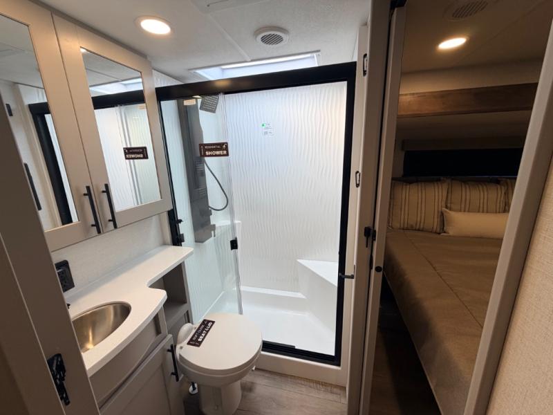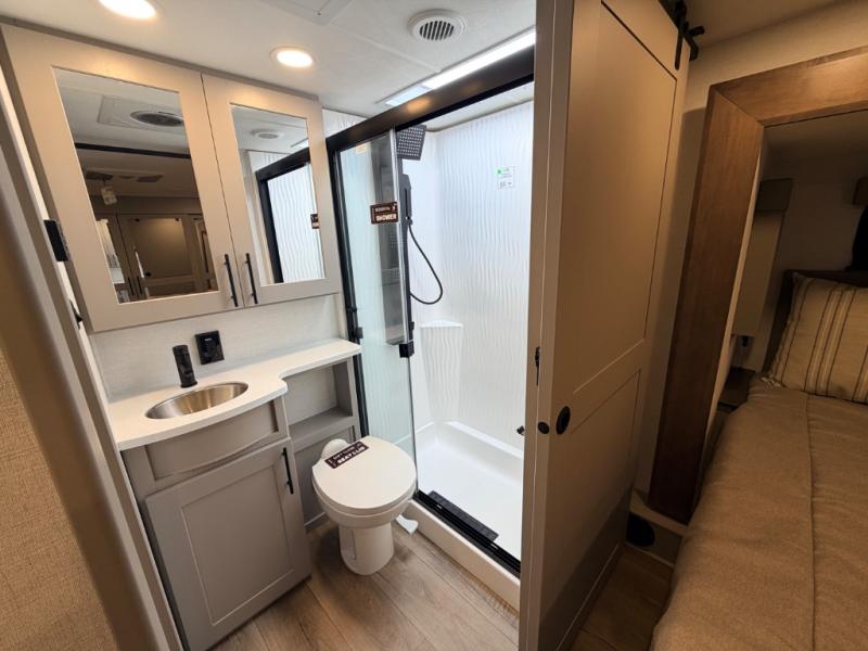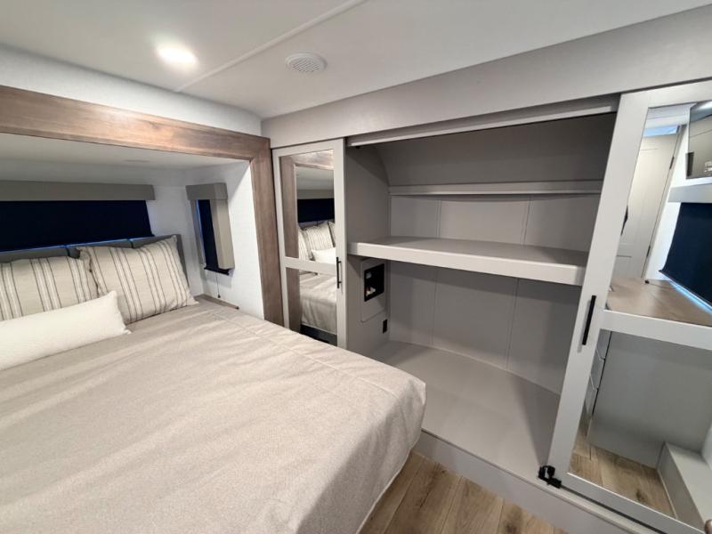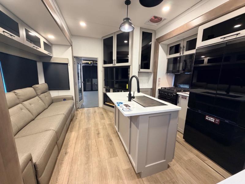 You can easily load up your toys into the 16' garage area of this toy hauler with the 8' weather resistant ramp door and keep them filled with the dual 30 gallon fuel tanks! Once you unload your toys from the garage area, you can set up the opposing HappiJac sofas with a queen mattress above them, the loft that opens to the garage, and the half bathroom. The kitchen has everything you need to prepare your best meals including two hutches, three pantries, and a kitchen island with two bar stools to enjoy your morning coffee and eggs. The dual entry bathroom has a 48" x 30" shower and leads directly into the front private bedroom. Inside the bedroom, a king bed slide allows for more floor space. There is also a flip top dresser, and a front wardrobe with washer and dryer prep.