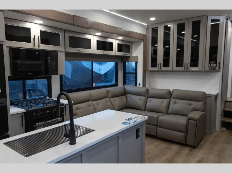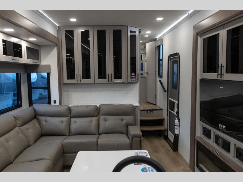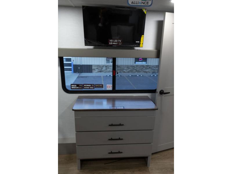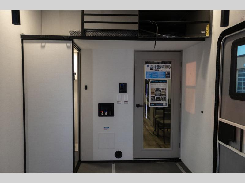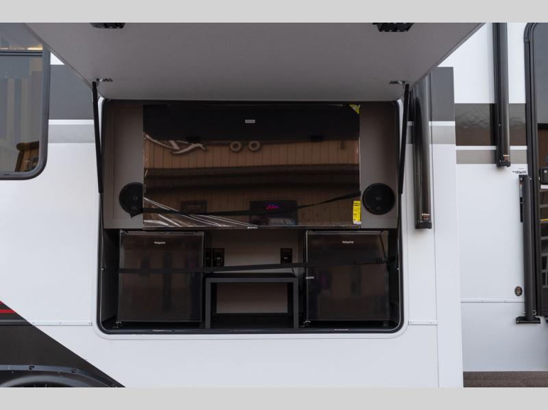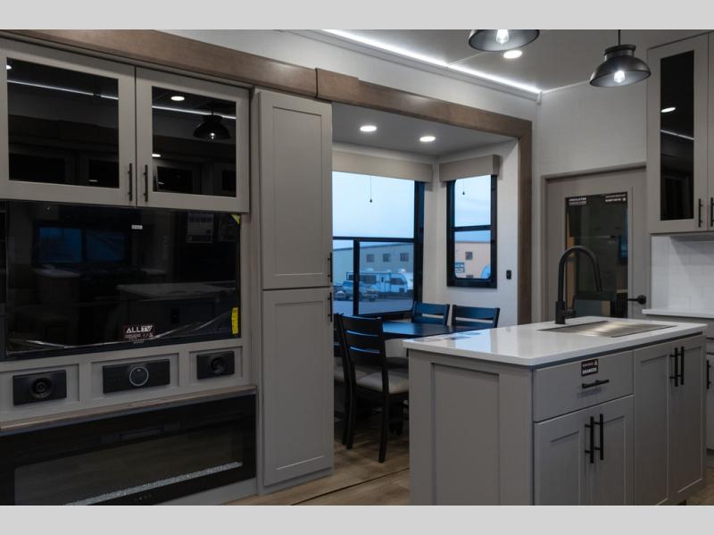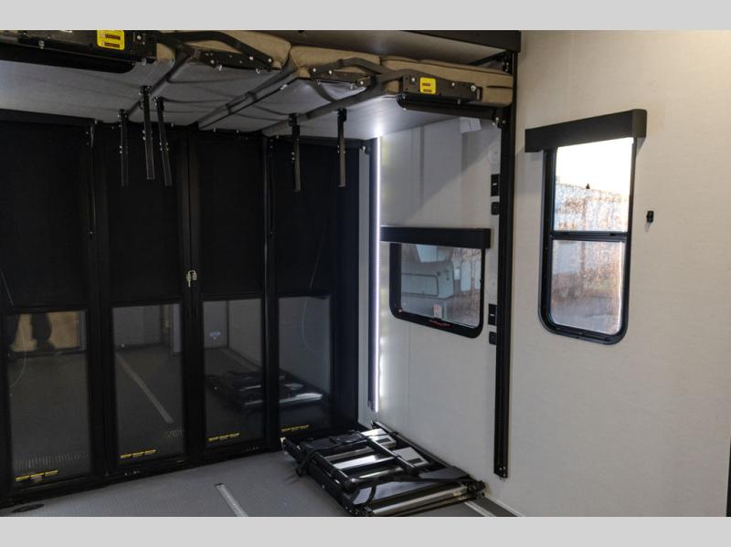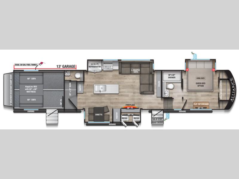 You can bring your toys with you wherever you go with any one of these Alliance RV Valor toy hauler fifth wheels! They are adventure-ready with a quality build from the walk on roof with seamless PVC roof covering to the commercial grade vinyl flooring and MorRyde CRE3000 suspension system. The Performance Running Gear package comes with a 101" wide-body benchmark chassis platform, 7,000 lb. Dexter axles, and a space enhancing drop frame storage compartment to pack in all your riding gear. You can even go off-gridding thanks to the Off the Grid Pack that has two 400-watt solar panels, generator prep, a 60-amp charge controller, and a 100-amp hour lithium iron phosphate battery. Some of the interior comforts you will enjoy are the hardwood cabinet doors and drawers, solid surface kitchen countertops, and commercial grade vinyl flooring with no carpet to make clean up a breeze. The Valor toy haulers are also the Masters of 12 Volt with USB charging station throughout, a 12V refrigerator, and more 12-volt features to make camping hassle-free!