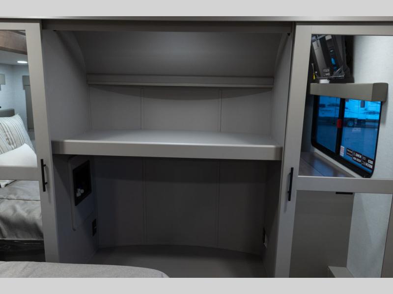 You can easily load up your toys into the 16' garage area of this toy hauler with the 8' weather resistant ramp door and keep them filled with the dual 30 gallon fuel tanks! Once you unload your toys from the garage area, you can set up the opposing HappiJac sofas with a queen mattress above them, the loft that opens to the garage, and the half bathroom. The kitchen has everything you need to prepare your best meals including two hutches, three pantries, and a kitchen island with two bar stools to enjoy your morning coffee and eggs. The dual entry bathroom has a 48" x 30" shower and leads directly into the front private bedroom. Inside the bedroom, a king bed slide allows for more floor space. There is also a flip top dresser, and a front wardrobe with washer and dryer prep.