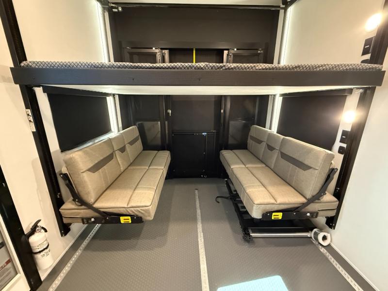14 ft toy garage space with HappiJac roll-over sofas and queen bed above them