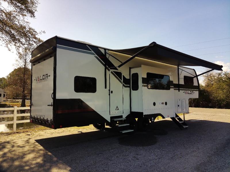 With any Valor All-Access toy hauler by Alliance RV you will be getting a travel trailer or fifth wheel with exceptional features at a great value! There is a painted fiberglass front cap, Mylar reinforced exterior seals, Azdel-backed fiberglass sidewalls, and a walk-on roof with a seamless PVC roof covering for added strength and durability. The 101" wide-body Benchmark chassis means you can bring along your larger toys, and the multipoint tie-down system will keep your toys safe and secure on the way to the campground. All of your power needs will be met with the Masters of 12 Volt Package that includes a 12V JBL sound system and USB charging stations throughout, plus the Off The Grid Pack comes with a 400 watt solar panel, 40 amp charge controller, and generator prep to keep you going all week long. Some of the interior comforts you'll enjoy are commercial grade vinyl flooring with no carpet so you can easily clean up, black cabinetry hardware, residential LED recessed ceiling lights, and so much more!