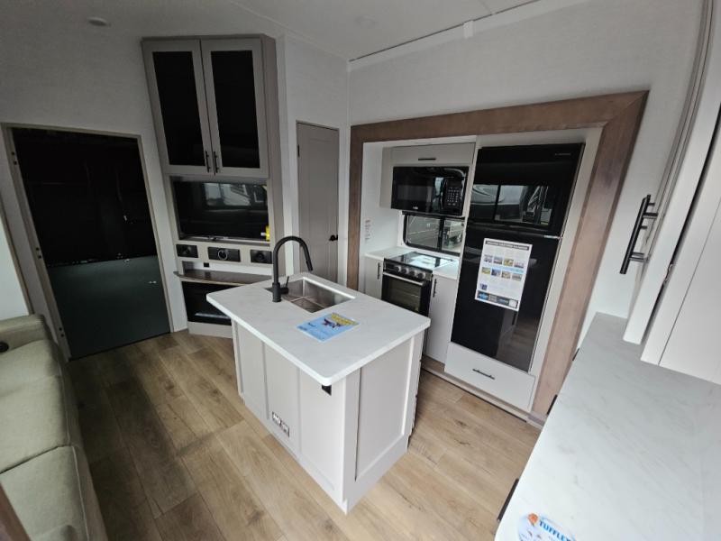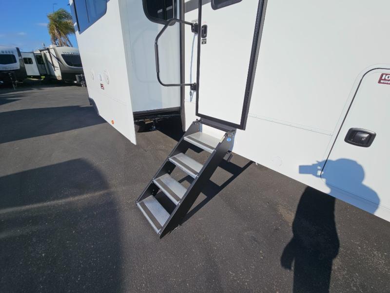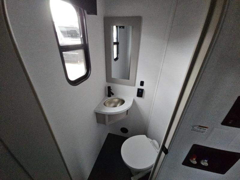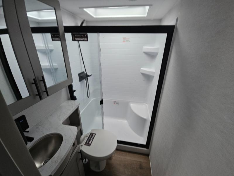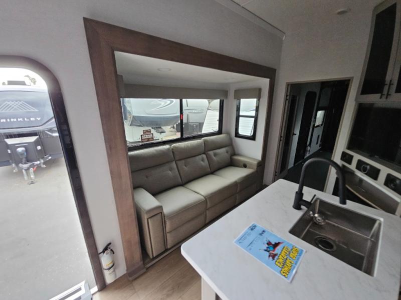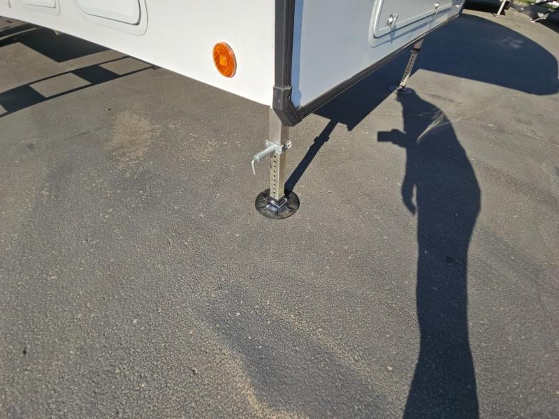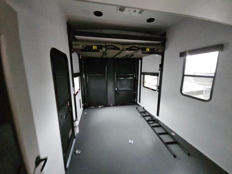 If you're needing more space for your toys, this toy hauler will meet your needs with a 14' separate garage! Once your toys are unloaded using the weather resistant ramp door, relax on the HappiJac roll-over sofas with a folding table in between, and this area can become your guests' bedroom at night since there is a drop-down queen bed, a half bath, plus an additional 30" x 72" bunk/loft bed. You will have the front bedroom all to yourselves that includes a king bed with an optional queen bed plus a wardrobe slide out to keep your space tidy. Everyone can meet in the main living area/kitchen for movie night with the HDTV and sofa slide out, while the chef of makes dinner on the three-burner cooktop. There is also a hutch and pantry for storage and a kitchen island for more counter space!