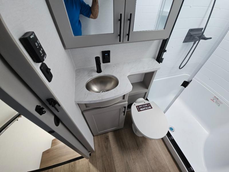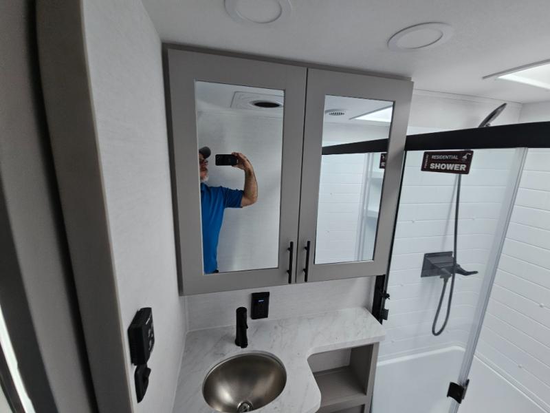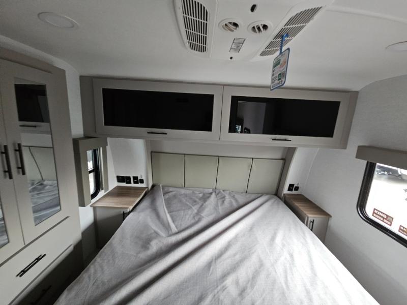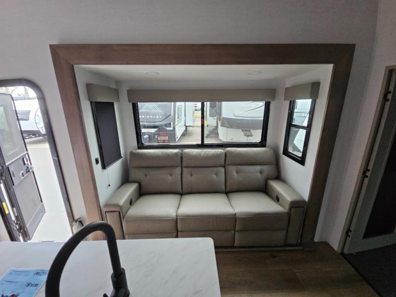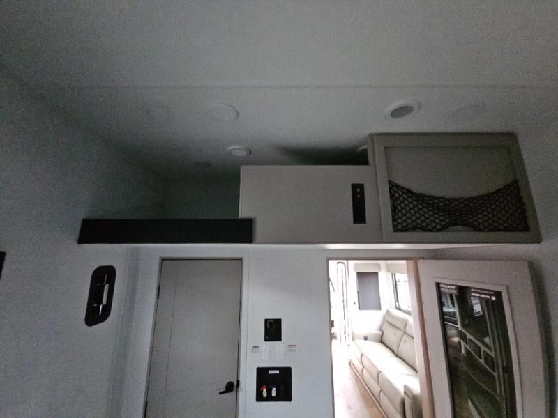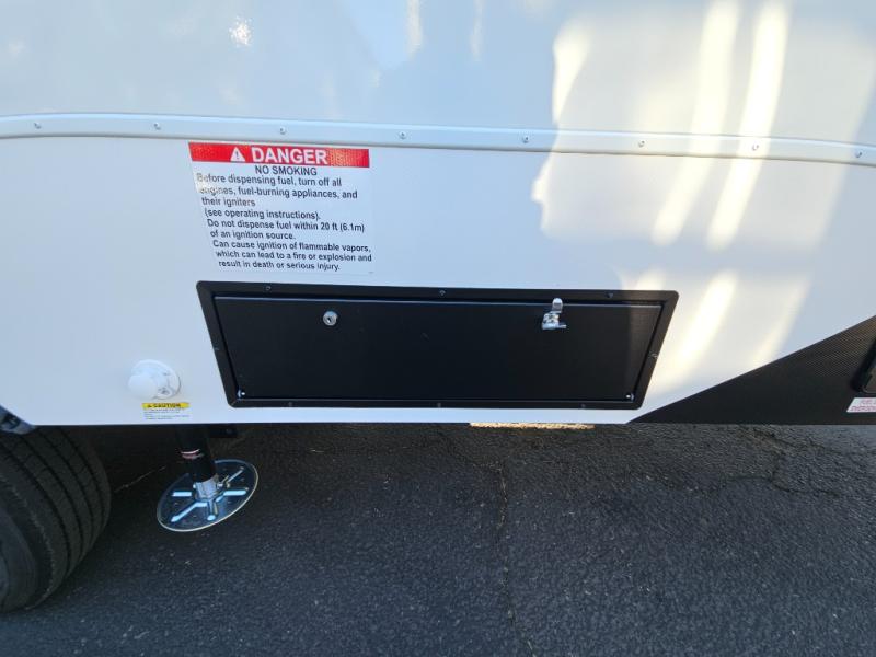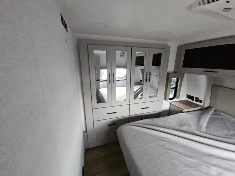 If you're needing more space for your toys, this toy hauler will meet your needs with a 14' separate garage! Once your toys are unloaded using the weather resistant ramp door, relax on the HappiJac roll-over sofas with a folding table in between, and this area can become your guests' bedroom at night since there is a drop-down queen bed, a half bath, plus an additional 30" x 72" bunk/loft bed. You will have the front bedroom all to yourselves that includes a king bed with an optional queen bed plus a wardrobe slide out to keep your space tidy. Everyone can meet in the main living area/kitchen for movie night with the HDTV and sofa slide out, while the chef of makes dinner on the three-burner cooktop. There is also a hutch and pantry for storage and a kitchen island for more counter space!