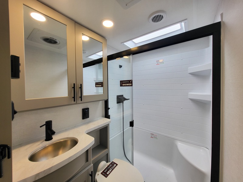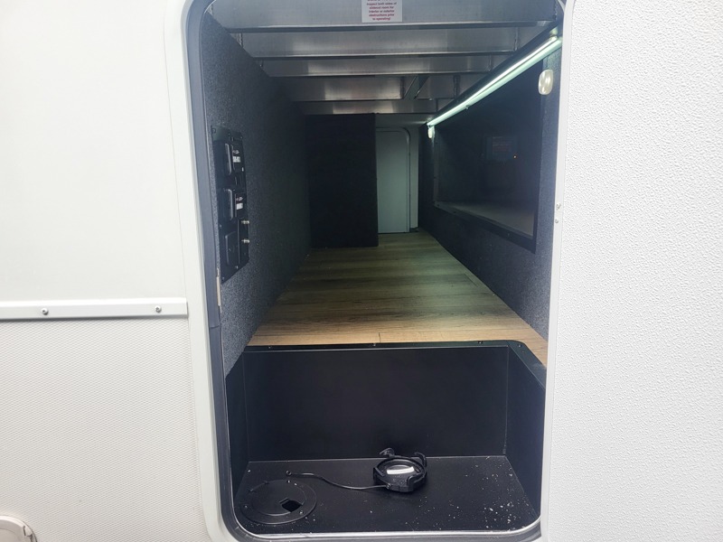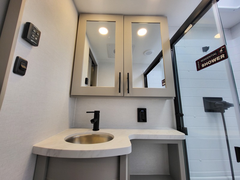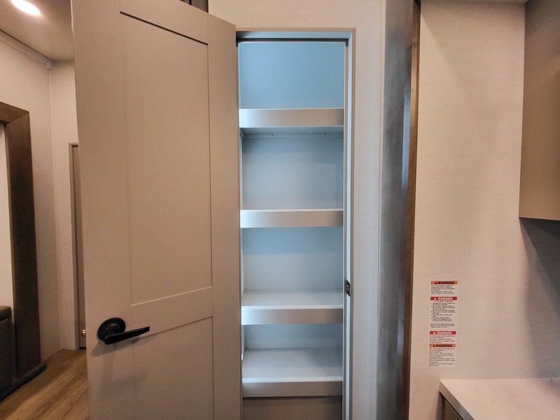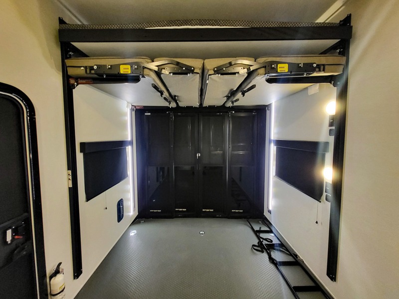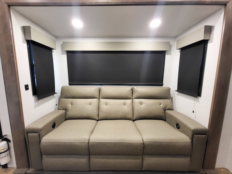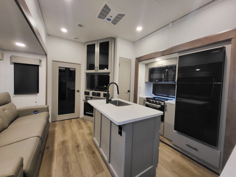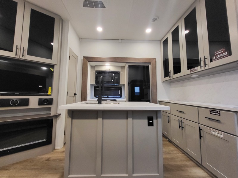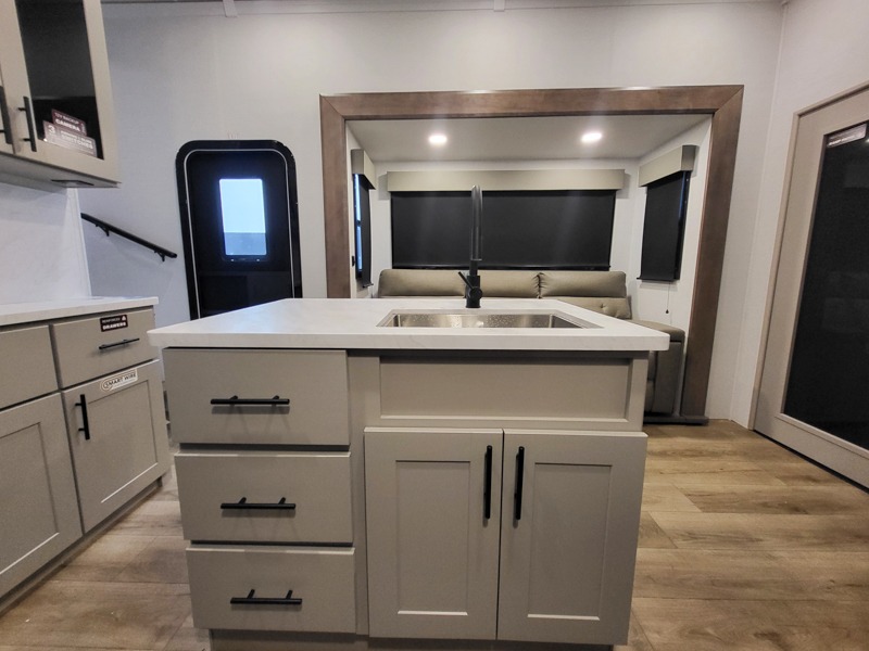 If you're needing more space for your toys, this toy hauler will meet your needs with a 14' separate garage! Once your toys are unloaded using the weather resistant ramp door, relax on the HappiJac roll-over sofas with a folding table in between, and this area can become your guests' bedroom at night since there is a drop-down queen bed, a half bath, plus an additional 30" x 72" bunk/loft bed. You will have the front bedroom all to yourselves that includes a king bed with an optional queen bed plus a wardrobe slide out to keep your space tidy. Everyone can meet in the main living area/kitchen for movie night with the HDTV and sofa slide out, while the chef of makes dinner on the three burner cooktop. There is also a hutch and pantry for storage and a kitchen island for more counter space!