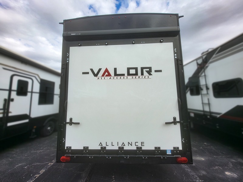 With any Valor All-Access toy hauler by Alliance RV you will be getting a travel trailer or fifth wheel with exceptional features at a great value! There is a painted fiberglass front cap, Mylar reinforced exterior seals, Azdel-backed fiberglass sidewalls, and a walk-on roof with a seamless PVC roof covering for added strength and durability. The 101" wide-body Benchmark chassis means you can bring along your larger toys, and the multipoint tie-down system will keep your toys safe and secure on the way to the campground. All of your power needs will be met with the Masters of 12 Volt Package that includes a 12V JBL sound system and USB charging stations throughout, plus the Off The Grid Pack comes with a 400 watt solar panel, 40 amp charge controller, and generator prep to keep you going all week long. Some of the interior comforts you'll enjoy are commercial grade vinyl flooring with no carpet so you can easily clean up, black cabinetry hardware, residential LED recessed ceiling lights, and so much more!
