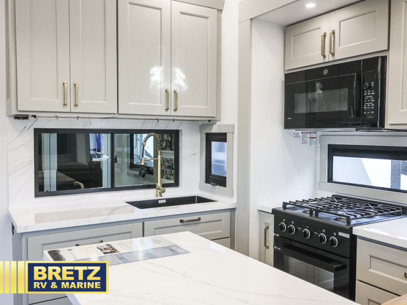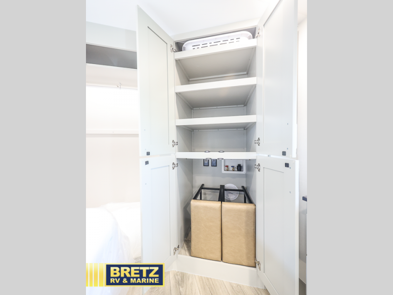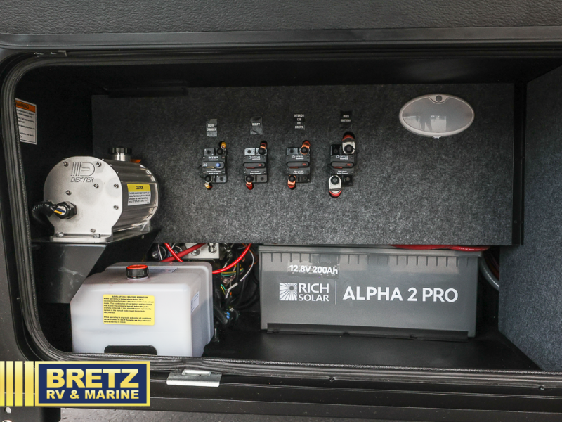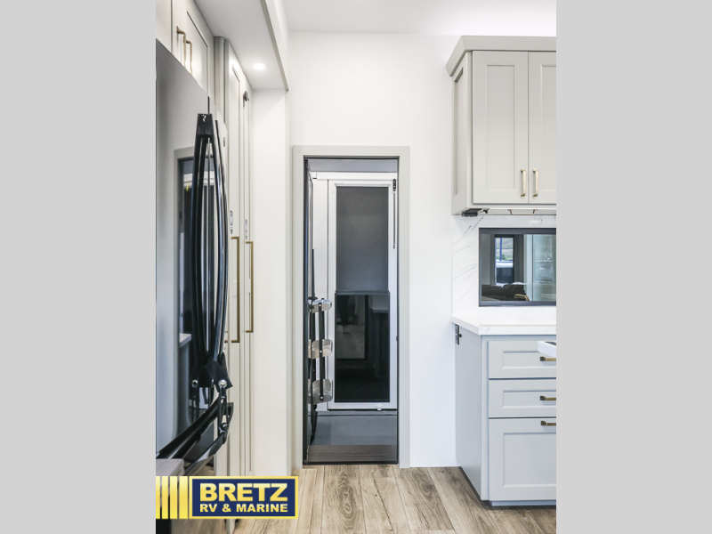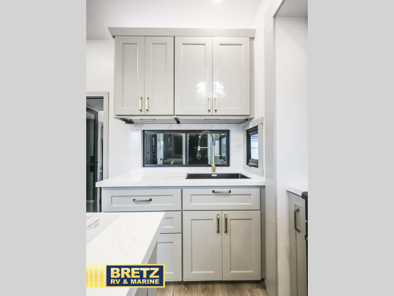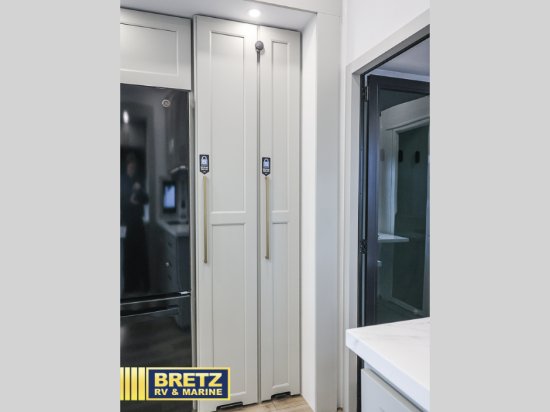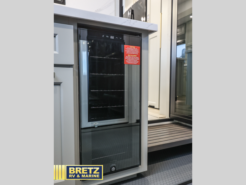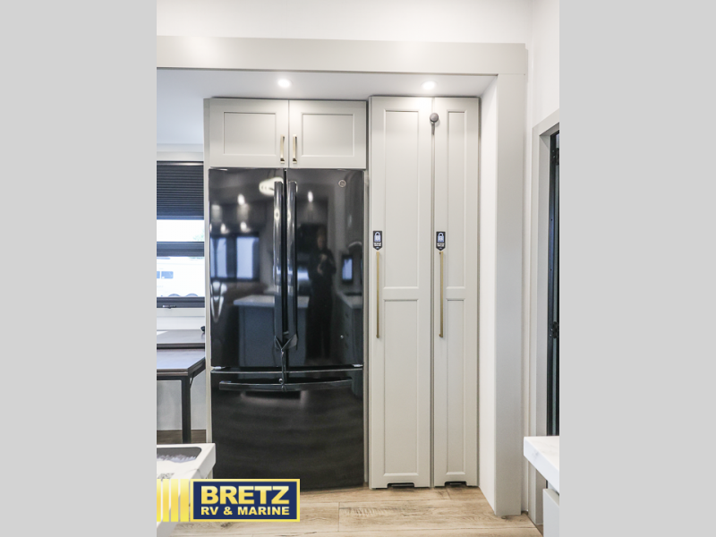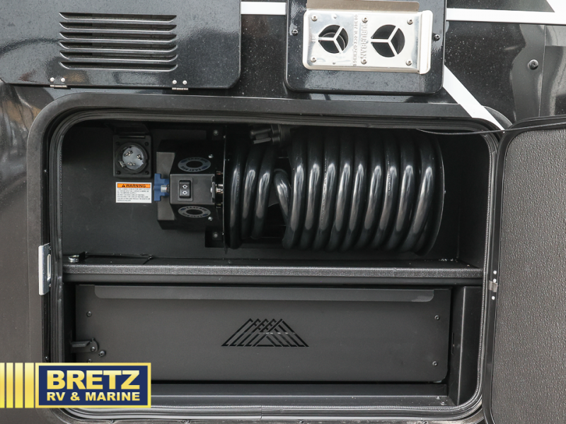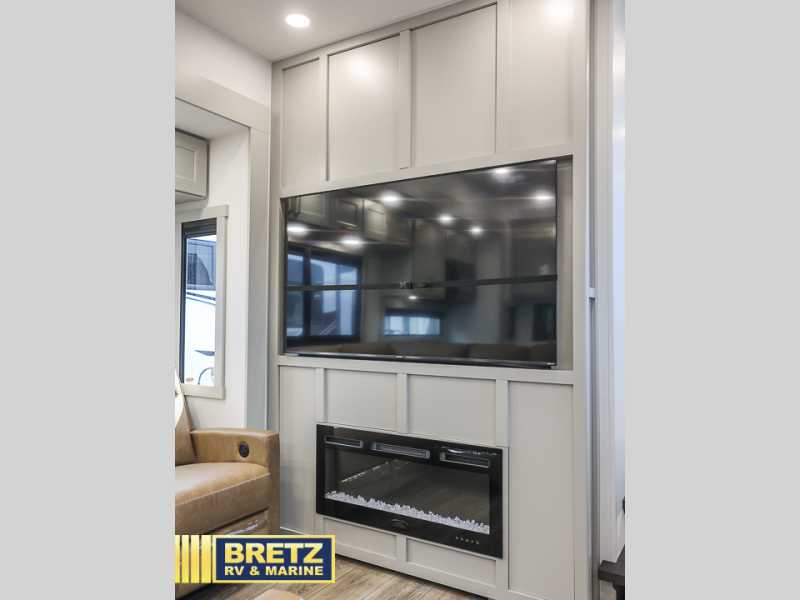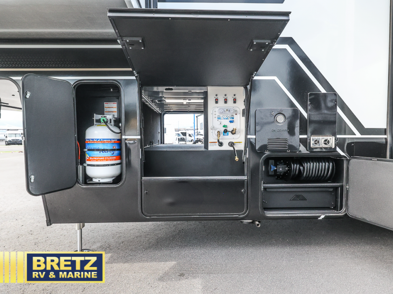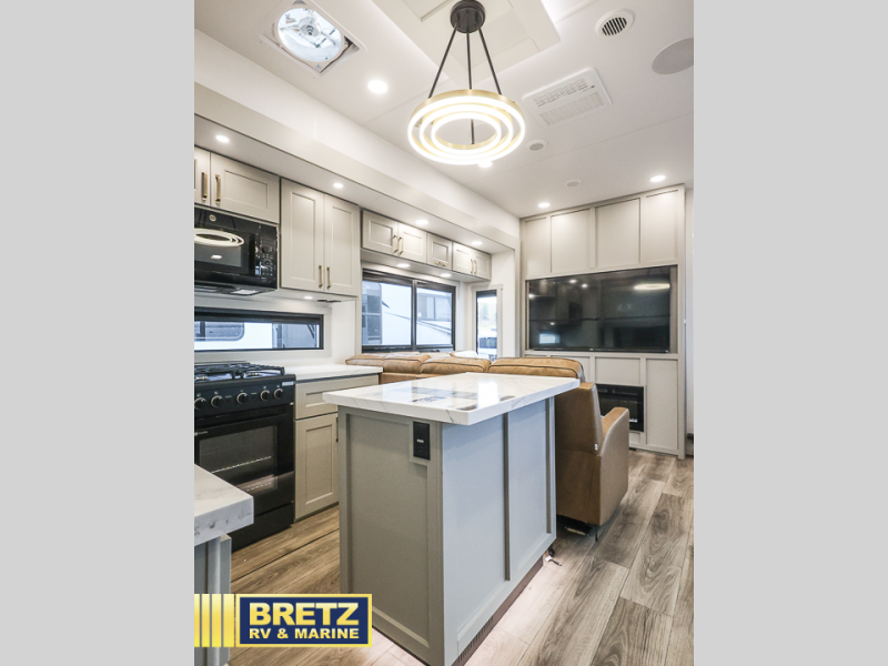 You can't imagine how much this toy hauler has to offer! The garage/outdoor kitchen/office space will allow you to utilize the garage how you need it, plus there is an adjustable tie-down system, as well as a loft for storage and a twin bed to sleep more campers! The garage patio with a 1,500 lb. capacity is another feature you are sure to love, especially with its own awning to keep you protected from the elements. Head to the kitchen to prepare meals with a 24" GE oven with a four burner range, a GE microwave with an air fryer, plus a spacious GE Energy Star 19 cu. ft. refrigerator. The island with two stools will let others visit with you while you cook, and there are even dog bowls to easily feed Frodo. You'll find the convertible dining table/L-desk will be accommodating since it can be use to dine at, and to get some work done. You may just find yourselves spending most of your time on the L-sofa in front of the entertainment center with a TV, fireplace and storage. A full bath is up front by the bedroom, and here you'll find a 30" x 42" shower and and pull-out linen storage with a trash bin to keep towels ready to use. After a day outdoors you'll love nothing more than coming back to your own bedroom with a king bed slide out, TV, a walk-in closet, and many more storage spaces. And we haven't even touched on the exterior features, like the 3-way pass-through storage, three power awnings, an air compressor to fill up tires, and the list goes on and on! This is a pre-production preview, all features and layout placement subject to change.