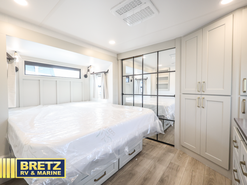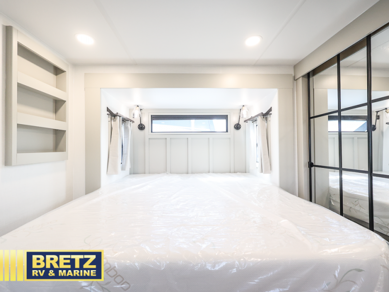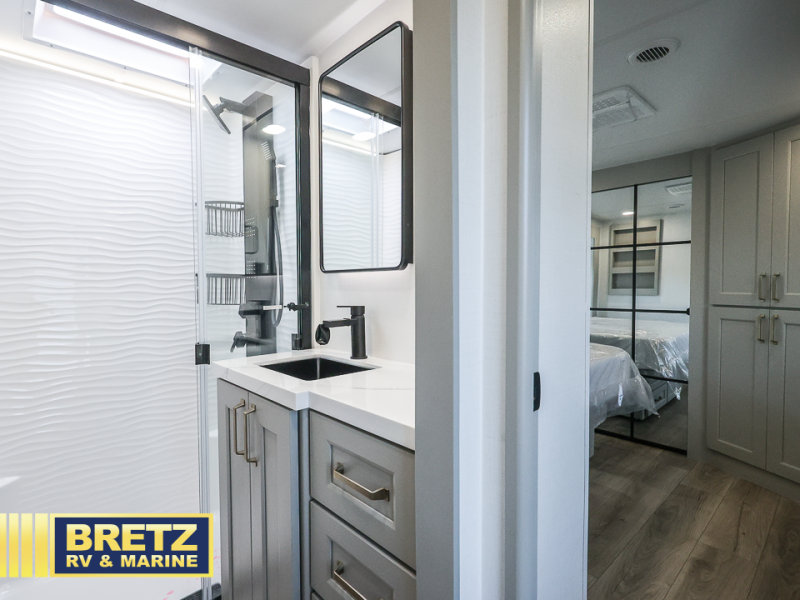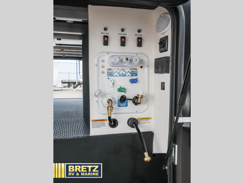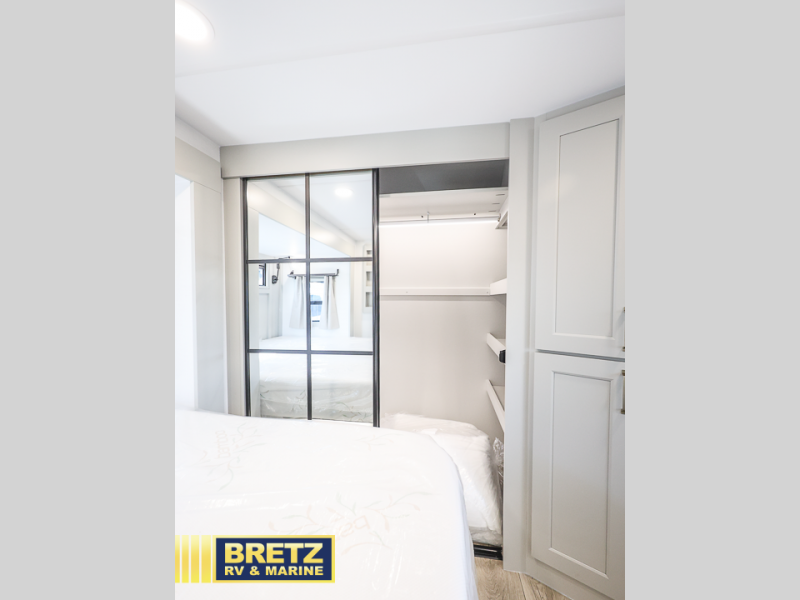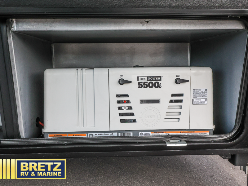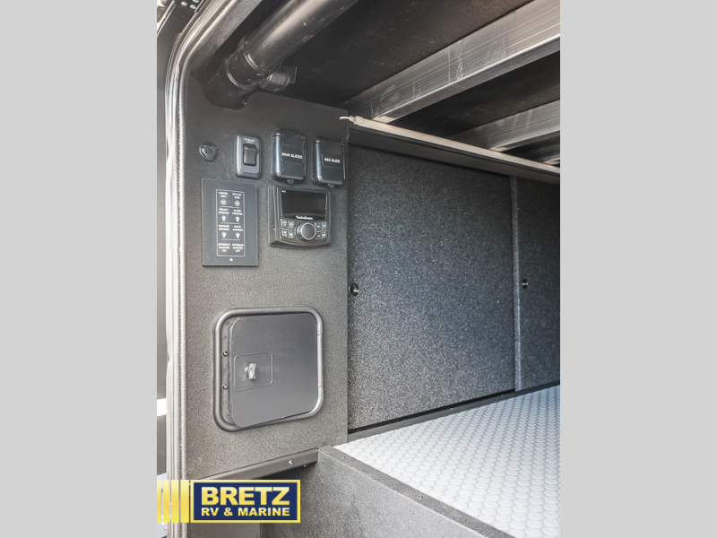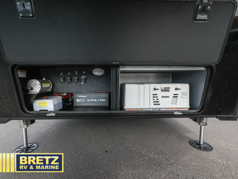 With any Model G toy hauler fifth wheel by Brinkley you will enjoy luxurious amenities, tons of storage space, and innovative features that have been developed and tested in the real world. Durable construction includes an industry leading PDI process, an industry best insulation package, and reinforced and walkable slide roofs. Some of the exterior features you'll find are a 3-way pass-through with a multi-functional flip-up bulkhead wall, under I-beam storage, a MAX-Vision reverse lighting system, and a low-maintenance roof to name a few. A Rockford Fosgate audio system comes standard, along with a Full app-based coach control system (iOS & Android) that lets you control your fifth wheel's functions right from your mobile device. You will find the solar system with a designated storage area to be ultra convenient, plus there is a FlexPower 5500 with a dual fuel inverter generator for all your power needs. Head inside to find a residential interior with Brinkley's CraftSense wood trim construction, floating entrance steps, integrated window screens and insulated blackout blinds, and residential solid surface countertops plus backsplash. You will also enjoy the neon shower lighting and recessed medicine cabinets in the bath, plus motion activated LED bed lights and dual bedside outlets in the bedroom. Choose a Model G toy hauler fifth wheel to experience all the luxury it has to offer!