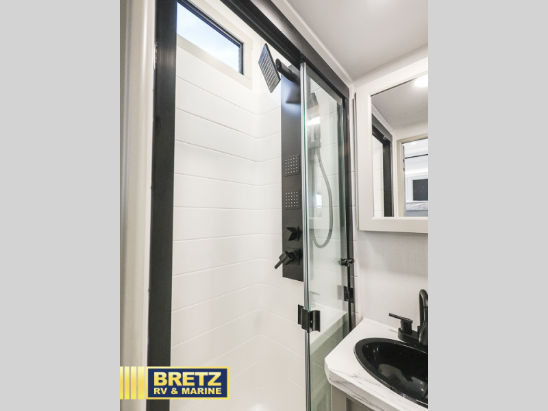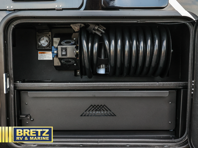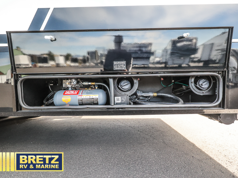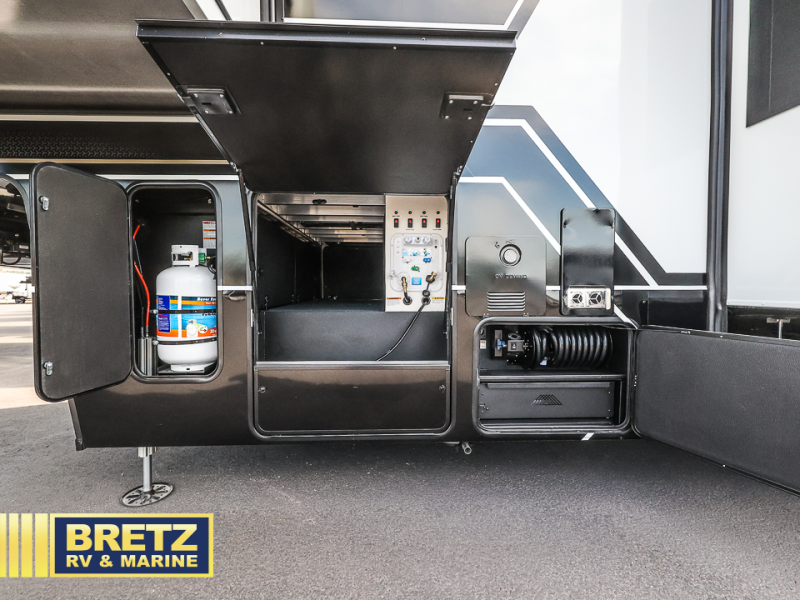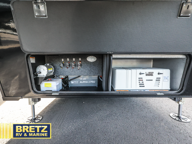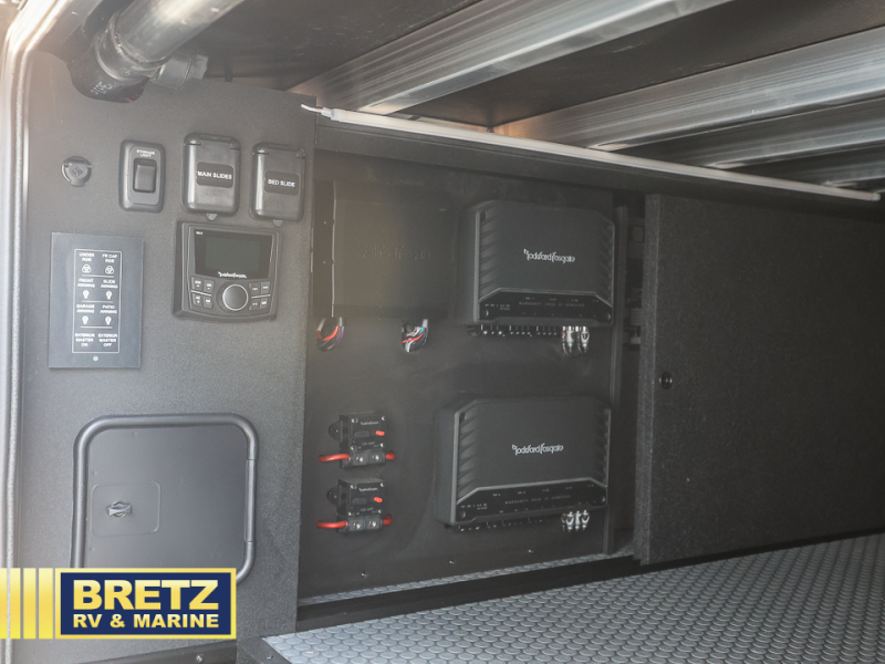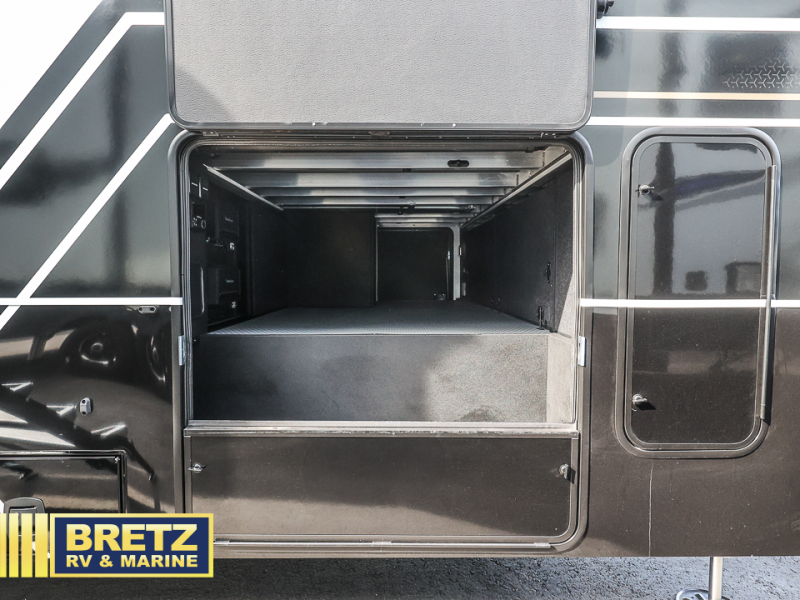 With any Model G toy hauler fifth wheel by Brinkley you will enjoy luxurious amenities, tons of storage space, and innovative features that have been developed and tested in the real world. Durable construction includes an industry leading PDI process, an industry best insulation package, and reinforced and walkable slide roofs. Some of the exterior features you'll find are a 3-way pass-through with a multi-functional flip-up bulkhead wall, under I-beam storage, a MAX-Vision reverse lighting system, and a low-maintenance roof to name a few. A Rockford Fosgate audio system comes standard, along with a OneControl app system that lets you control your fifth wheel's functions right from your mobile device. You will find the solar system with a designated storage area to be ultra convenient, plus there is a FlexPower 5500 with a dual fuel inverter generator for all your power needs. Head inside to find a residential interior with Brinkley's CraftSense wood trim construction, floating entrance steps, integrated window screens and insulated blackout blinds, and residential solid surface countertops plus backsplash. You will also enjoy the neon shower lighting and recessed medicine cabinets in the bath, plus motion activated LED bed lights and dual bedside outlets in the bedroom. Choose a Model G toy hauler fifth wheel to experience all the luxury it has to offer!