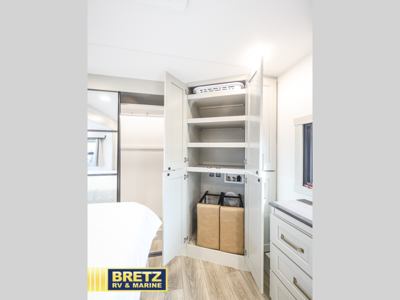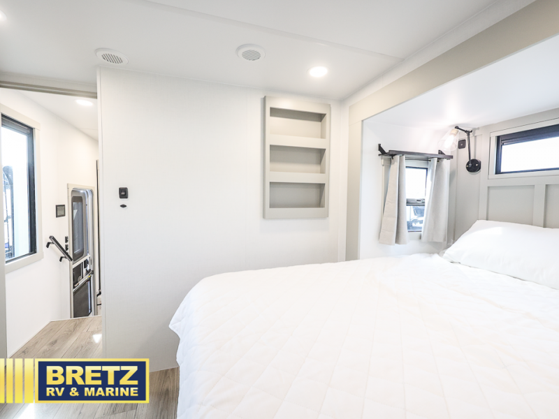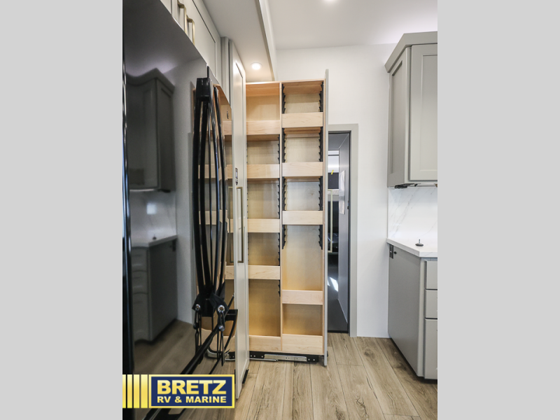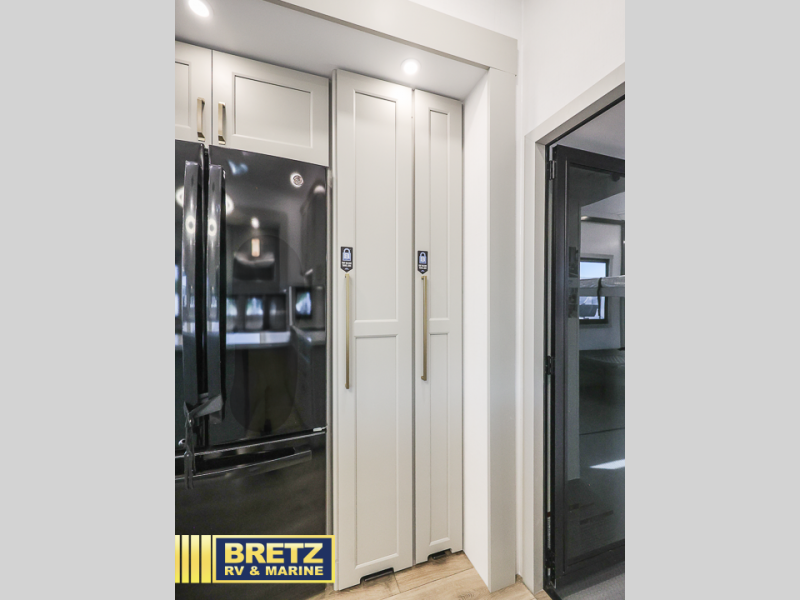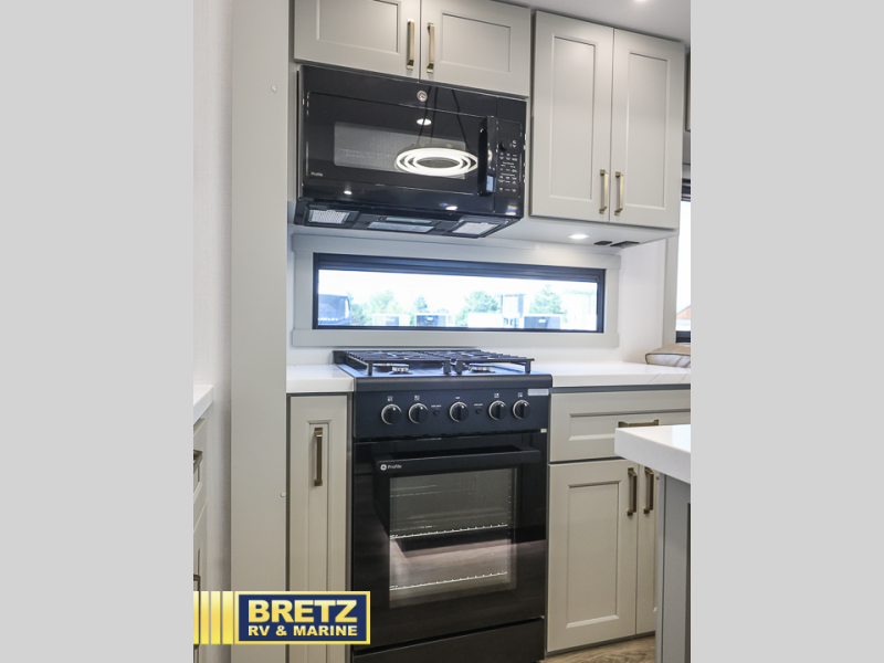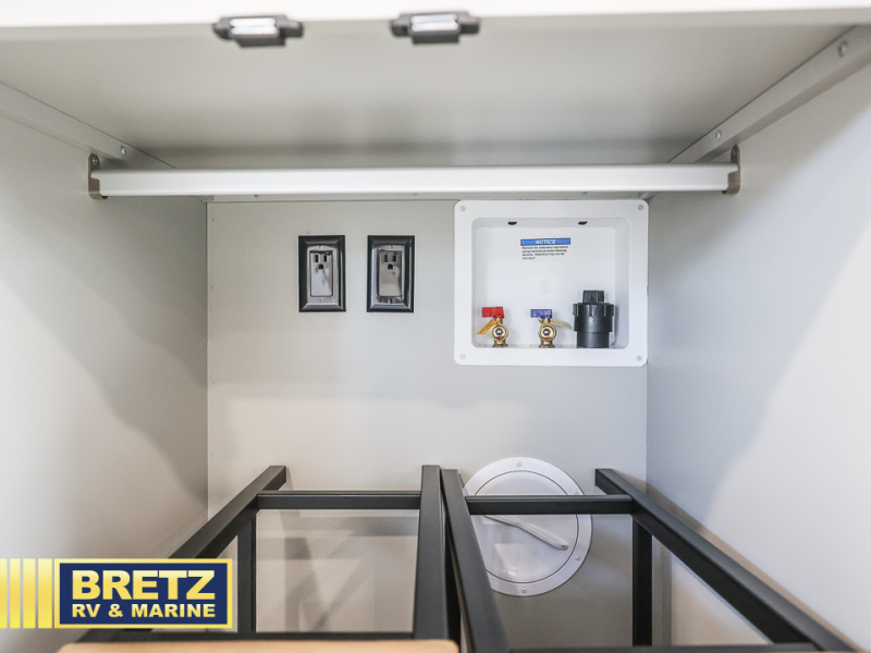 Whether you use this toy hauler to haul your favorite ride-on toys or as a mobile office, you're sure to love every inch of it! The 14' separate garage includes a Fold-N-Stow table and independent dual sofas, along with a full bath and a loft/storage with a twin bed for more sleeping space. The middle kitchen is every chef's dream with its GE appliances, kitchen island, and convenient features, such as pull-out trash bins and a cutting board, a pull-down knife rack and utensil tray, and a pull-out pantry/utility closet! Right next to the kitchen is the living room with a L-sofa with four modes, a 65" Phillips Smart TV and a fireplace, plus a convertible dining table/L-desk where you can dine or get some work done. You'll love the second full bath up front close to the private bedroom, and here, you'll find a king bed slide out, under-bed storage drawers and motion lights, a walk-in closet with cordless vacuum prep, and a sliding dresser top with hidden storage for valuables. There is also washer and dryer prep in the bedroom and garage, making this toy hauler full-time capable!