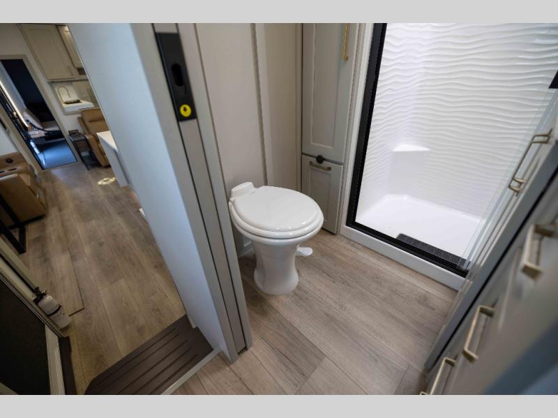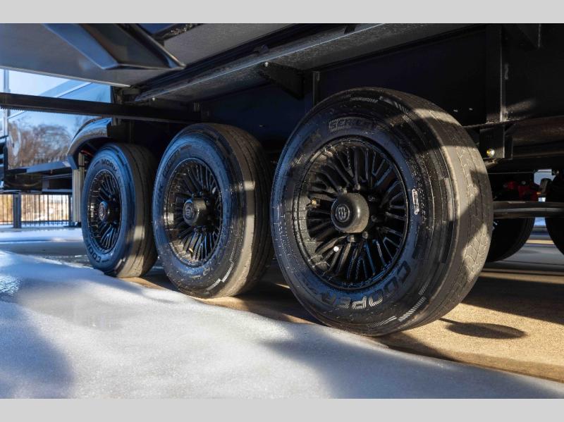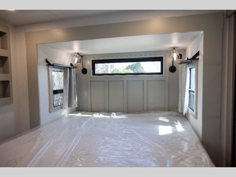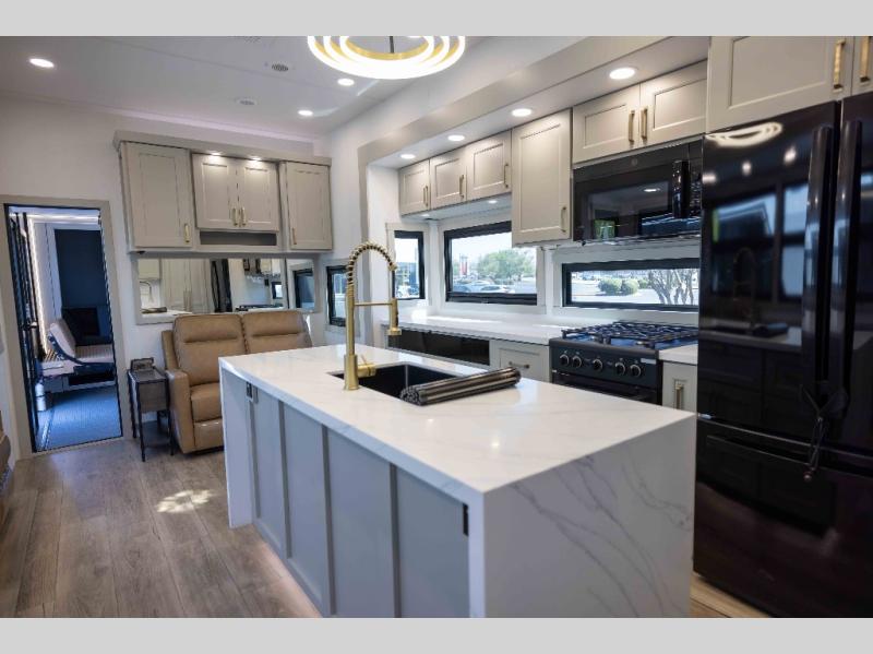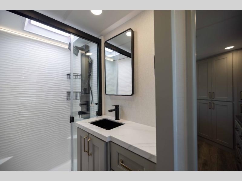 With any Model G toy hauler fifth wheel by Brinkley you will enjoy luxurious amenities, tons of storage space, and innovative features that have been developed and tested in the real world. Durable construction includes an industry leading PDI process, an industry best insulation package, and reinforced and walkable slide roofs. Some of the exterior features you'll find are a 3-way pass-through with a multi-functional flip-up bulkhead wall, under I-beam storage, a MAX-Vision reverse lighting system, and a low-maintenance roof to name a few. A Rockford Fosgate audio system comes standard, along with a OneControl app system that lets you control your fifth wheel's functions right from your mobile device. You will find the solar system with a designated storage area to be ultra convenient, plus there is a FlexPower 5500 with a dual fuel inverter generator for all your power needs. Head inside to find a residential interior with Brinkley's CraftSense wood trim construction, floating entrance steps, integrated window screens and insulated blackout blinds, and residential solid surface countertops plus backsplash. You will also enjoy the neon shower lighting and recessed medicine cabinets in the bath, plus motion activated LED bed lights and dual bedside outlets in the bedroom. Choose a Model G toy hauler fifth wheel to experience all the luxury it has to offer!