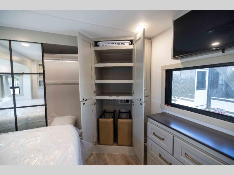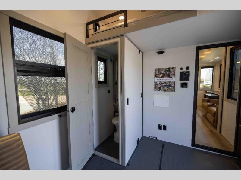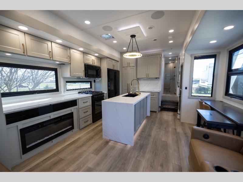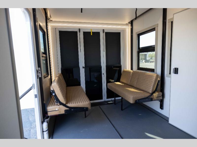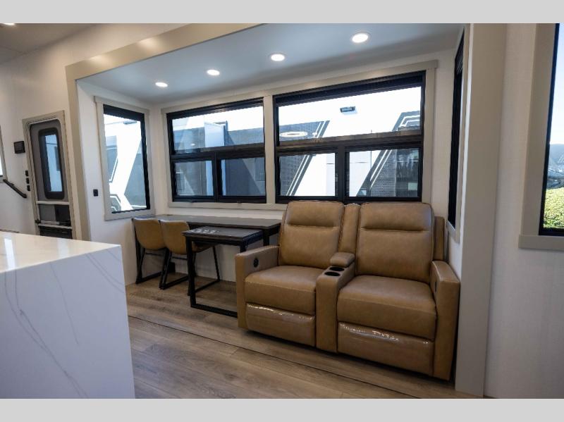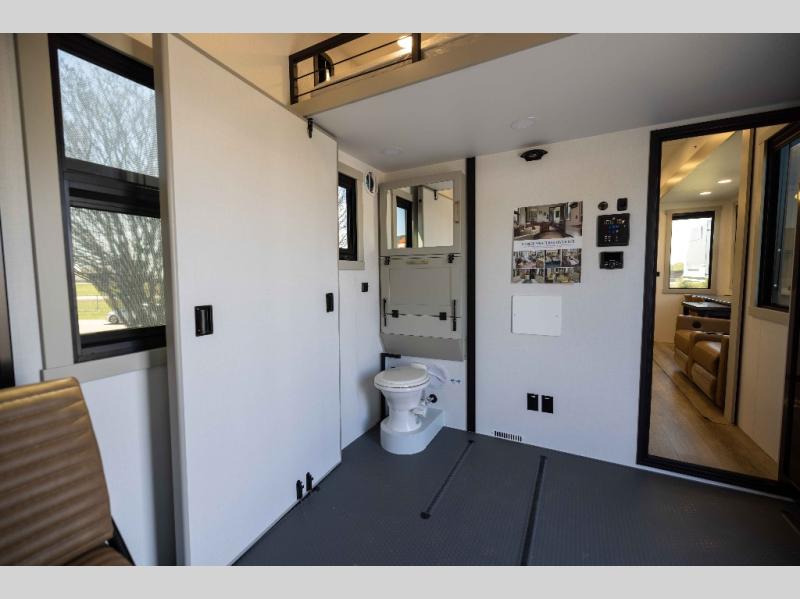 The front bedroom is a serene retreat, featuring a plush king bed, spacious walk-in closet, 32” smart TV, sliding dresser top, and hidden storage for better organization.The bathroom is a haven of convenience, boasting a full bathroom with pull-out linen and trash bin, and a spacious 30 x 42 shower. Perfect for freshening up after a long day of adventure! The kitchen has a pantry featuring adjustable shelving, a hutch, 19 cu. refrigerator, microwave, four-burner cooktop, kitchen island, and convertible dining table/L-desk. Plus, pet bowls for your furry friends! Gather with family and friends in the living room, which features a dual sofa with two recliners, each with heat and massage functions, a televator, and a cozy fireplace. It's the perfect spot to relax and unwind! The garage has a half bathroom, two sofas, and a 43” smart TV, ideal for game days, movie nights, or just relaxing with friends. Outside, enjoy the convenience of a fuel station, three-way pass-thru storage, and LP quick connect. Whether you're an adventure-seeker, or just love to travel in style, this toy hauler has everything you need and more!